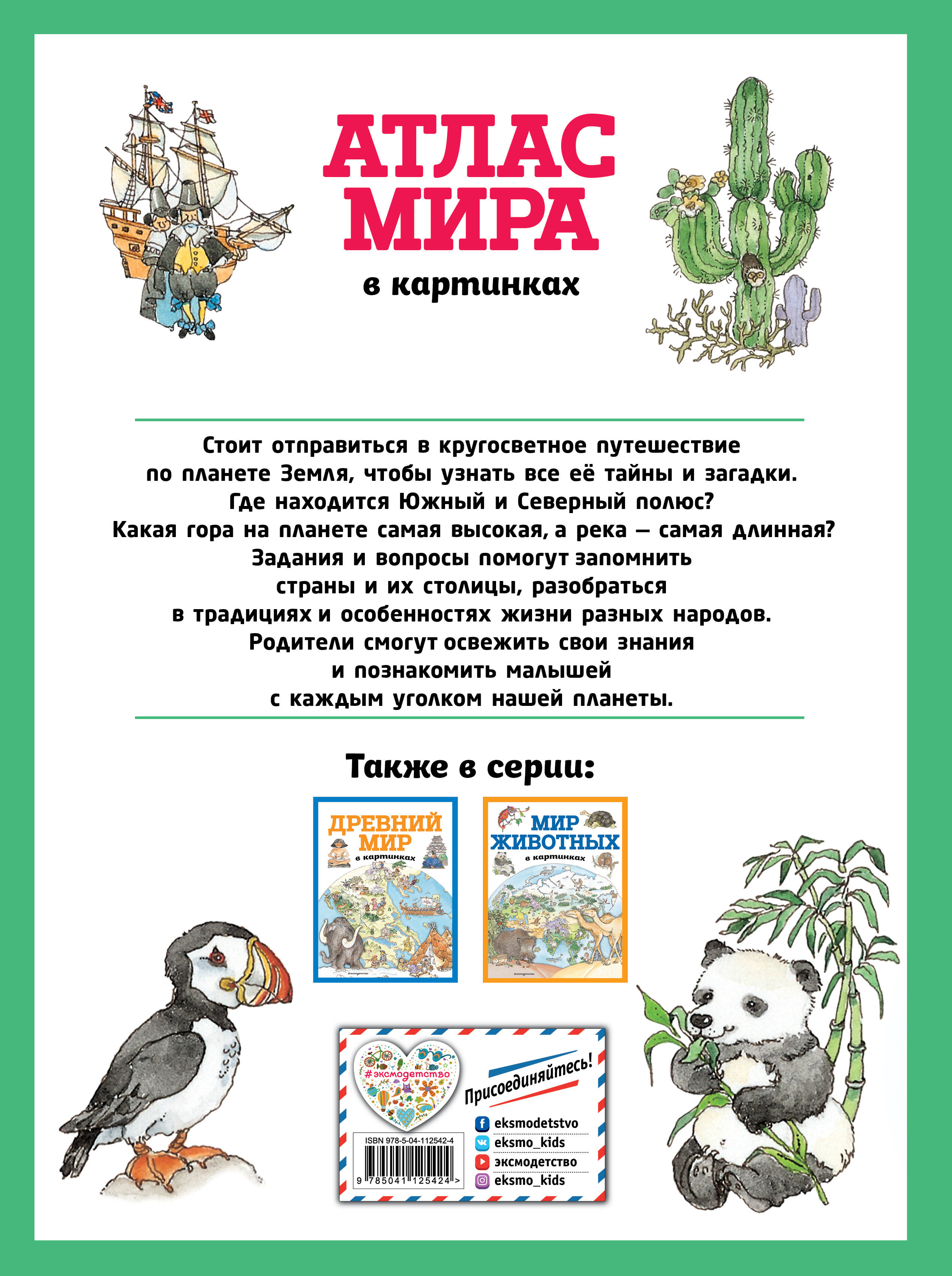 «Атлас мира в картинках» дает возможность наглядно и образно получить первые знания о географии Земли, странах и континентах, природных зонах и особенностях жизни различных регионов планеты. Интересные факты об обычаях и традициях разных стран обязательно заинтересуют маленьких читателей. Краткие тексты предоставляют самую важную информацию, а насыщенные деталями картинки и карты помогут дополнить ее новыми сведениями. Любой дошкольник легко самостоятельно разберется в новой для него теме и порадует родителей глубокими знаниями. Книга включает элемент игры. Необходимо ответить на вопросы викторины, которая поможет запомнить названия стран и их столиц. Детализированные картинки любопытно рассматривать, и, включив воображение, ребенок легко придумает историю для каждого из многочисленных героев книги.| Издательство | ООО "Издательство "Эксмо" |