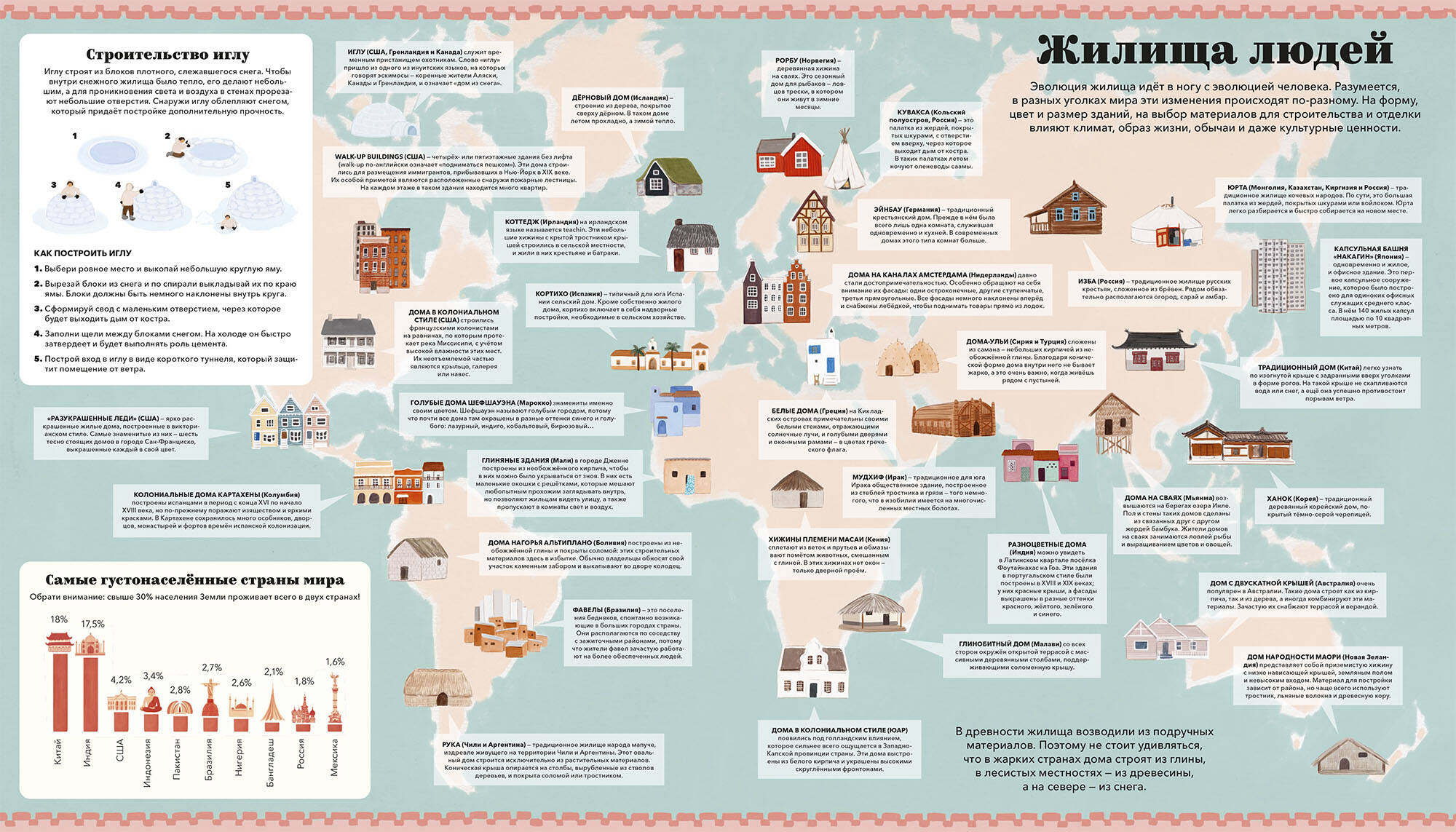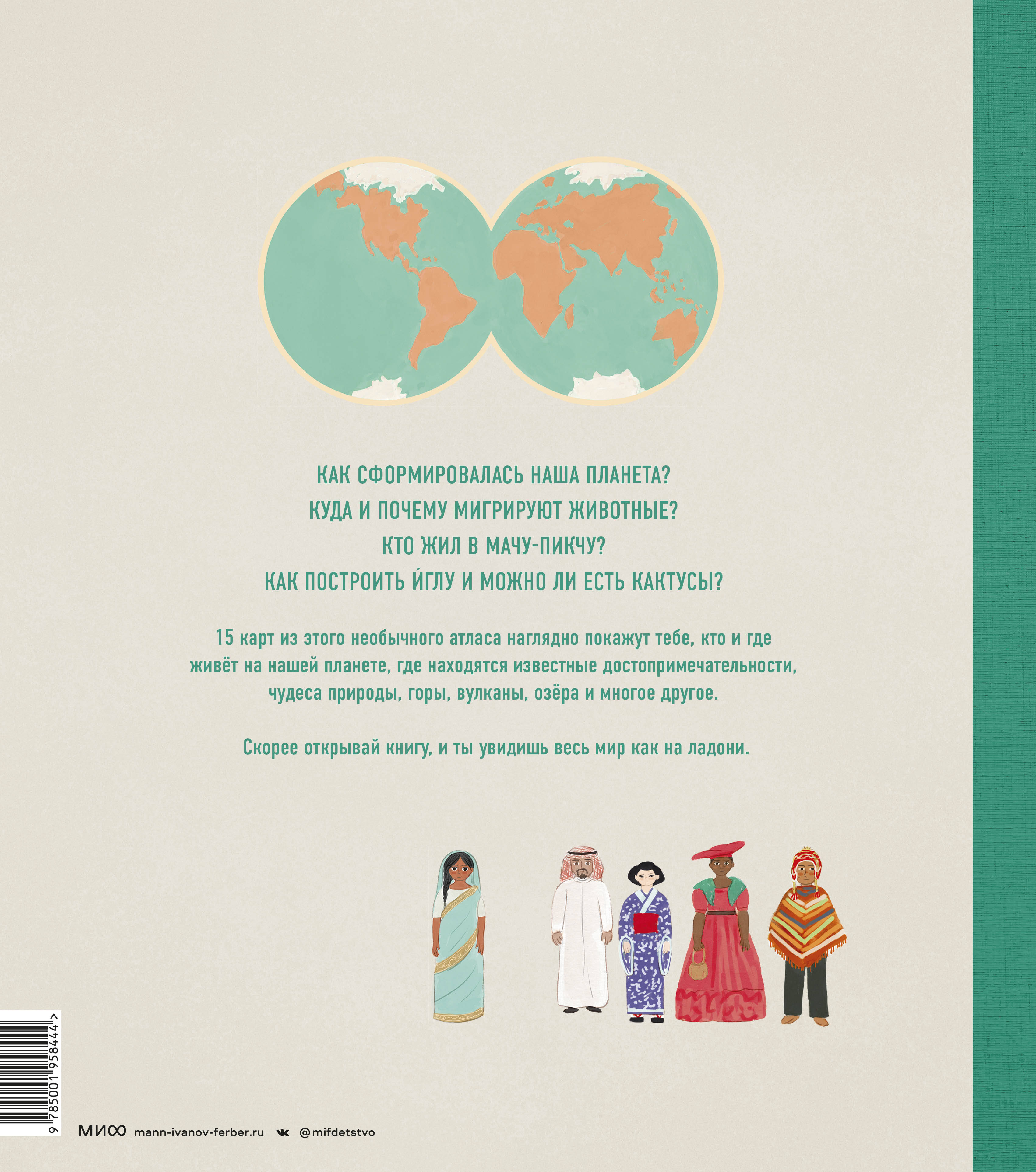Перед вами самый большой и интересный атлас мира. В нем 15 огромных карт, на каждой из которых наглядно показано, как сформировалась наша планета, кто и где на ней живет, чем питается, на каких языках говорит, какую носит одежду и какие отмечает праздники. Рядом с картами приводятся интересные и разнообразные факты. Вы узнаете, какие горы, водоемы, чудеса природы и достопримечательности существуют на Земле. А еще выясните, почему некоторые животные ежегодно преодолевают сотни километров и стремятся вдаль от родных мест, кто жил в древнем Мачу-Пикчу, почему в Мертвом море нельзя нырять и даже как построить иглу! Фишки книги: - Атлас мира покажет и расскажет, как сформировалась наша планета, кто на ней живет и что на ней растет - В конце книги вас ждет активити-задание. Сможете его выполнить, не подглядывая в ответы? :) - Если вы хотите дать ребенку общее представление о многообразии окружающего мира, этот атлас - та самая книга, которая вам необходима - Все факты в книге проверены научным редактором портала Антропогенез.ру - Книга большого формата. Идеально подойдет для подарка маленьким первооткрывателям| Издательство | МАНН, ИВАНОВ И ФЕРБЕР ООО |
