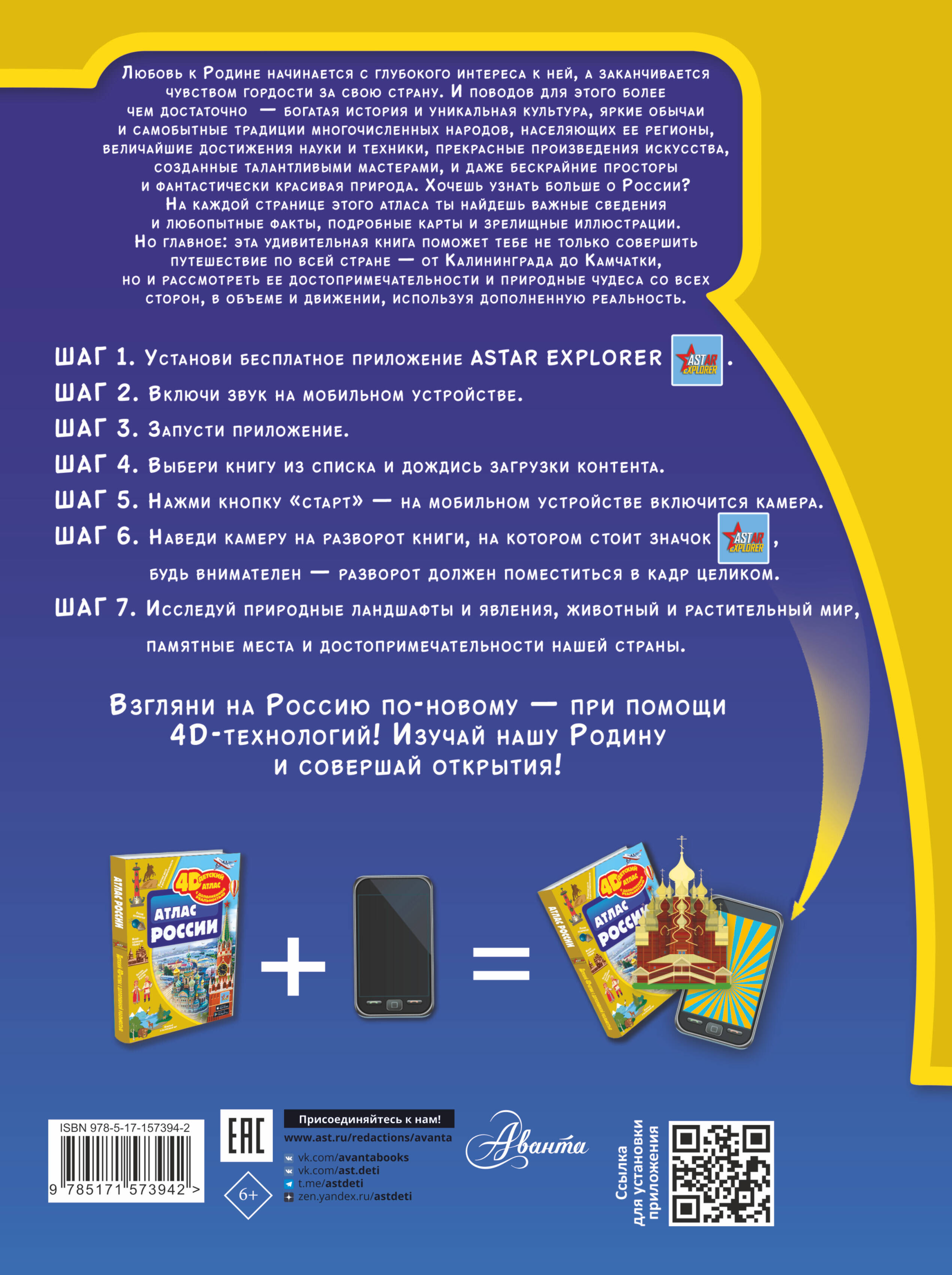 Этот уникальный атлас с дополненной реальностью предлагает любознательным ребятам совершить незабываемое путешествие по нашей необъятной Родине - от Калининграда до Камчатки. Вы сможете узнать много нового о городах и их достопримечательностях, о заповедных уголках природы и загадочных природных явлениях, о чудесах и бессмертных творениях, созданных трудом и талантом выдающихся мастеров этой великой страны. Сделать знакомство с Россией познавательным и интересным, полным приключений и открытий помогут наглядные карты и красочные иллюстрации, важные сведения и любопытные факты. Но главное: полюбоваться потрясающими природными ландшафтами в крупнейших заповедниках и национальных парках страны, уютными улицами и широкими площадями городов, величественными памятниками древней архитектуры и грандиозными современными сооружениями, знаменитыми скульптурами и мемориальными комплексами, оценить масштаб достижений отечественной науки и техники можно будет в цвете, объеме и движении, а также прослушать звукозаписи с любопытной информацией о каждом из представленных объектов. Для этого необходимо лишь скачать бесплатное приложение ASTAR EXPLORER на мобильное устройство, настроить его и действовать согласно инструкции. Для среднего школьного возраста.| Издательство | ИЗДАТЕЛЬСТВО "АСТ" |