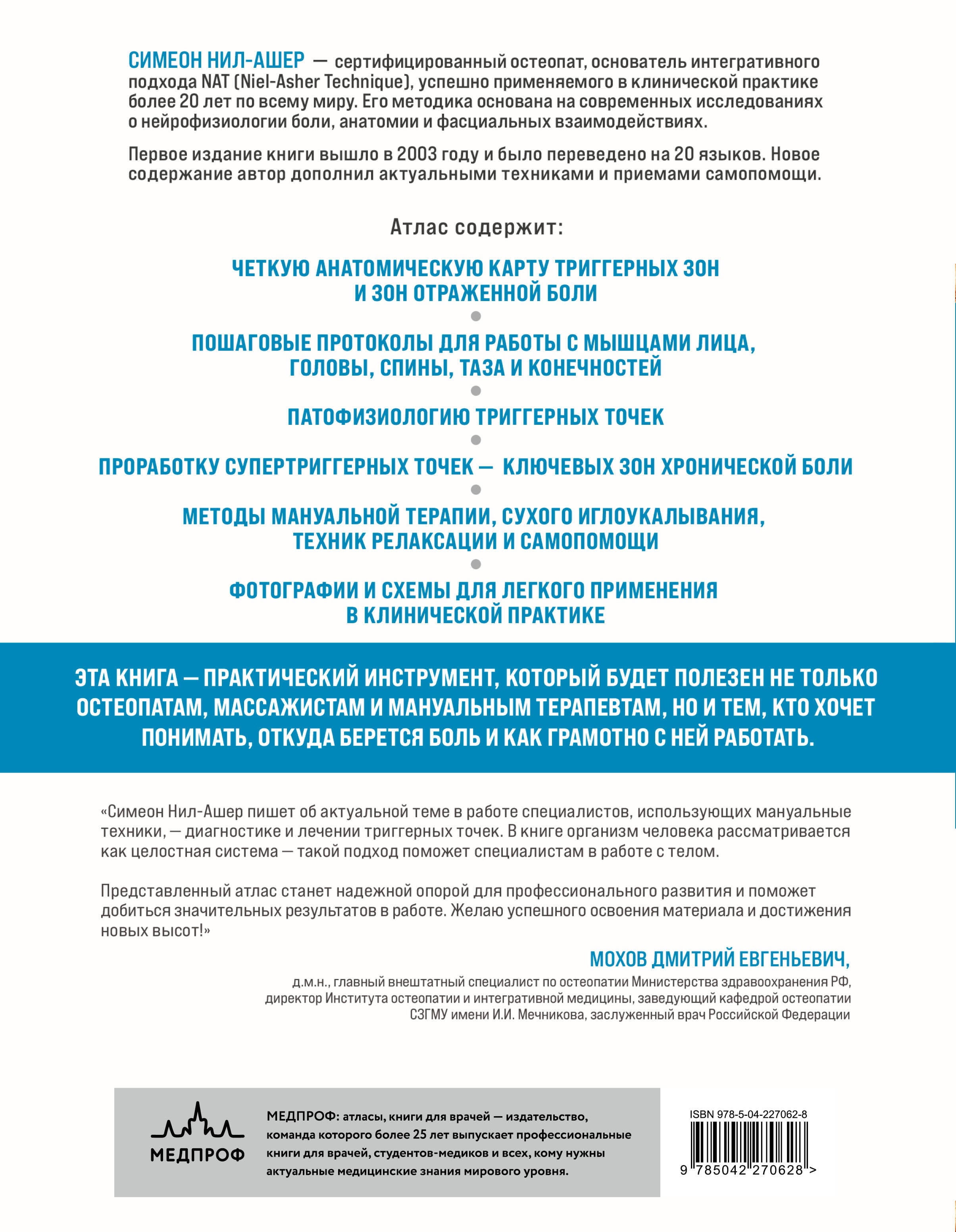 Триггерные точки - одна из ключевых причин острой и хронической миофасциальной боли. По оценкам экспертов, они участвуют в развитии 75-95% болевых синдромов и нередко сопровождаются отеками, головокружением, нарушениями осанки и сна. В книге ведущего британского остеопата Симеона Нил-Ашера представлен структурированный, клинически проверенный подход к диагностике и терапии миофасциальной боли. Его методика применяется по всему миру и переиздана более чем на 20 языках. Атлас содержит четкие алгоритмы поиска и устранения триггерных точек; практические протоколы для работы с различными зонами тела; рекомендации по домашней самопомощи для пациентов. Идеально подходит специалистам, использующим мануальные техники.| Издательство | ООО "Издательство "Эксмо" |