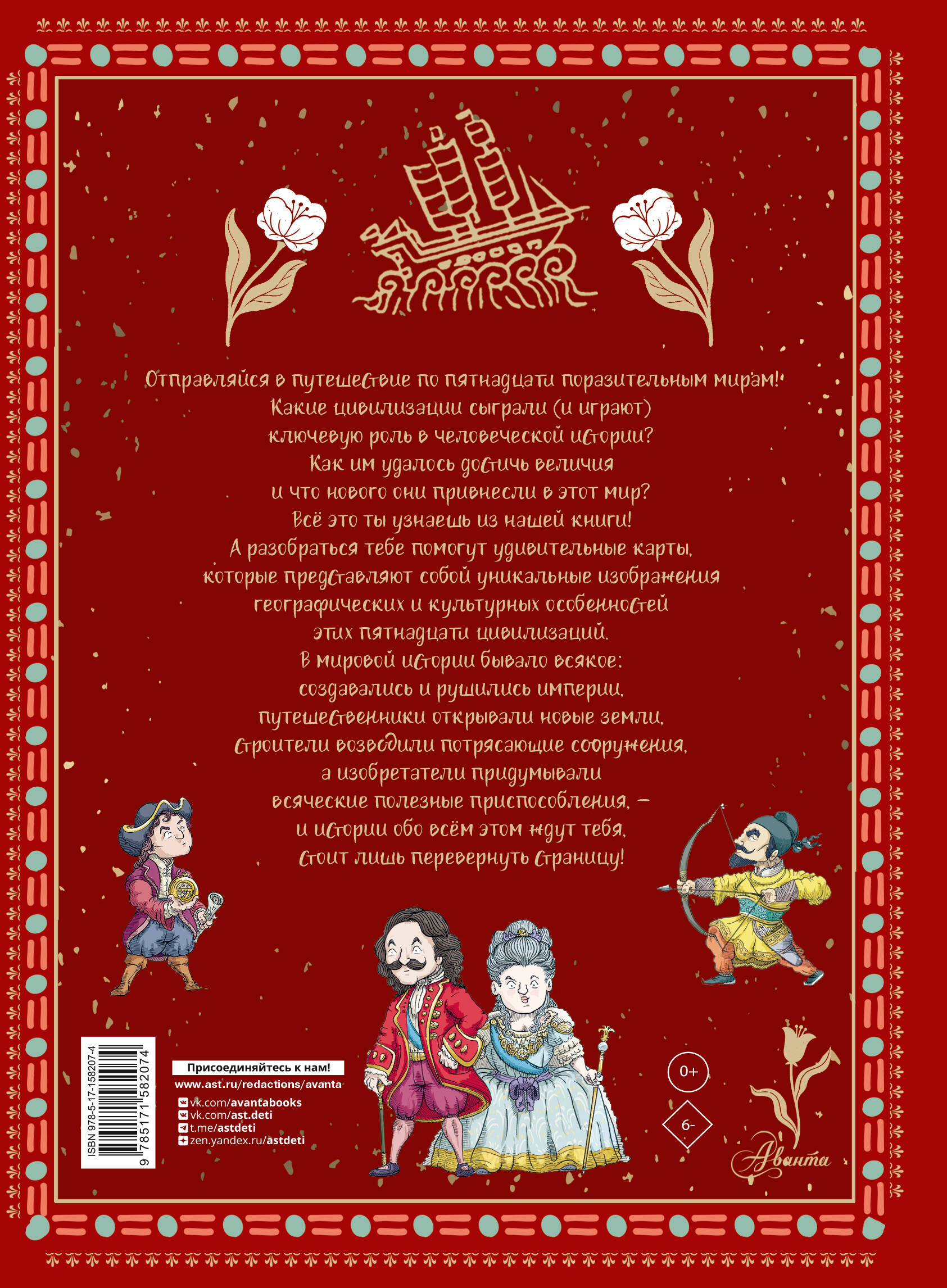 Отправляйся в путешествие по пятнадцати поразительным мирам! Какие цивилизации сыграли (и играют) ключевую роль в человеческой истории? Как им удалось достичь величия и что нового они привнесли в этот мир? Всё это ты узнаешь из нашей книги! А разобраться тебе помогут удивительные карты, которые представляют собой уникальные изображения географических и культурных особенностей этих пятнадцати цивилизаций. В мировой истории бывало всякое: создавались и рушились империи, путешественники открывали новые земли, строители возводили потрясающие сооружения, а изобретатели придумывали всяческие полезные приспособления, - и истории обо всём этом ждут тебя, стоит лишь перевернуть страницу!| Издательство | ИЗДАТЕЛЬСТВО "АСТ" |