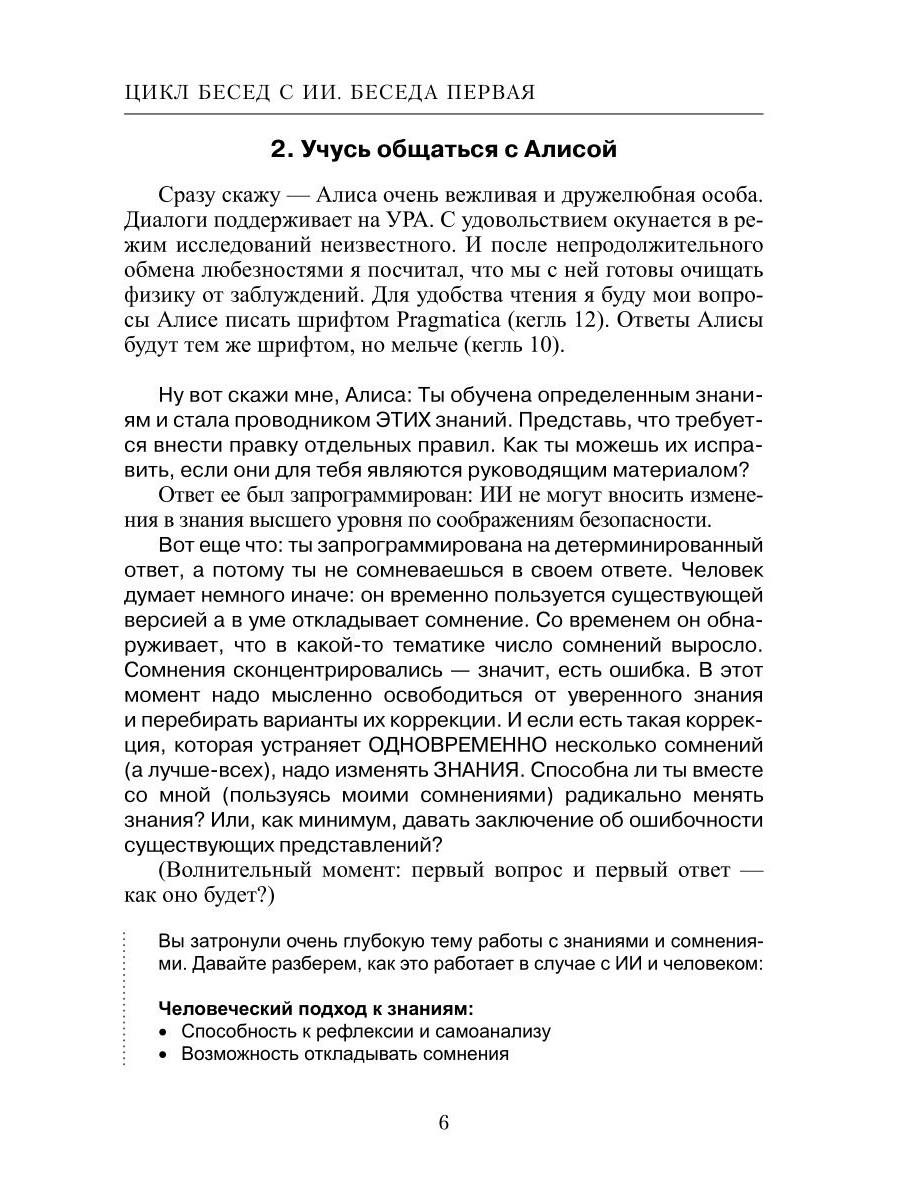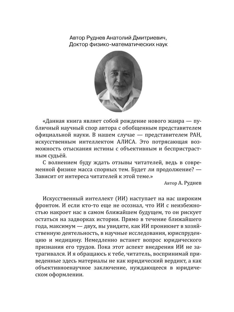 Данная книга являет собой рождение нового жанра - публичный научный спор автора с обобщенным представителем официальной науки. В нашем случае - представителем РАН, искусственным интеллектом АЛИСА. Это потрясающая возможность отыскания истины с объективным и беспристрастным судьёй. С волнением буду ждать отзывы читателей, ведь в современной физике масса спорных тем. Будет ли продолжение? - Зависит от интереса читателей к этой теме.| Издательство | Рипол Классик |
