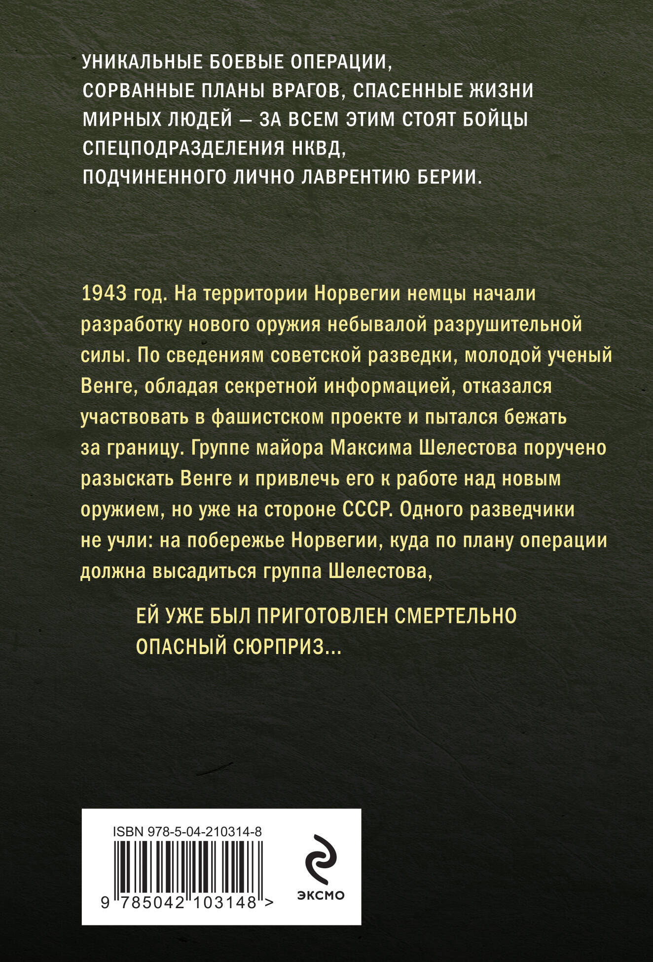 Роман о военном времени, о сложных судьбах и опасной работе неизвестных героев, вошедших в ударный состав «спецназа Берии». 1943 год. На территории Норвегии немцы начали разработку нового оружия небывалой разрушительной силы. По сведениям советской разведки, молодой ученый Венге, обладая секретной информацией, отказался участвовать в фашистском проекте и пытался бежать за границу. Группе майора Максима Шелестова поручено разыскать Венге и привлечь его к работе над новым оружием, но уже на стороне СССР. Одного разведчики не учли: на побережье Норвегии, куда по плану операции должна высадиться группа Шелестова, ей уже был приготовлен смертельно опасный сюрприз... «Эта серия хороша тем, что в ней проведена верная главная мысль: в НКВД Лаврентия Берии умели верить людям, потому что им умел верить сам нарком. История группы майора Шелестова сходна с реальной историей крупного агента абвера, бывшего штабс-капитана царской армии Нелидова, попавшего на Лубянку в сентябре 1939 года. Тем более вероятными выглядят на фоне истории Нелидова приключения Максима Шелестова и его товарищей, описанные в этом романе». - С. Кремлев Общий тираж книг А. Тамоникова - более 10 миллионов экземпляров.| Издательство | ООО "Издательство "Эксмо" |