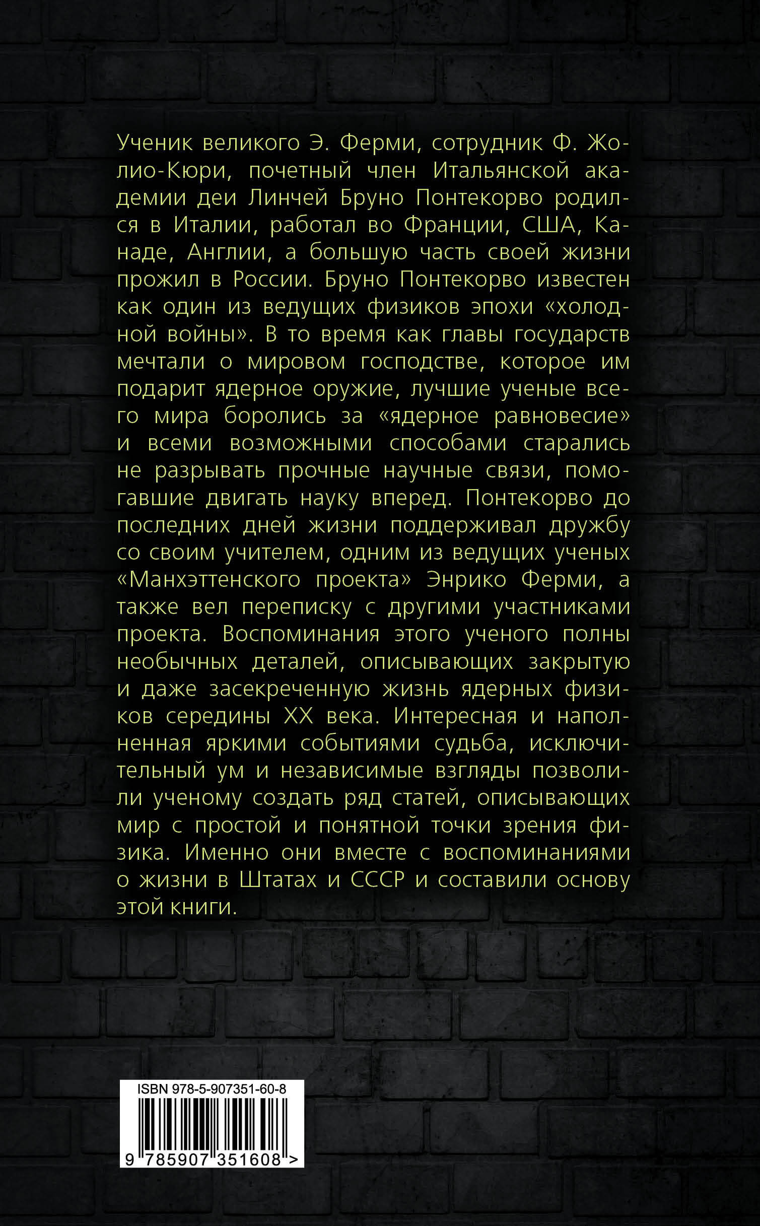 Ученик великого Э. Ферми, сотрудник Ф. Жолио-Кюри, почетный член Итальянской академии деи Линчей Бруно Понтекорво родился в Италии, работал во Франции, США, Канаде, Англии, а большую часть своей жизни прожил в России. Бруно Понтекорво известен как один из ведущих физиков эпохи «холодной войны». В то время, как главы государств мечтали о мировом господстве, которое им подарит ядерное оружие, лучшие ученые всего мира боролись за «ядерное равновесие» и всеми возможными способами старались не разрывать прочные научные связи, помогавшие двигать науку вперед. Понтекорво до последних дней жизни поддерживал дружбу со своим учителем, одним из ведущих ученых «Манхэттенского проекта» Энрико Ферми, а также вел переписку с другими участниками проекта. Воспоминания этого ученого полны необычными деталями, описывающими закрытую и даже засекреченную жизнь ядерных физиков середины ХХ века. Интересная и наполненная яркими событиями судьба, исключительный ум и независимые взгляды позволили ученому создать ряд статей, описывающих мир с простой и понятной точки зрения физика. Именно они, вместе с воспоминаниями о жизни в Штатах и СССР, и составили основу этой книги.| Издательство | Родина Издательство ООО |