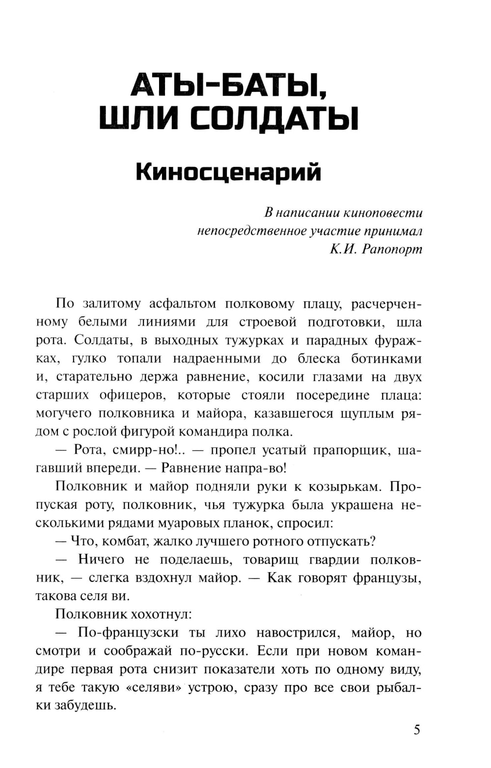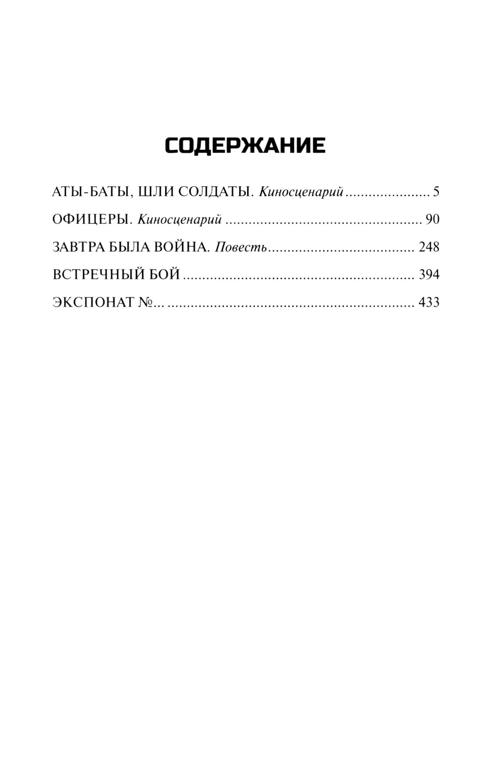 Повесть Бориса Васильева «Аты-баты, шли солдаты» - о том, как в 1944 году восемнадцать молодых ребят - комсомольский взвод - героически остановили колонну немецких танков и все погибли... В сборник также включены другие пронзительные произведения автора, ставшие классикой военной прозы: «Офицеры», «Завтра была война», «Встречный бой» и «Экспонат №».| Издательство | Вече |