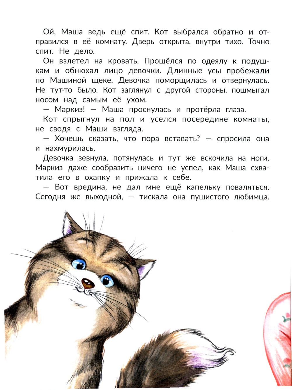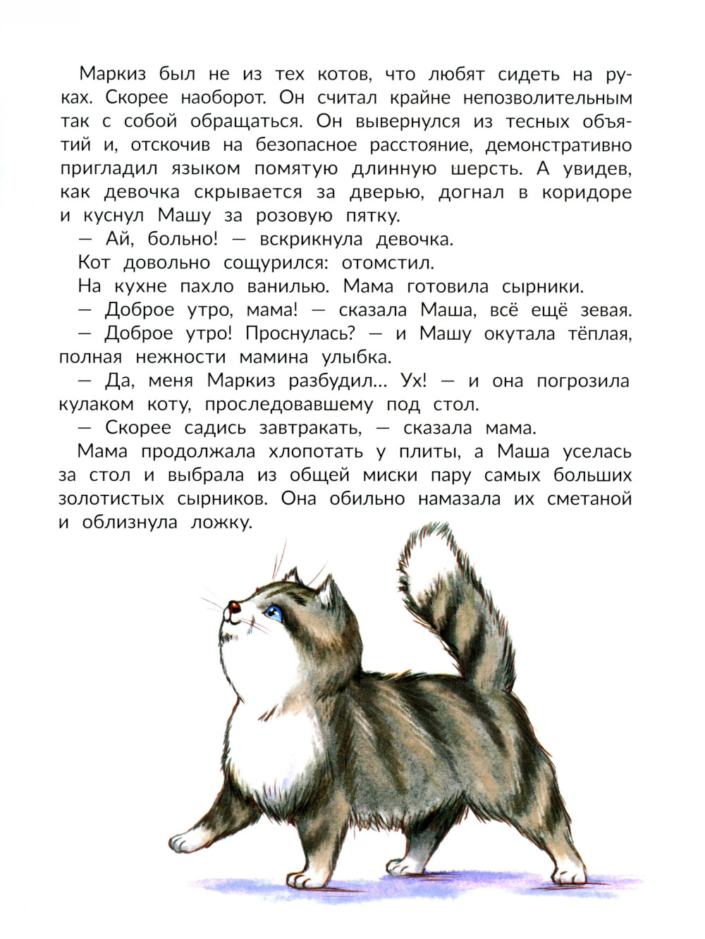 У Маши есть кот. Но Маркиз из тех котов, которые скорее укусят, чем будут сидеть на руках. Пусть Маша только попробует сгрести его в охапку, он непременно отомстит. Весной наши герои отправляются на дачу, где уже проклюнулась молодая трава, а солнце местами припекает, словно летом. Маша с родителями убирают дом после зимы, а Маркиз по-хозяйски обходит окрестности. Из-за своего любопытства Маркиз попадает в ловушку: оказывается запертым в сарае на соседском участке. Хозяева вынуждены вернуться в город без него. Маша переживает за своего любимца и мечтает снова его обнять, а кот хочет скорее очутиться в её объятиях. Кто поможет им встретиться?| Издательство | Феникс |
