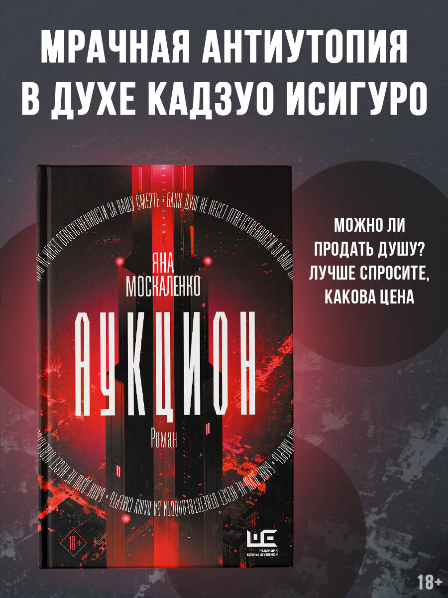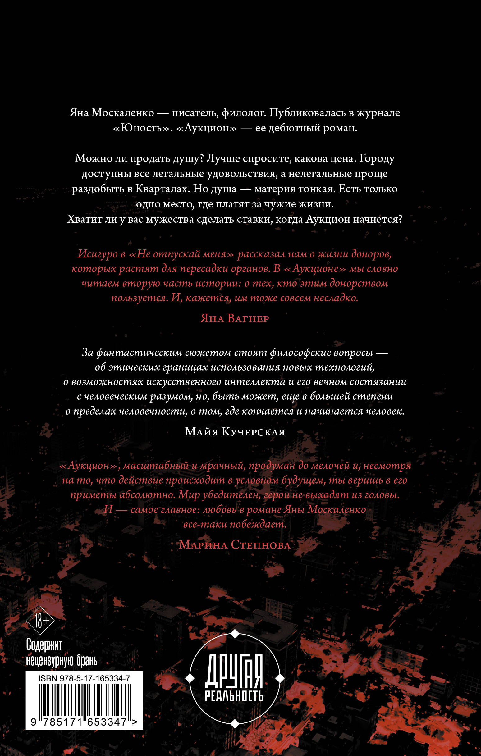 «Банк Душ не несет ответственности за вашу смерть». Грандиозный дебютный роман в серии «Другая реальность». Захватывающая история о цене и последствиях открытия, рассказанная от лица ученого. Мрачная антиутопия в духе романа «Не отпускай меня» Кадзуо Исигуро. Яна Москаленко - писатель, филолог. Публиковалась в журнале «Юность». «Аукцион» - ее дебютный роман. Можно ли продать душу? Лучше спросите, какова цена. Городу доступны все легальные удовольствия, а нелегальные проще раздобыть в Кварталах. Но душа - материя тонкая. Есть только одно место, где покупают чужие жизни. Хватит ли у вас мужества сделать ставки, когда Аукцион начнется? «Исигуро в "Не отпускай меня" рассказал нам о жизни доноров, которых растят для пересадки органов. В "Аукционе" мы словно читаем вторую часть истории: о тех, кто этим донорством пользуется. И, кажется, им тоже совсем несладко». Яна Вагнер «За фантастическим сюжетом стоят философские вопросы - об этических границах использования новых технологий, о возможностях искусственного интеллекта и его вечном состязании с человеческим разумом, но, быть может, еще в большей степени о пределах человечности, о том, где кончается и начинается человек». Майя Кучерская «"Аукцион", масштабный и мрачный, продуман до мелочей и несмотря на то, что действие происходит в условном будущем, ты веришь в его приметы абсолютно. Мир убедителен, герои не выходят из головы. И - самое главное: любовь в романе Яны Москаленко все-таки побеждает». Марина Степнова С этой книгой ищут: антиутопия, русская проза, Редакция Елены Шубиной, роман, другая реальность, фантастика, молодая проза, аукцион,| Издательство | Издательство "АСТ" |