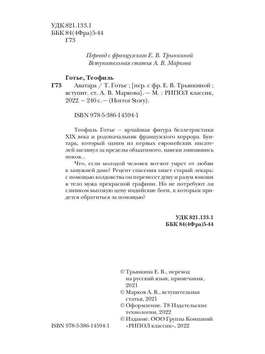 Теофиль Готье - ярчайшая фигура беллетристики XIX века и родоначальник французского хоррора. Бунтарь, который одним из первых европейских писателей заглянул за пределы обыденного, навеки лишившись покоя... Что если молодой человек вот-вот умрет от любви к замужней даме? Рецепт спасения знает старый лекарь: с помощью тайных знаний он перенесет душу и разум юноши в тело мужа прекрасной графини. Но не потребуют ли слишком высокую цену индийские боги, к которым придется обратиться за помощью?| Издательство | Рипол Классик |