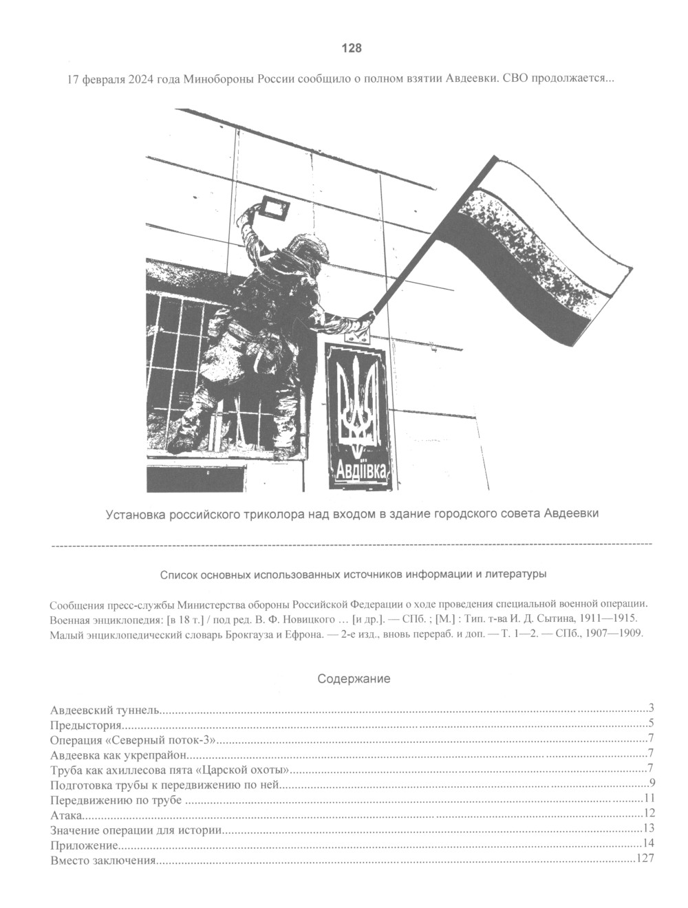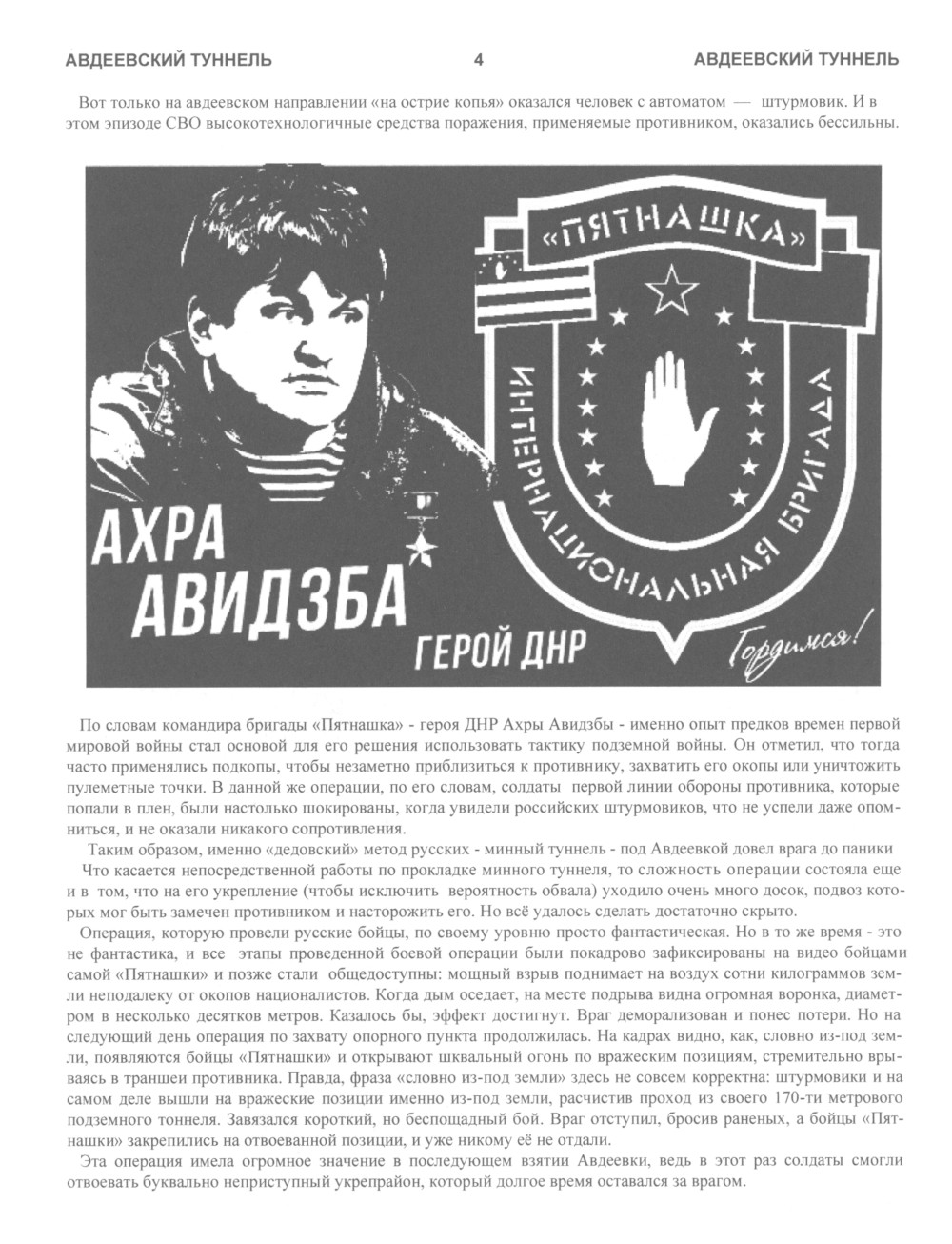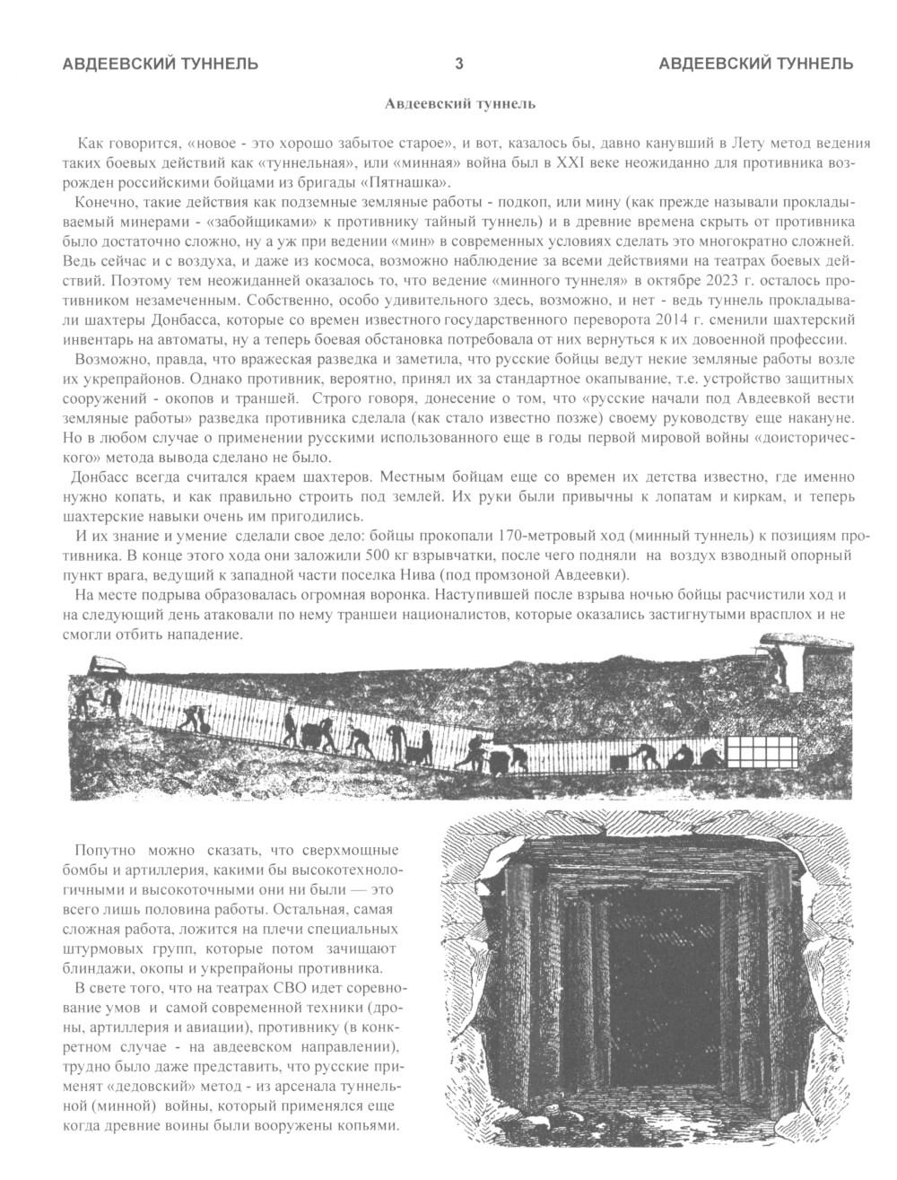 Толчком к изданию данной книги послужили две военные операции, проведенные в рамках СВО (специальной военной операции) на авдеевском направлении бойцами интернациональной бригады «Пятнашка» и диверсионно-штурмовой бригадой «Ветераны», которые применили при этом опыт русских солдат времен первой мировой войны, что позволило прорваться в неприступную казалось бы крепость - г. Авдеевка, и в итоге овладеть этим оплотом противника. В значительной мере именно эти события определили успех всей дальнейших действий по освобождению Донбасса. А сведения об этих впечатляющих и нестандартных образцах оперативного искусства, когда-нибудь войдут в учебники военных учебных заведений по всему миру как пример воинской смелости и находчивости.| Издательство | Издание книг ком |