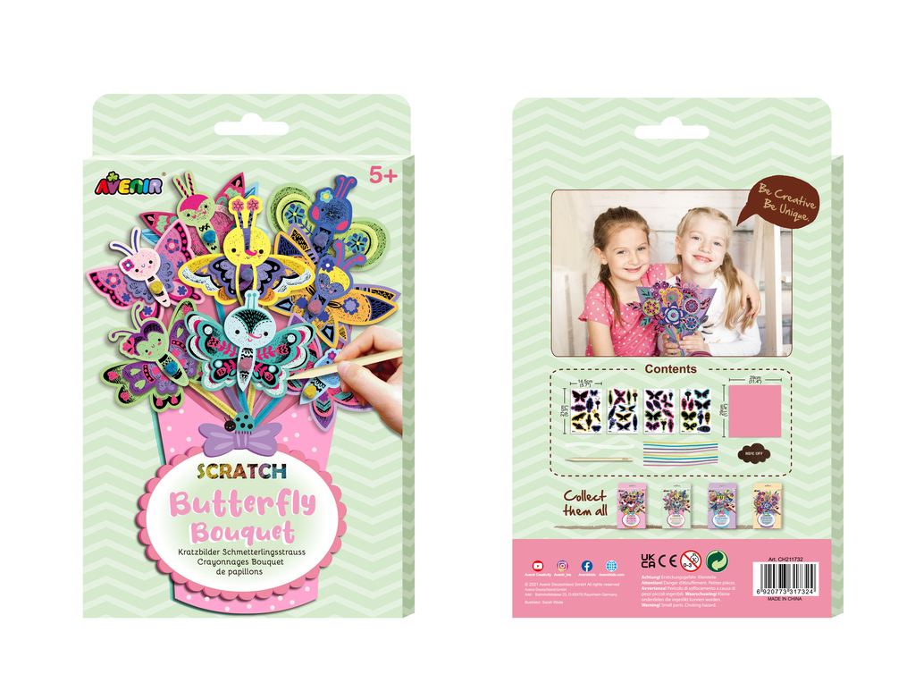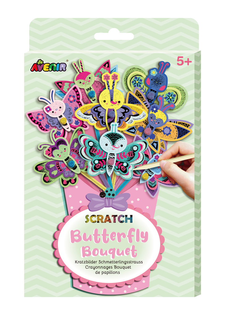 Удивительные яркие комплекты для занятий скретч-артом от Avenir подарят вашим детя часы удовольствия. Данный комплект - это больше, чем просто скрэтч, так как он дополнительно предлагает детям возможность сделать что-то большее своими руками. Выцарапайте удивительных бабочек из специальной бумаги, заверните их в прилагаемую бумагу, чтобы получился красивый "букет из бабочек".