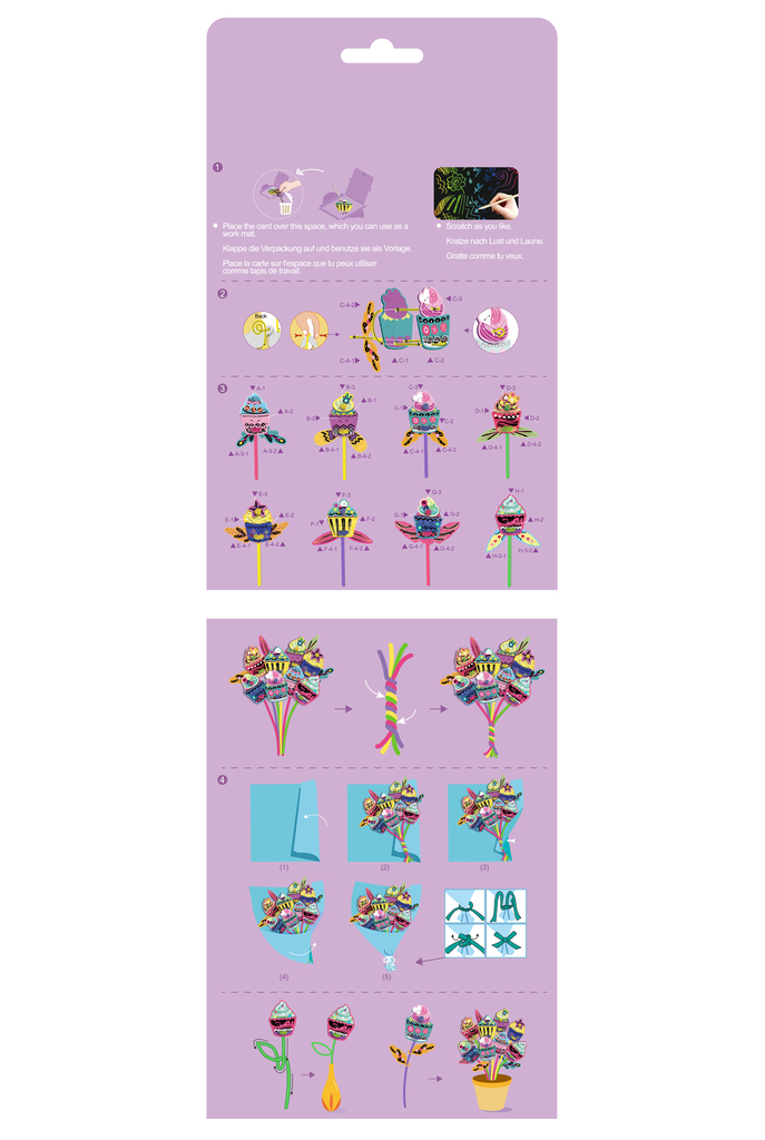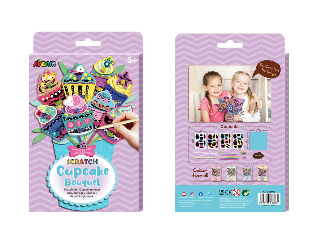 Удивительные яркие комплекты для занятий скретч-артом от Avenir подарят вашим детя часы удовольствия. Данный комплект - это больше, чем просто скрэтч, так как он дополнительно предлагает детям возможность сделать что-то большее своими руками. Выцарапайте разноцветные кексики из специальной бумаги, заверните их в прилагаемую бумагу, чтобы получился красивый "букет".