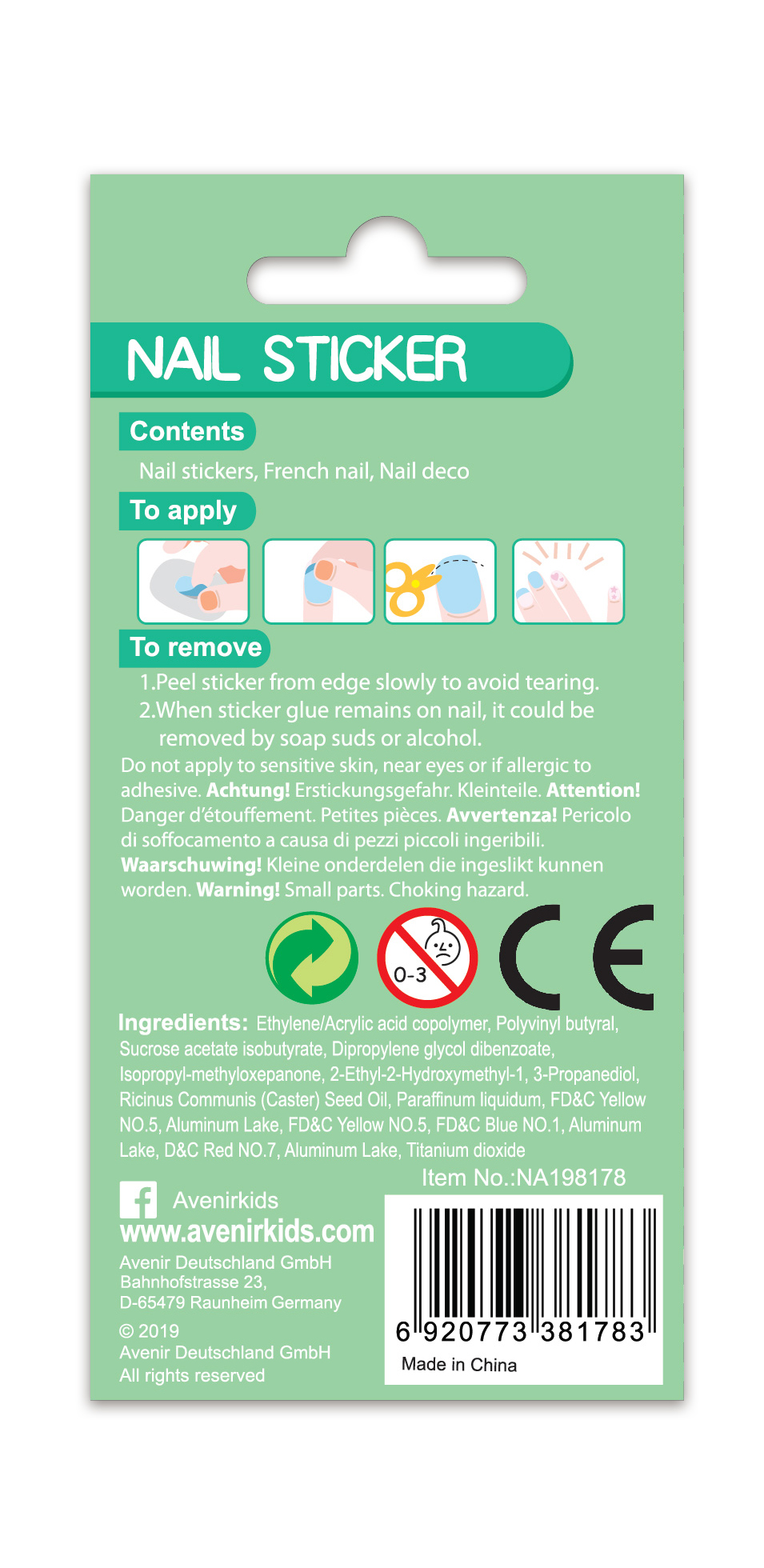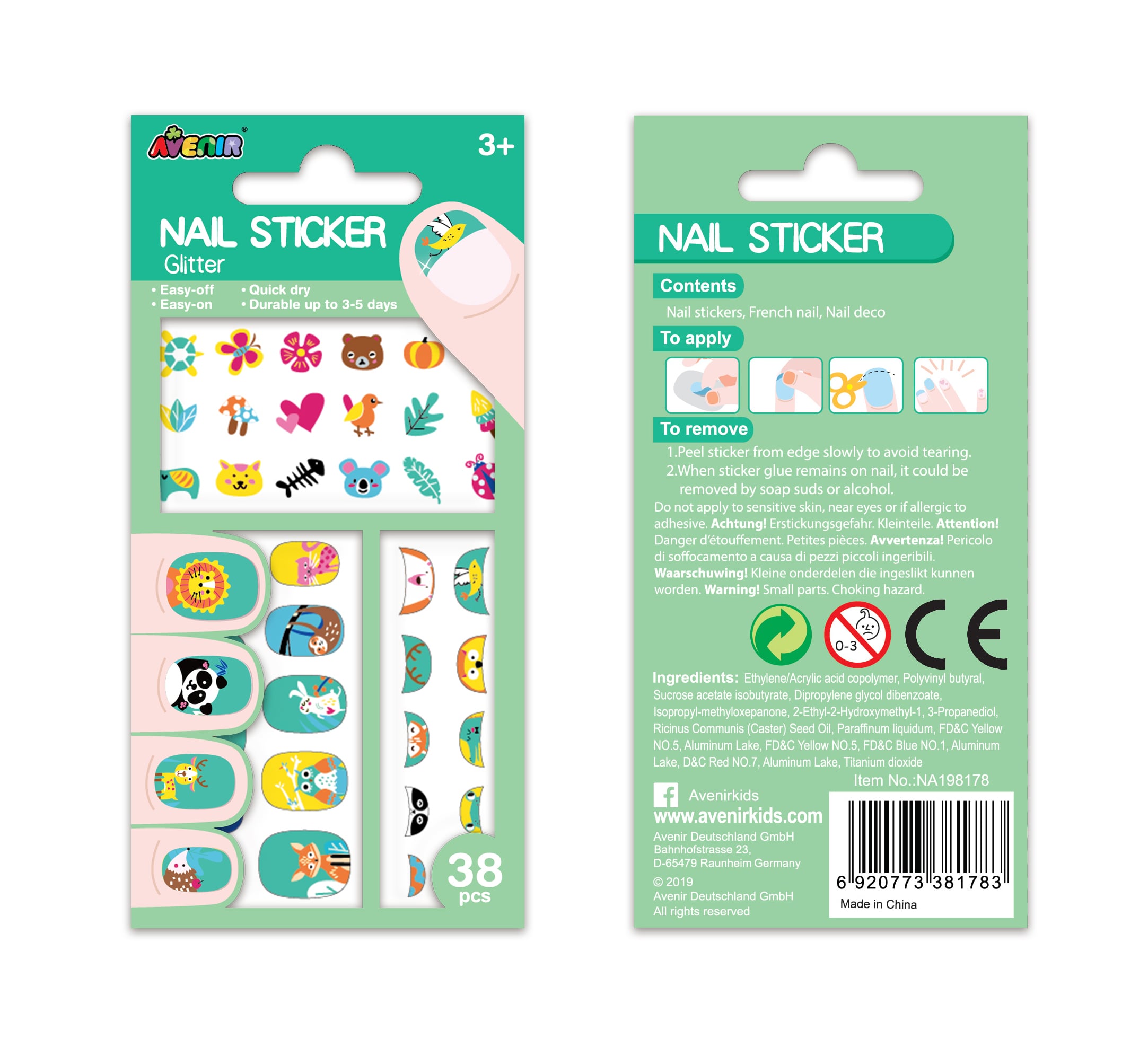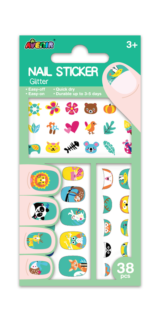 Ett paket med 38 glittriga nagelklistermärken med djurtema. Lätt att sätta på/av, snabbt torrt. Hållbar upp till 3-5 dagar. Rekommenderad ålder: 3+. Mått (B x H x D): 13cm x 17cm x 0,5cm