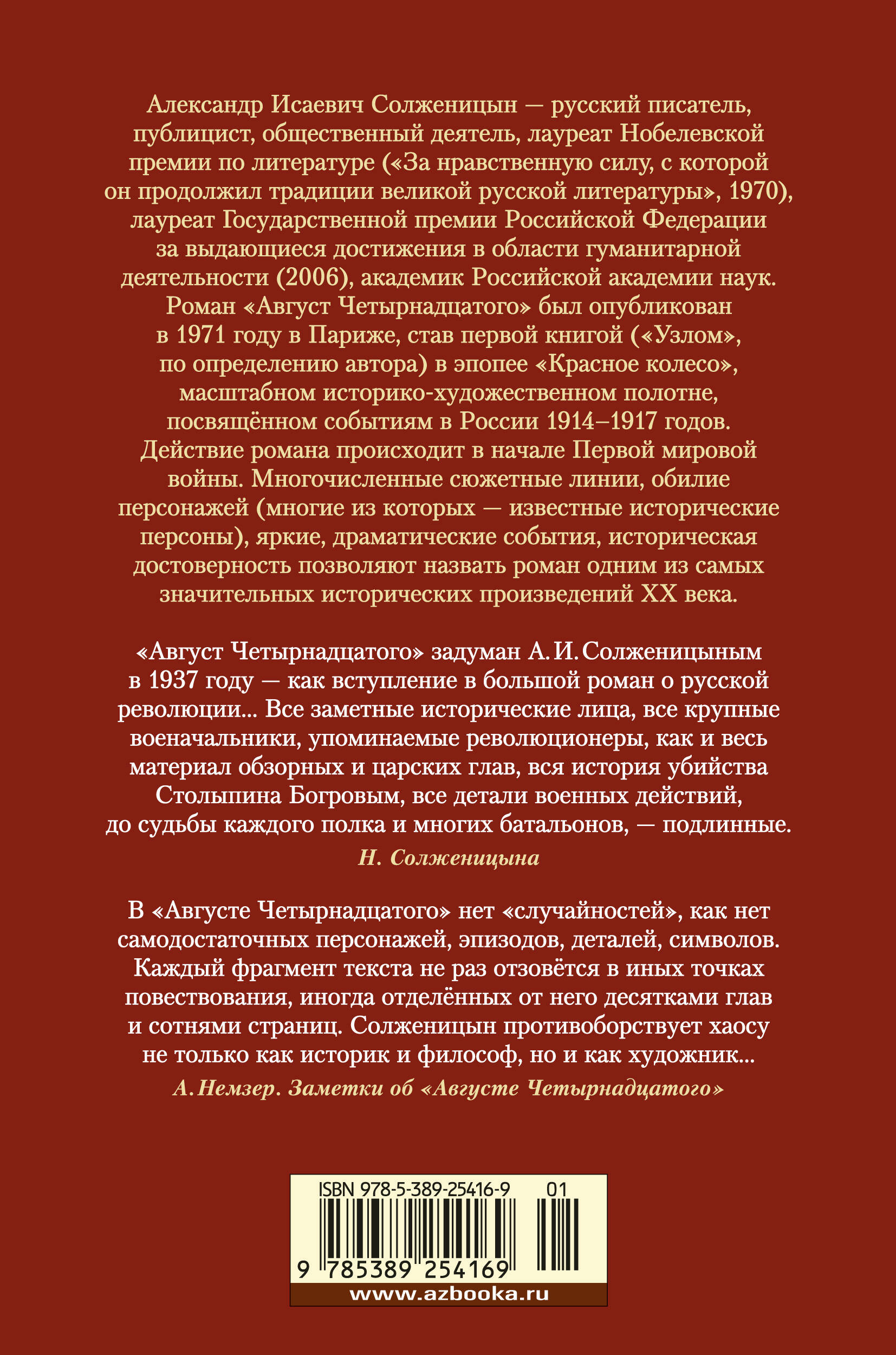 Александр Исаевич Солженицын - русский писатель, публицист, общественный деятель, лауреат Нобелевской премии по литературе ("За нравственную силу, с которой он продолжил традиции великой русской литературы", 1970), лауреат Государственной премии Российской Федерации за выдающиеся достижения в области гуманитарной деятельности (2006), академик Российской академии наук. Роман "Август Четырнадцатого" был опубликован в 1971 году в Париже, став первой книгой ("Узлом", по определению автора) в эпопее "Красное Колесо", масштабном историко-художественном полотне, посвящённом событиям в России 1914-1917 годов. Действие романа происходит в начале Первой мировой войны. Многочисленные сюжетные линии, обилие персонажей (многие из которых - известные исторические персоны), яркие, драматические события, историческая достоверность позволяют назвать роман одним из самых значительных исторических произведений ХХ века.| Издательство | Азбука-Аттикус Издат.группа ООО |