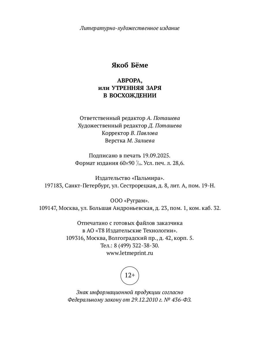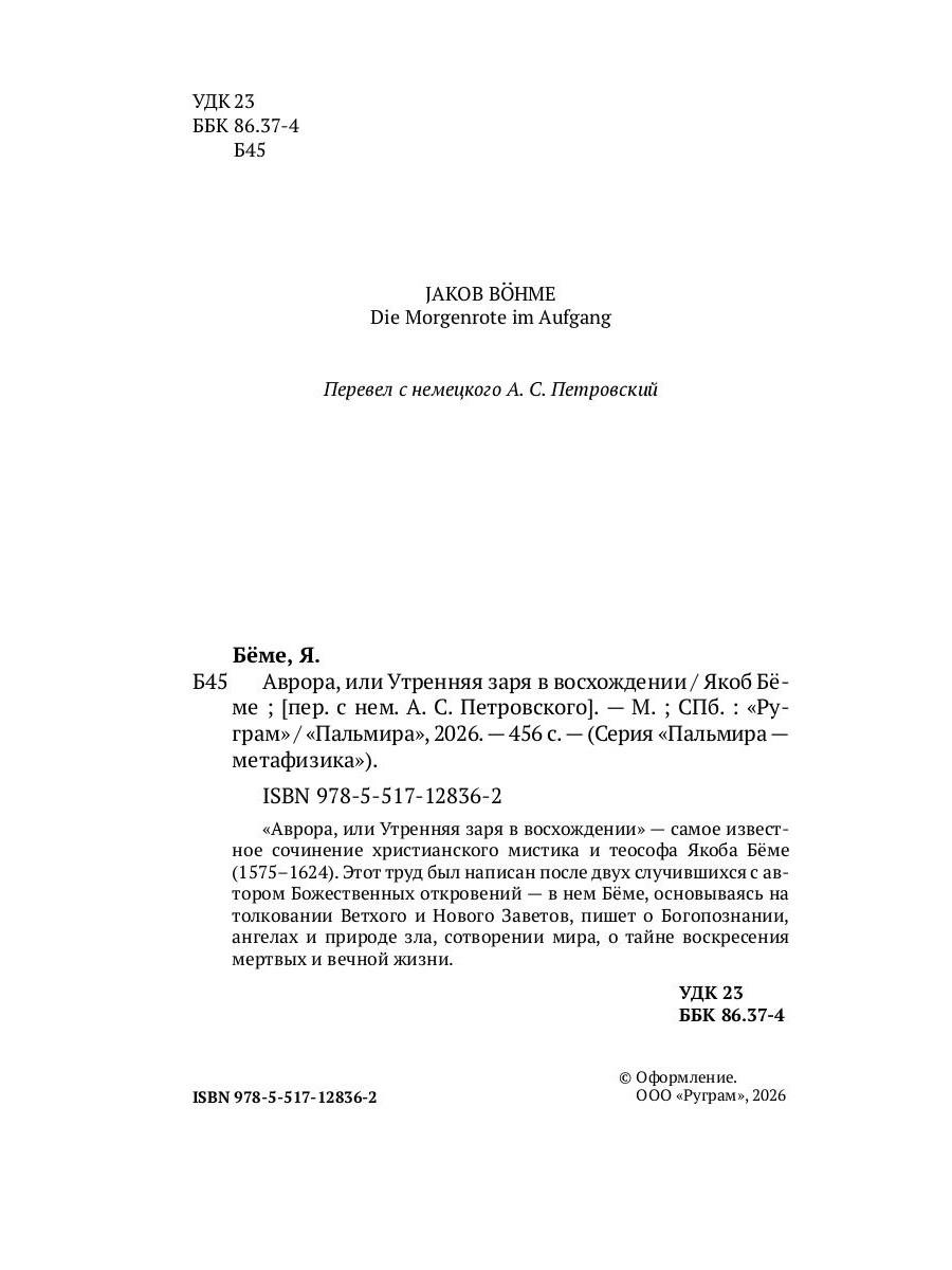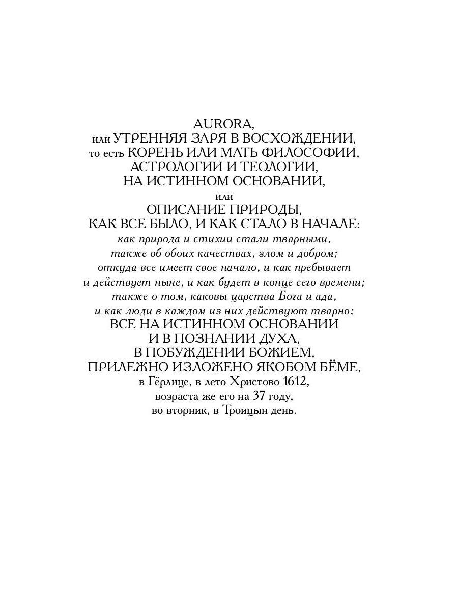 «Аврора, или Утренняя заря в восхождении» - самое известное сочинение христианского мистика и теософа Якоба Бёме (1575-1624). Этот труд был написан после двух случившихся с автором Божественных откровений - в нем Бёме, основываясь на толковании Ветхого и Нового Заветов, пишет о Богопознании, ангелах и природе зла, сотворении мира, о тайне воскресения мертвых и вечной жизни.| Издательство | Т8 RUGRAM |