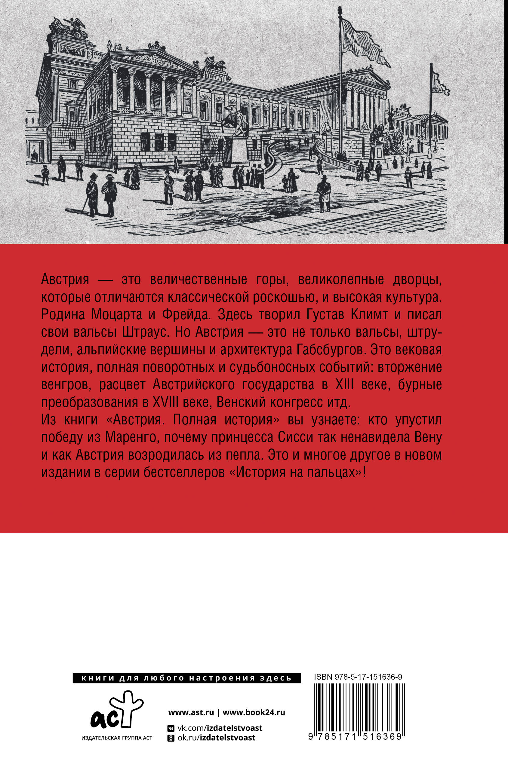 Австрия - это величественные горы, великолепные дворцы, которые отличаются классической роскошью, и высокая культура. Родина Моцарта и Фрейда. Здесь творил Густав Климт и писал свои вальсы Штраус. Но Австрия - это не только вальсы, штрудели, альпийские вершины и архитектура Габсбургов. Это вековая история, полная поворотных и судьбоносных событий, о которых так ярко и живо пишет автор: вторжение венгров, расцвет Австрийского государства в XIII веке, бурные преобразования в XVIII веке, Венский конгресс итд. Из книги "Австрия. Полная история" вы узнаете: • Самые важные события австрийской истории • Биографию и интересные факты знаменитых людей • Традиции и обычаи австрийцев. Для кого книга: • Для тех, кого увлекает история разных стран • Для тех, кто хочет открыть для себя новую страну.| Издательство | ИЗДАТЕЛЬСТВО "АСТ" |