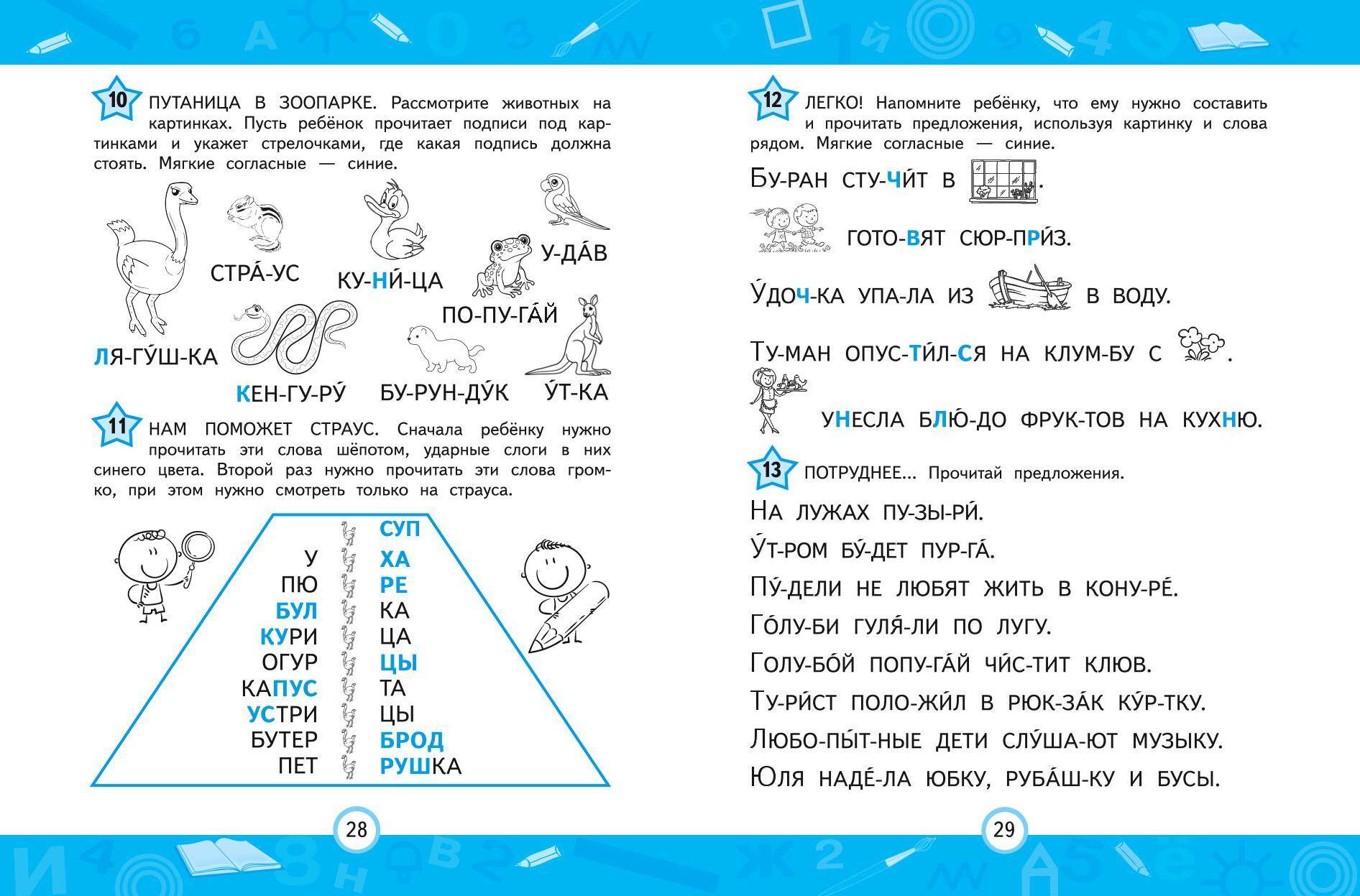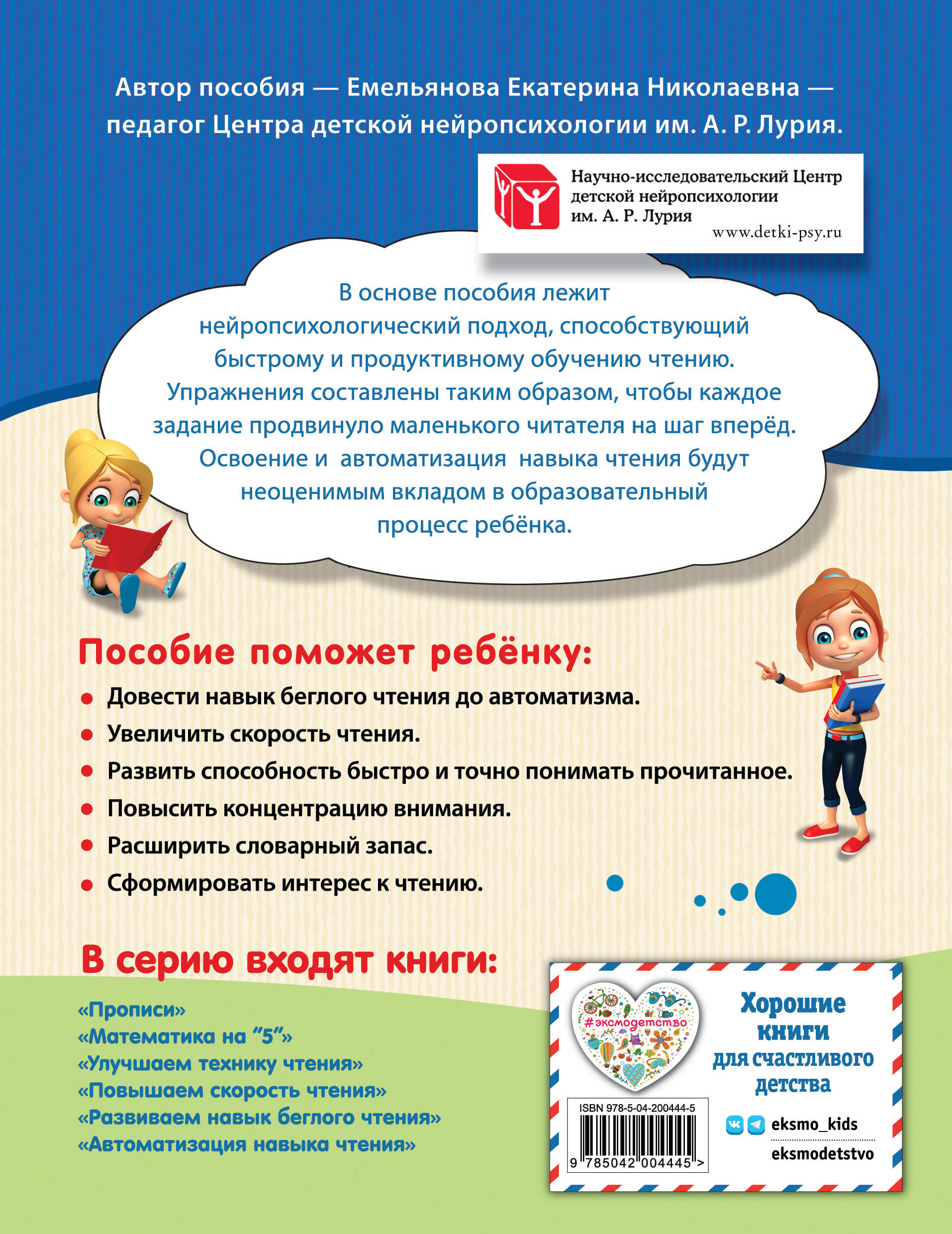 Развивающая книга-тренажёр от издательства «Эксмо» предназначена для младших школьников, которые знают буквы и умеют читать, но испытывают трудности со слиянием звуков в слоги, прочтением слогов и слиянием слогов в слова. Занимаясь по пособию, ребёнок сможет довести навык беглого чтения до автоматизма, повысить концентрацию внимания, расширить словарный запас и сформировать интерес к чтению. В основе книги Емельяновой Е. Н., практикующего педагога -нейропсихолога «Центра детской нейропсихологии им. А. Р. Лурия» и признанного специалиста в этой области, лежит нейропсихологический подход, способствующий быстрому и эффективному обучению чтению. Развивающие задания составлены таким образом, чтобы каждое упражнение продвинуло маленького читателя на шаг вперёд. Чтобы результат был заметным и устойчивым, потребуется помощь взрослого, который должен разбирать с ребёнком задания и контролировать правильность их выполнения. Освоение и автоматизация навыка чтения будут неоценимым вкладом в образование ребёнка и позволят ему реализовать заложенные в нём таланты.| Издательство | ООО "Издательство "Эксмо" |