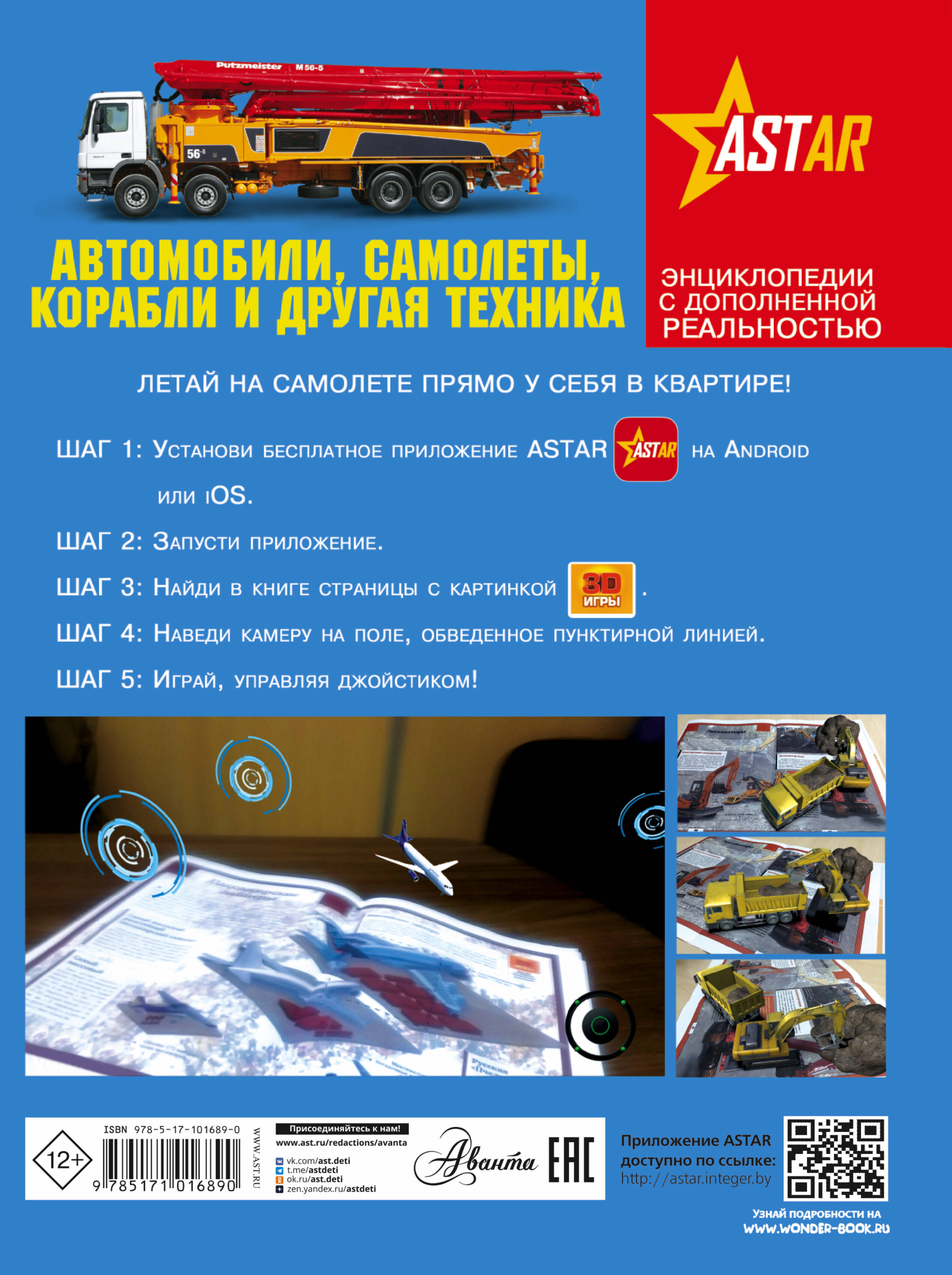 Перед вами не обычная энциклопедия: это - книга с дополненной реальностью в формате интерактивных 3D-игр. Это означает, что у вас появилась уникальная возможность не только познакомиться с автомобилями, самолётами, кораблями и другой техникой, прочитав их описание, но и увидеть их в действии - прямо на ваших глазах картинки в этой книге оживут. Как же это возможно? Все просто: возьмите смартфон или планшет, загрузите бесплатное мобильное приложение, установите его, наведите устройство на страницу из книги с таким значком - 3D-игры - и перед вами откроются небывалые возможности дополненной реальности. По вашему желанию паровоз, грохоча колесами, помчится по рельсам, вертолёт, вращая лопастями винта, поднимется в небеса, внедорожник без труда преодолеет любое препятствие, а строительный кран поднимет груз на возводимое здание - и всем этим будете управлять вы сами!| Издательство | ИЗДАТЕЛЬСТВО "АСТ" |