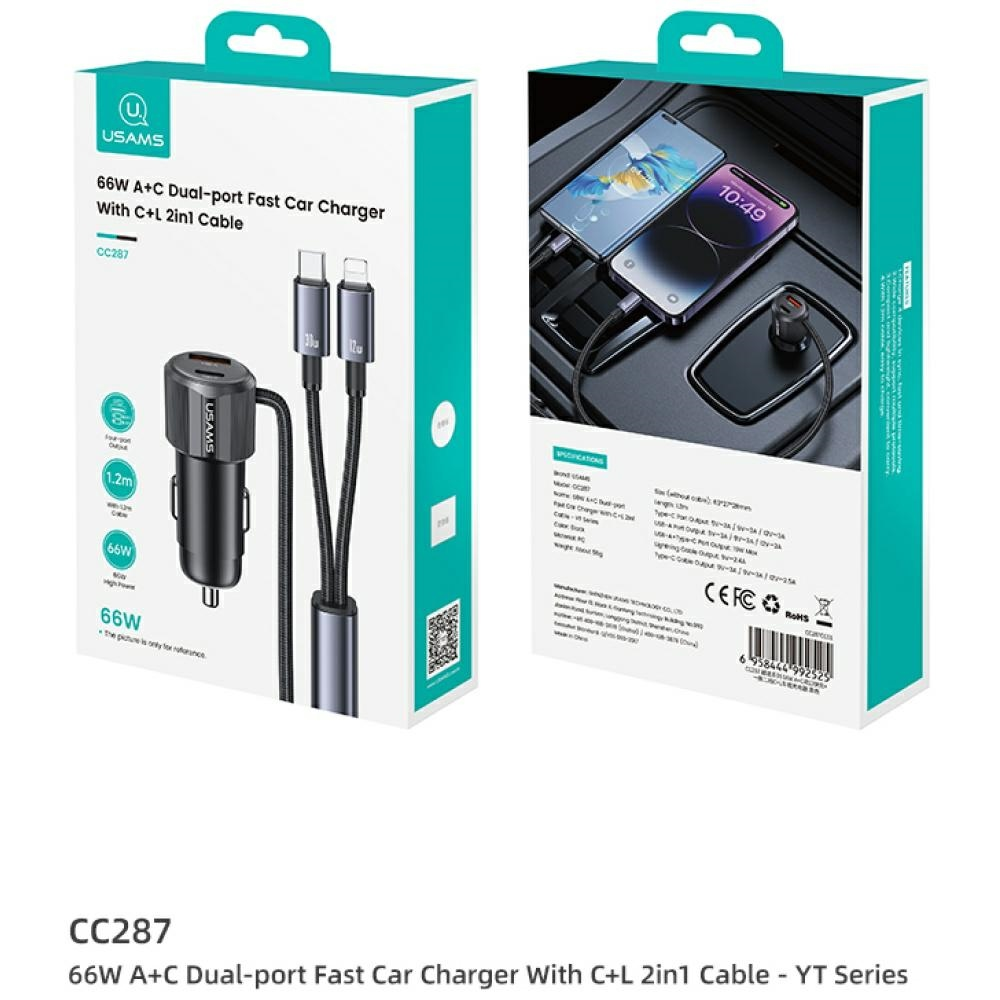 Автомобильное зарядное устройство USAMS YT Series CC287 66W 1xUSB-A 1xUSB-C + кабель 2-в-1 USB-C|Lightning чёрный