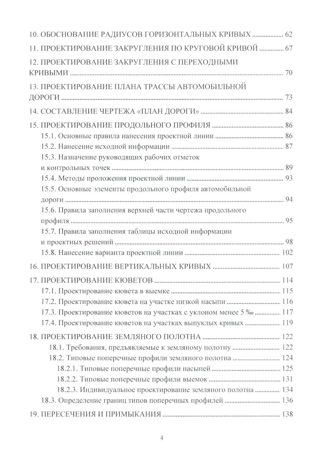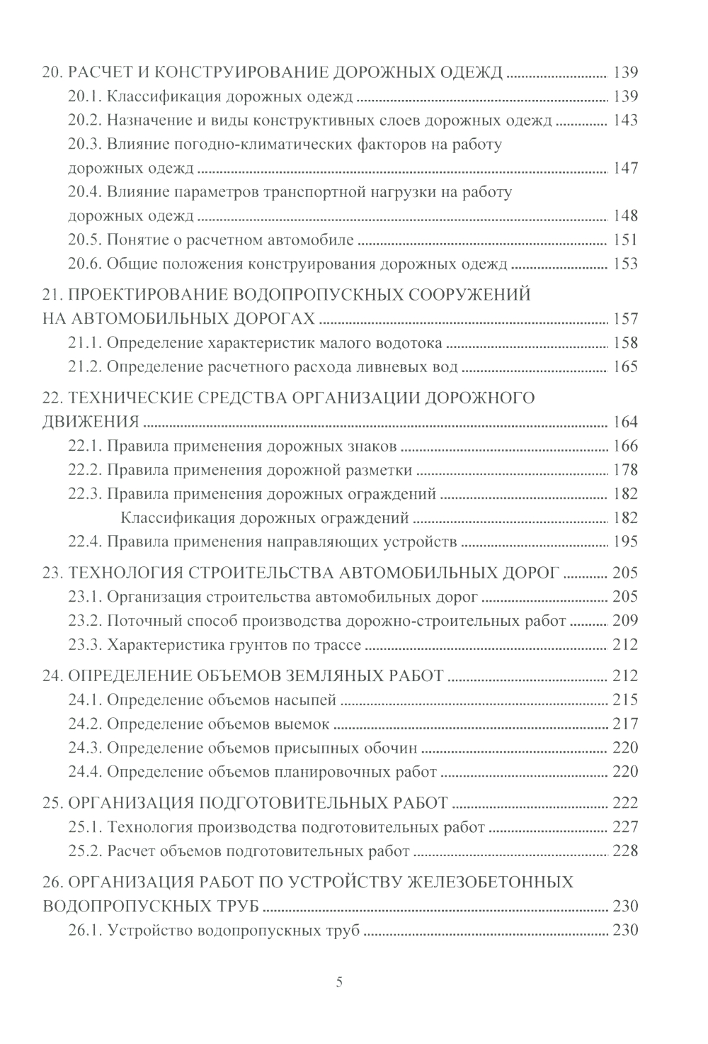 Приведены сведения об основных элементах автомобильных дорог, о методах проектирования плана трассы, построения продольного, поперечного профилей, расчета дорожных одежд и водопропускных труб. Представлены технологические схемы работы бульдозерного, скреперного, экскаваторного звеньев, технологии устройства слоев дорожной одежды. Рассмотрены вопросы содержания автомобильных дорог в зимний период. Для студентов строительных и транспортных направлений подготовки.