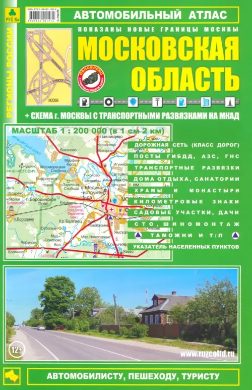 Подробная карта области (масштаб 1: 200 000, в 1 см 2 км). Укзатель населенных пунктов. Справочная информация. Плюс схема г. Москвы с транспортными развязками на МКАД.