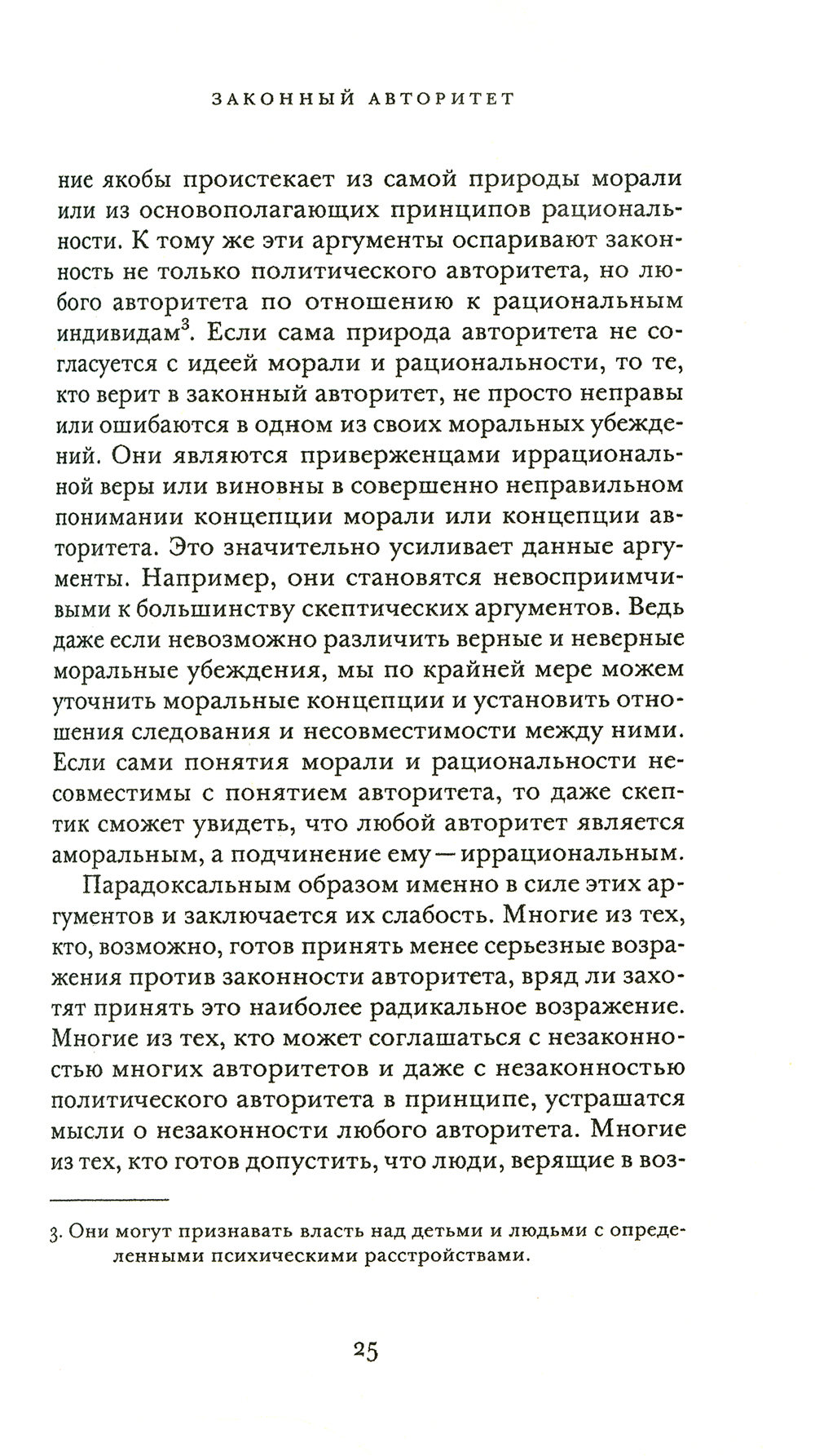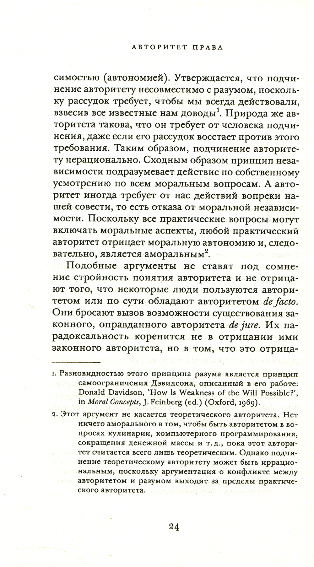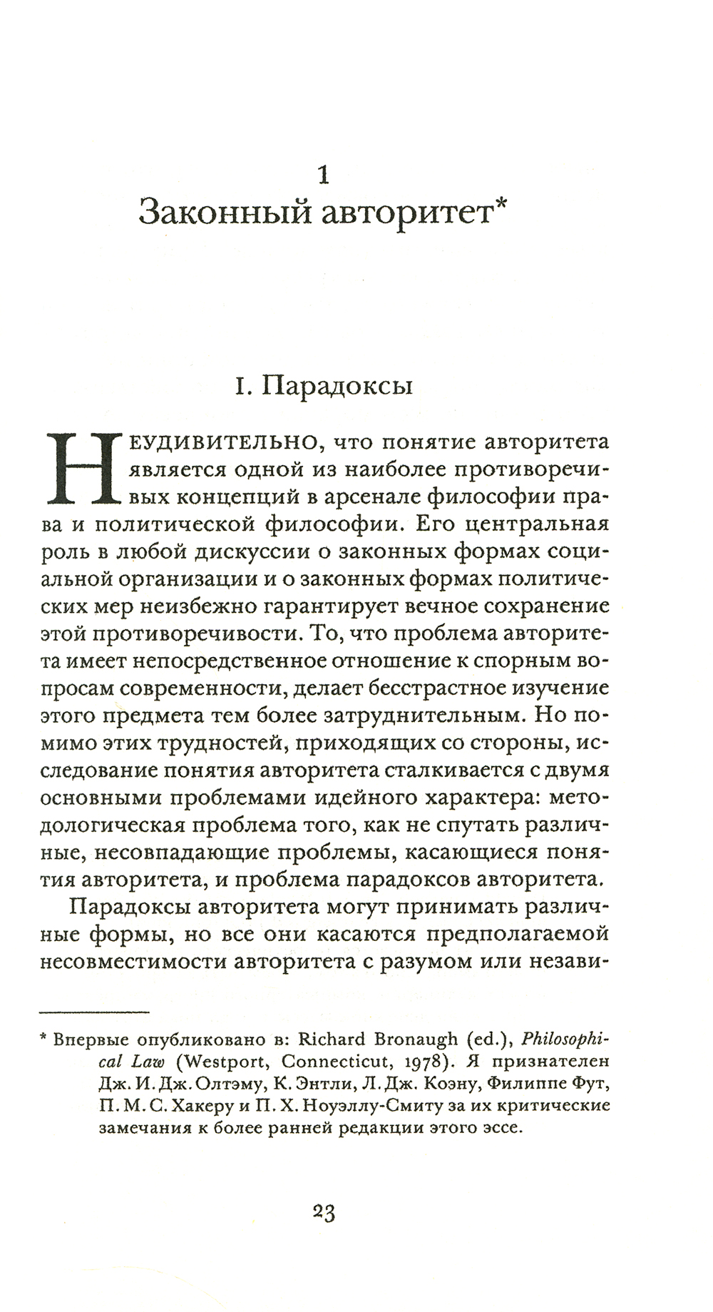 Этот классический сборник статей, впервые опубликованный в 1979 году, оказал и продолжает оказывать большое влияние на философские работы о природе права и его отношении к морали. Автор начинаете анализа понятия авторитета и притязаний права на моральный авторитет. Затем он предлагает подробное объяснение природы права и правовых систем, приводя доводы в пользу правового позитивизма. Затем он рассматривает области правовой мысли, считавшиеся пронизанными моральными ценностями, а именно социальные функции права, идеал верховенства права и т.д. В заключительной части книги описывается надлежащее моральное отношение гражданина к закону. Раз поднимает вопрос о том, имеют ли граждане моральную обязанность подчиняться закону и существует ли право на выражение несогласия. В двух приложениях он развивает свои взгляды на природу права, вступая в диалог с работами Ганса Кельзена и отвечая на критику правового позитивизма со стороны Роберта Алекси.| Издательство | Изд. Института Гайдара |