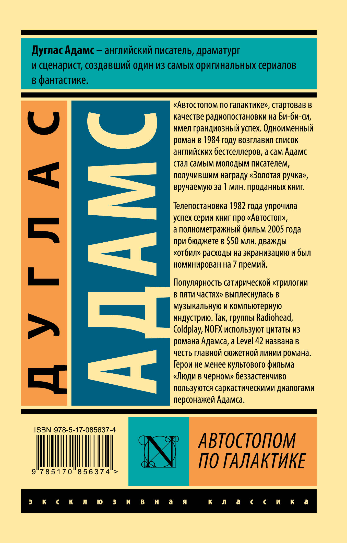 "Автостопом по Галактике", стартовав в качестве радиопостановки на Би-би-си, имел грандиозный успех. Одноименный роман в 1984 году возглавил список английских бестселлеров, а сам Адамс стал самым молодым писателем, получившим награду "Золотая ручка", вручаемую за 1 млн. проданных книг. Телепостановка 1982 года упрочила успех серии книг про "Автостоп", а полнометражный фильм 2005 года при бюджете в $50 млн. дважды "отбил" расходы на экранизацию и был номинирован на 7 премий. Популярность сатирической "трилогии в пяти частях" выплеснулась в музыкальную и компьютерную индустрию. Так, группы Radiohead, Coldplay, NOFX используют цитаты из романа Адамса, а Level 42 названа в честь главной сюжетной линии романа. Герои не менее культового фильма "Люди в черном" беззастенчиво пользуются саркастическими диалогами персонажей Адамса.| Издательство | ИЗДАТЕЛЬСТВО "АСТ" |