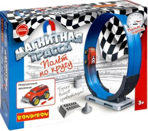 Автотрек Магнитная трасса от Bondibon демонстрирует возможности преодоления гравитации за счёт законов физики: действия магнита и инерционного механизма. Машинка запускается при помощи инерции и крепится к трассе за счёт магнита, что позволяет ей проделывать невероятные трюки на всей протяженности скоростного трека.