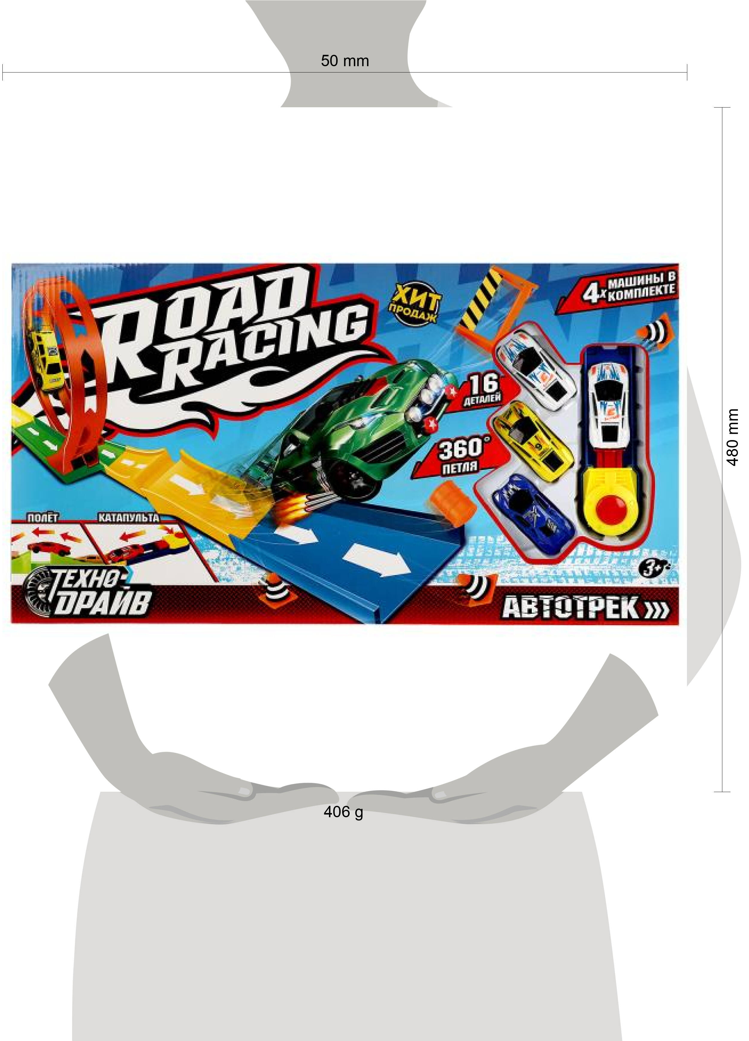 Аннотация: Автотрек петля 360, 4 машинки, кор.47,5*26,5*4,5см ТЕХНОДРАЙВ в кор.2*24шт