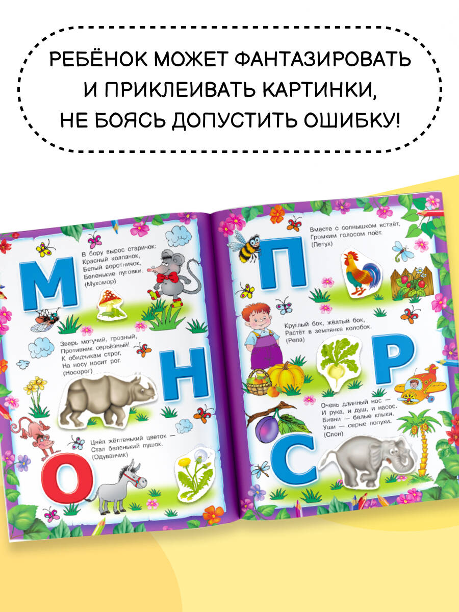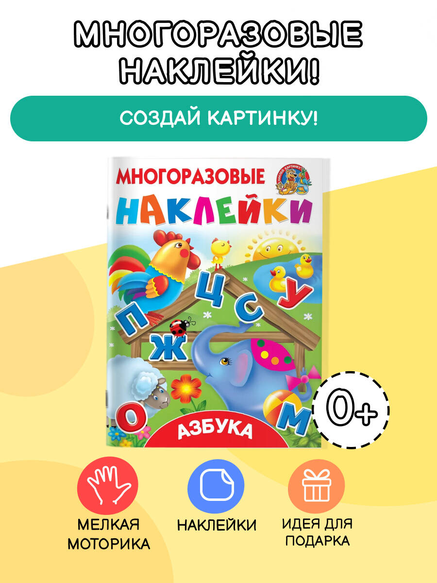 О чем эта книга Книга, которую вы держите в руках, - развивающее пособие для знакомства с алфавитом и полезная игра с многоразовыми наклейками. Кому эта книга будет интересна Красочная азбука для дошкольников плюс буквы-стикеры, которые можно наклеивать много-много раз. Каковы особенности этой книги - Занимайтесь по замечательной книжке вместе с ребенком - учите буквы, тренируйте пальчики, развивайте интеллект. - Стикеры малыш сможет приклеивать на страницы книги бесконечное множество раз. - Веселые уроки знакомят с алфавитом, тренируют мелкую моторику, развивают логическое и пространственное мышление и воображение. - Выполнение заданий и подбор наклеек требуют усидчивости и внимания к деталям.| Издательство | ИЗДАТЕЛЬСТВО "АСТ" |