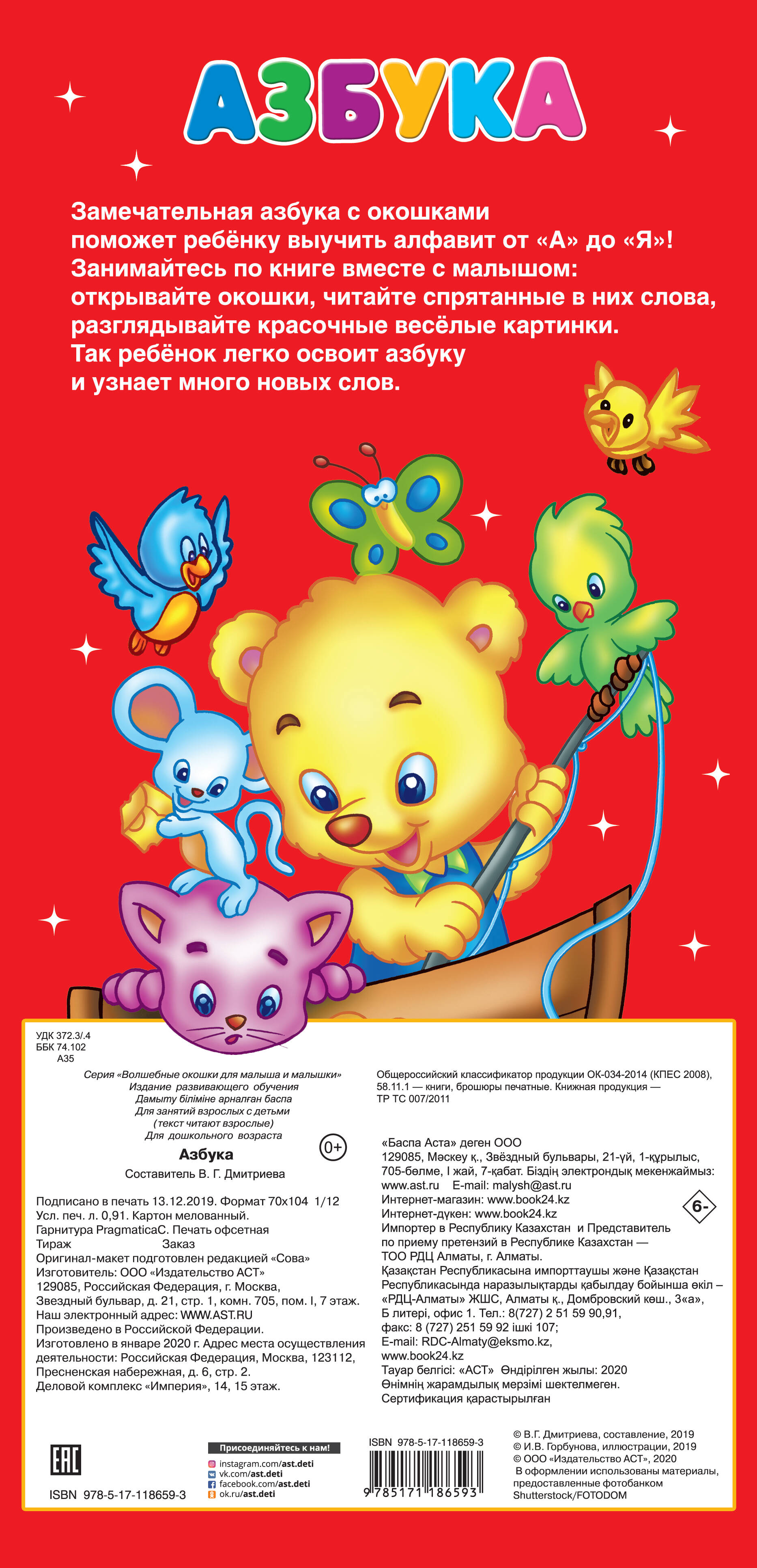 О чём эта книга Замечательное пособие «Азбука 32 окошка» поможет ребёнку запомнить, как пишутся и читаются буквы русского алфавита. Листая страницы книги и открывая специальные окошки-клапаны, малыш выучит алфавит от «А» до «Я», а заодно потренирует память и интеллект, обогатит словарный запас, расширит кругозор. Кому эта книга будет интересна Азбука с окошками для детей дошкольного возраста. Каковы особенности этой книги • Знание алфавита - базовая основа для обучения ребёнка чтению. • В книге малыш найдёт множество новых слов: названия растений, животных, игрушек и многого, многого другого. • Яркие запоминающиеся картинки не дадут малышу заскучать.| Издательство | ИЗДАТЕЛЬСТВО "АСТ" |
