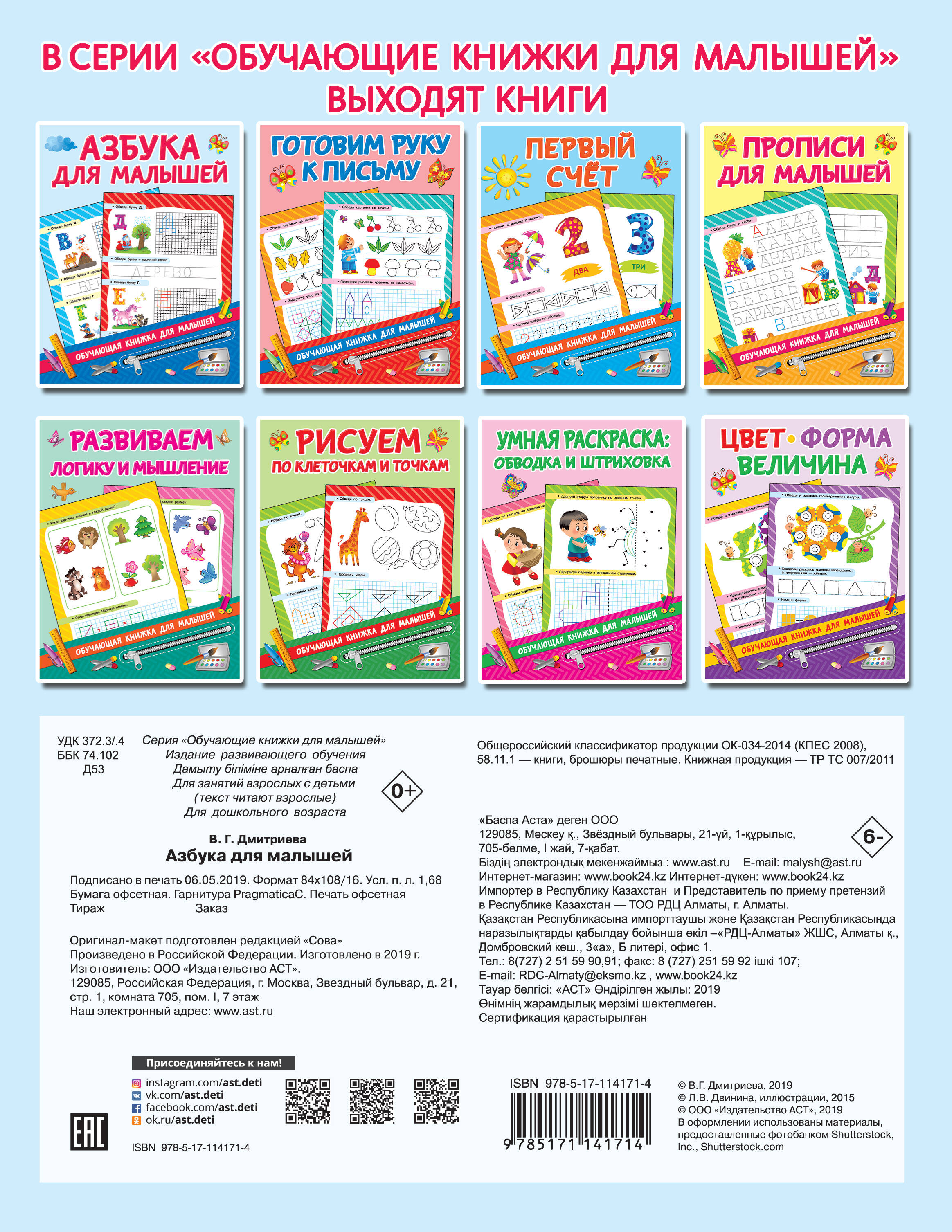 1. О чем эта книга «Обучающие книжки для малышей» - серия, основанная на многолетнем опыте обучения дошкольников. Интересные задания развивают гибкость ума, речь, внимание, память и графические навыки. Красочные развивающие прописи - это множество познавательных и интересных упражнений. Малыш познакомится с буквами алфавита и научится их писать. 2. Кому эта книга будет интересна Книги будут полезны всем, заинтересованным в развитии и обучении малыша. 3. Каковы особенности этой книги • Замечательные иллюстрации к каждой букве. • Первые уроки знакомства с буквами обогащают словарный запас, развивают речь, память, воображение. • Занятия по книжке с цветными картинками превратятся в увлекательную игру, и ребенок запомнит алфавит играючи! Книга наполнит жизнь ребёнка новыми интересными впечатлениями и полезными знаниями.| Издательство | ИЗДАТЕЛЬСТВО "АСТ" |