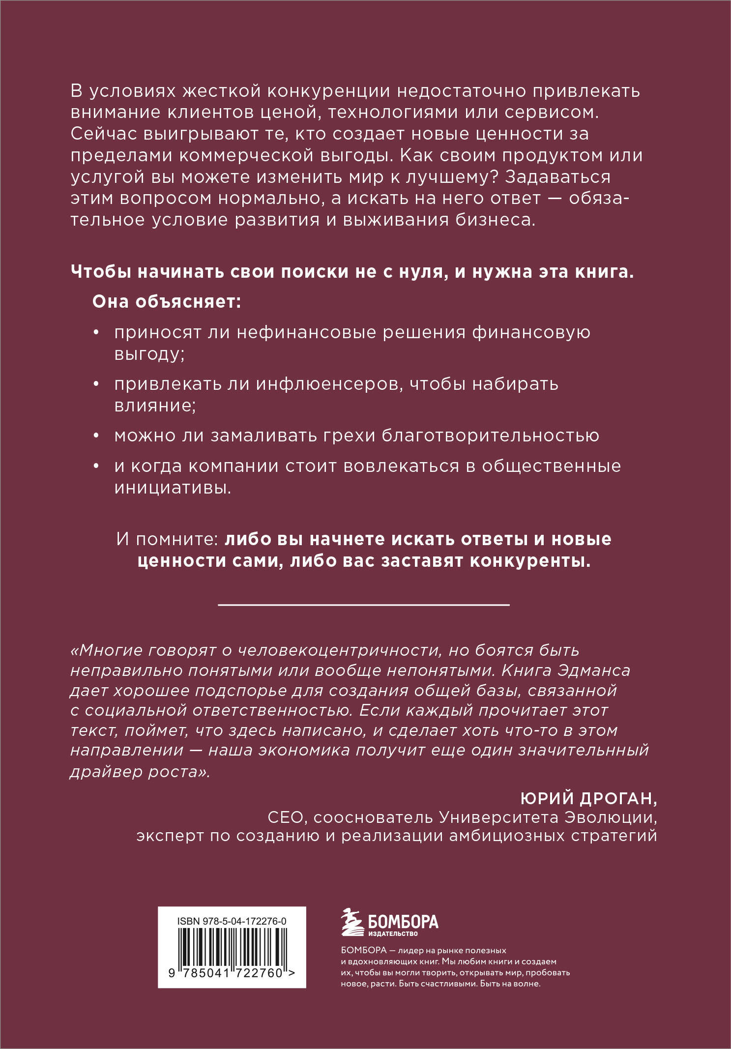 В условиях жесткой конкуренции недостаточно привлекать внимание клиентов ценой, технологиями или сервисом. Сейчас выигрывают те, кто создает новые ценности за пределами коммерческой выгоды. Как своим продуктом или услугой вы можете изменить мир к лучшему? Задаваться этим вопросом нормально, а искать на него ответ - обязательное условие развития и выживания бизнеса. Чтобы начинать свои поиски не с нуля, и нужна эта книга. Она объясняет: - приносят ли нефинансовые решения финансовую выгоду; - привлекать ли инфлюенсеров, чтобы набирать влияние; - можно ли замаливать грехи благотворительностью; - и когда компании стоит вовлекаться в общественные инициативы. И помните: либо вы начнете искать ответы и новые ценности сами, либо вас заставят конкуренты. «Многие говорят о человекоцентричности, но боятся быть неправильно понятыми или вообще непонятыми. Книга Эдманса дает хорошее подспорье для создания общей базы, связанной с социальной ответственностью. Если каждый прочитает этот текст, поймет, что здесь написано, и сделает хоть что-то в этом направлении - наша экономика получит еще один значительный драйвер роста». - ЮРИЙ ДРОГАН, CEO, сооснователь Университета Эволюции, эксперт по созданию и реализации амбициозных стратегий| Издательство | ООО "Издательство "Эксмо" |