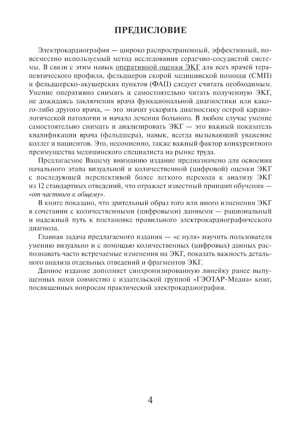Данная книга представляет собой практическое руководство для начального освоения электрокардиографии. Она учит «с нуля» уверенно распознавать распространенные изменения на ЭКГ, совмещая визуальную оценку графической кривой с анализом количественных (цифровых) данных. Уникальная методика обучения построена на работе с оптимально подобранными фрагментами и отведениями из реального клинического архива автора, что позволяет выработать ключевые навыки точечного анализа. Этот практический опыт существенно ускоряет и облегчает последующий переход к самостоятельной интерпретации полноформатных электрокардиограмм. Издание предназначено для самостоятельного начального освоения «с нуля» анализа ЭКГ врачам терапевтического и кардиологического профиля, фельдшерам скорой медицинской помощи и фельдшерско-акушерских пунктов, работа которых часто требует оперативной оценки ЭКГ, а также будет полезно студентам лечебных факультетов медицинских вузов при освоении практической электрокардиографии.| Издательство | ГЭОТАР-Медиа |