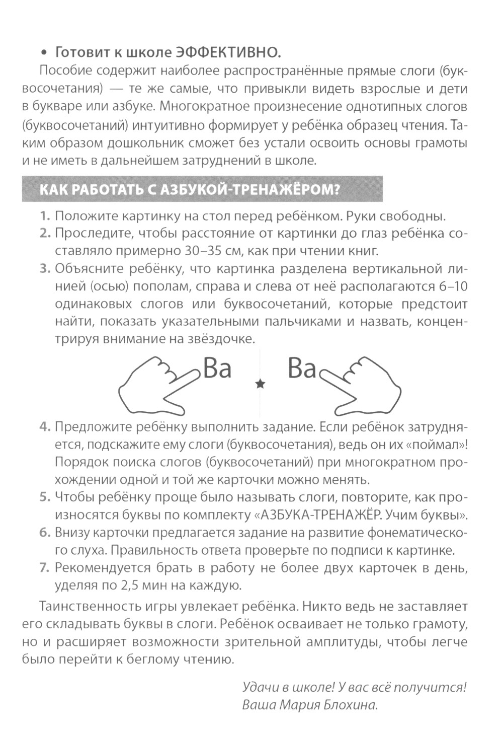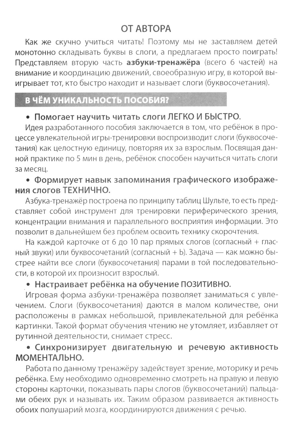 Азбука-тренажёр научит читать ЛЕГКО И БЫСТРО. Ребенок в процессе игры воспроизводит буквы, слоги, слова, повторяя за взрослым и запоминая их. Пособие построено по принципу таблиц Шульте и тренирует периферическое зрение, внимание и параллельное восприятие информации. Настраивает на обучение ПОЗИТИВНО, помогая понимать смысл прочитанного и видеть за сочетанием букв образ. Синхронизирует двигательную и речевую активность МОМЕНТАЛЬНО. Развивает оба полушария мозга и координирует движения с речью. Пройдя весь тренажер, ребенок ЭФФЕКТИВНО подготовлен к школе и к текстовому чтению.