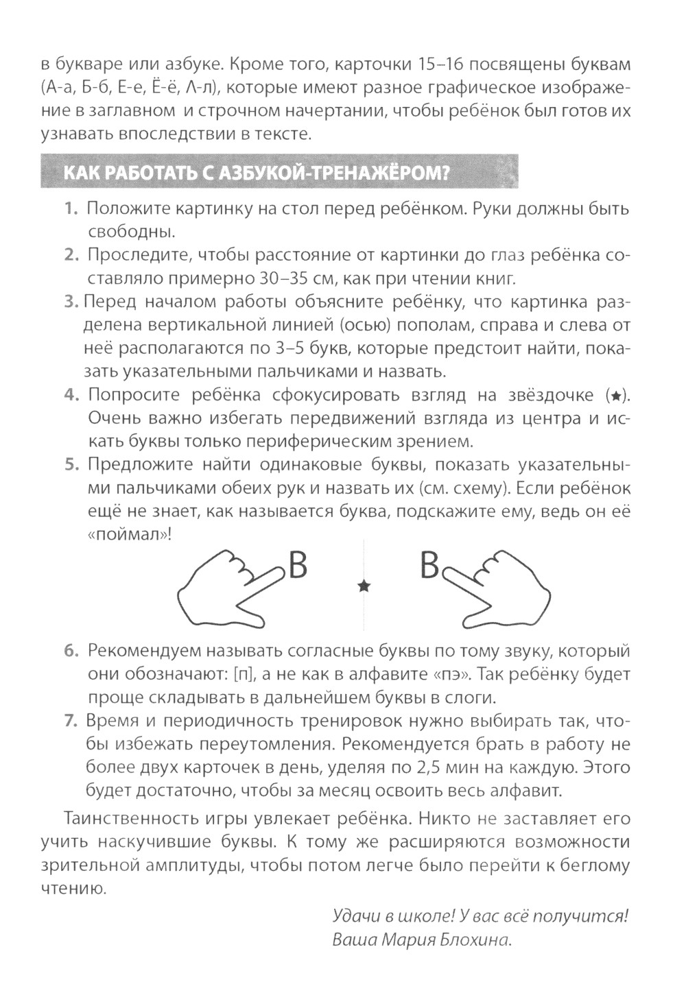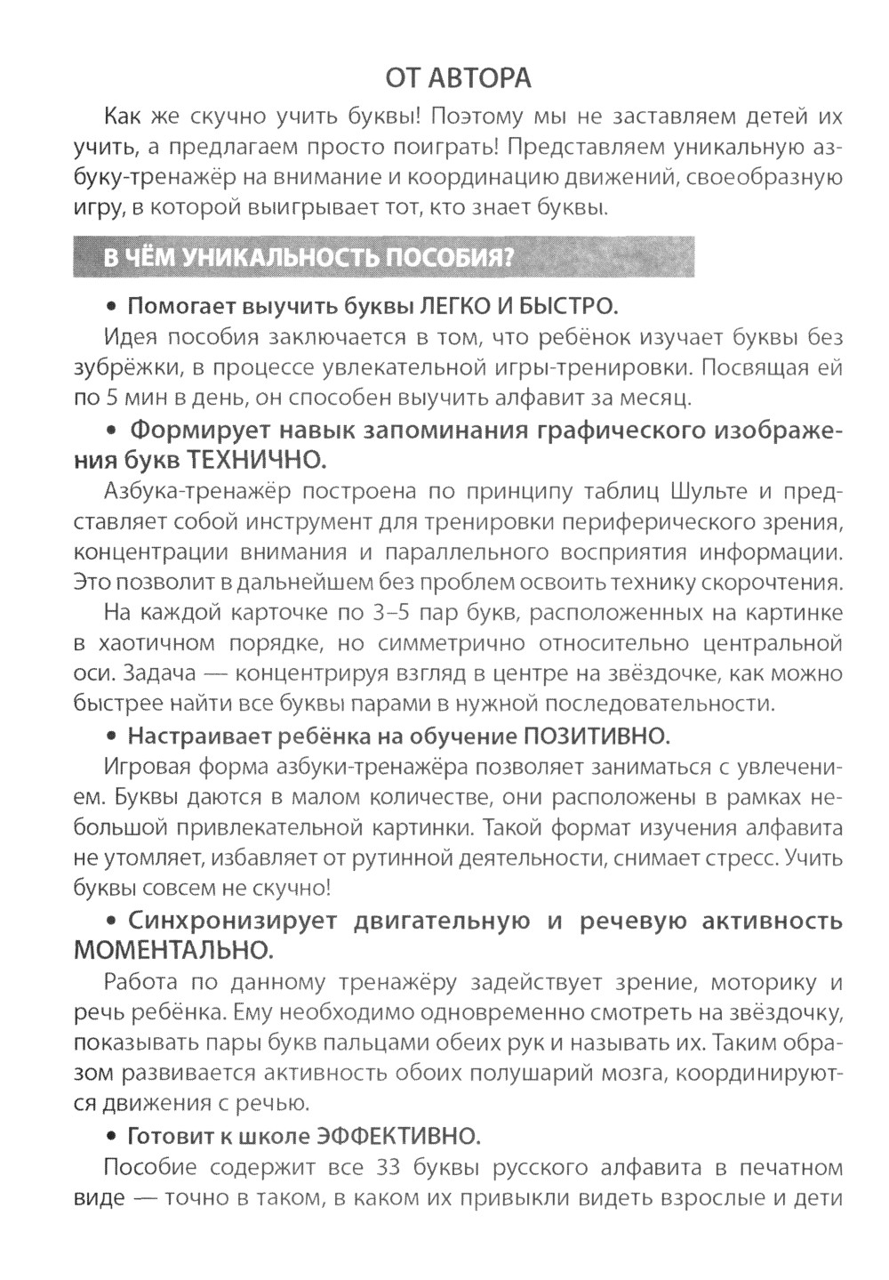 Азбука-тренажёр научит читать ЛЕГКО И БЫСТРО. Ребенок в процессе игры воспроизводит буквы, слоги, слова, повторяя за взрослым и запоминая их. Пособие построено по принципу таблиц Шульте и тренирует периферическое зрение, внимание и параллельное восприятие информации. Настраивает на обучение ПОЗИТИВНО, помогая понимать смысл прочитанного и видеть за сочетанием букв образ. Синхронизирует двигательную и речевую активность МОМЕНТАЛЬНО. Развивает оба полушария мозга и координирует движения с речью. Пройдя весь тренажер, ребенок ЭФФЕКТИВНО подготовлен к школе и к текстовому чтению.| Издательство | Творческий центр Сфера |