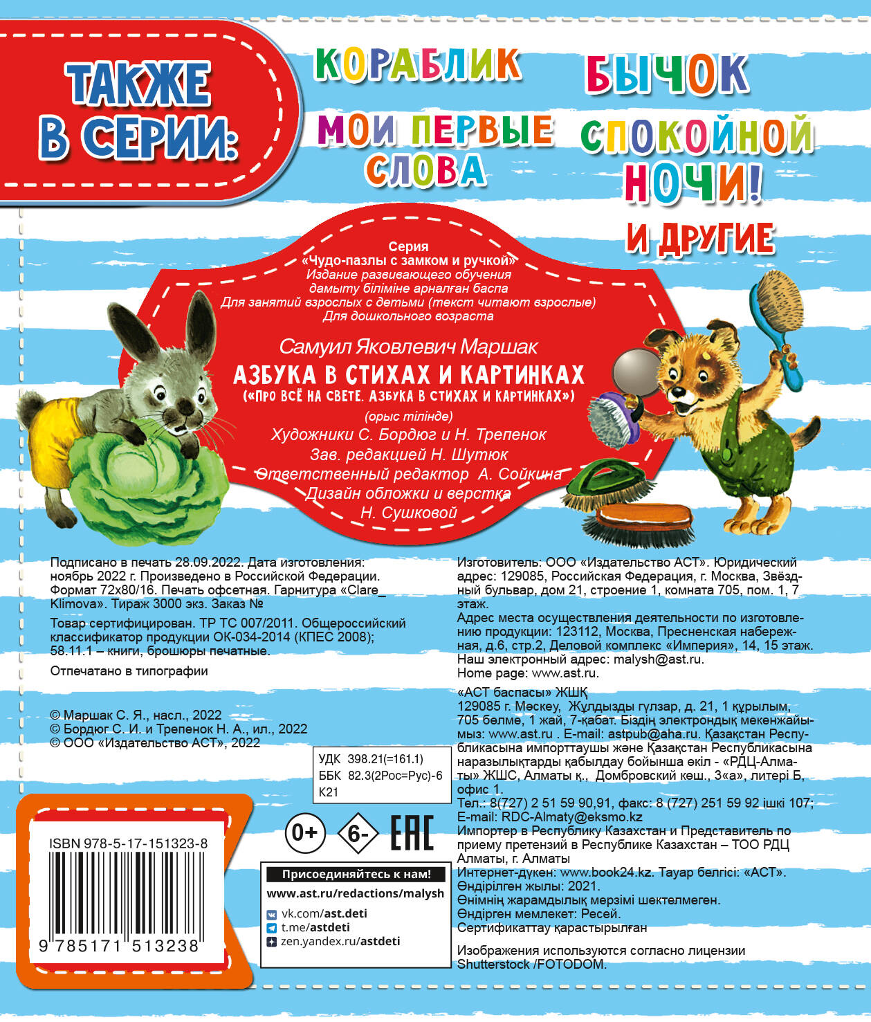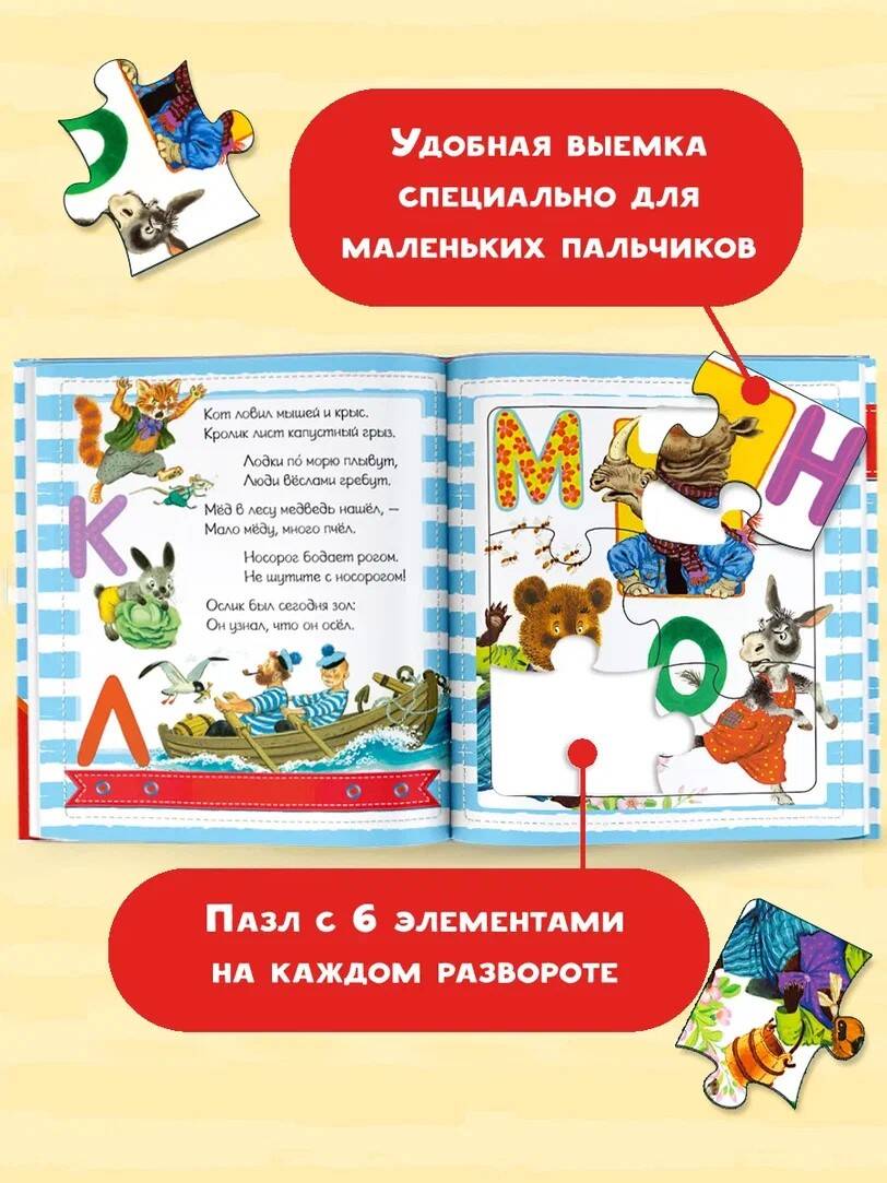 Самая любимая "Азбука в стихах и картинках" С. Я Маршака - теперь в новом игровом формате! На каждом из шести разворотов малыша ждёт красочный пазл из 6 прочных деталей. Собирая пазлы и слушая весёлые стихи, ребёнок легко и быстро выучит буквы, будет развивать мелкую моторику, концентрацию внимания и усидчивость. Удобная ручка и пластиковый замочек, прикрепленные к книге, позволят взять её с собой в дорогу, на прогулку или в гости. Книги серии "Чудо-пазлы с замком и ручкой" - классика для самых маленьких в удобном игровом формате!| Издательство | ИЗДАТЕЛЬСТВО "АСТ" |