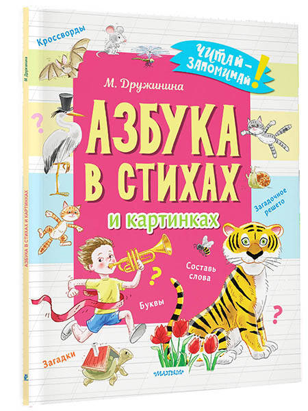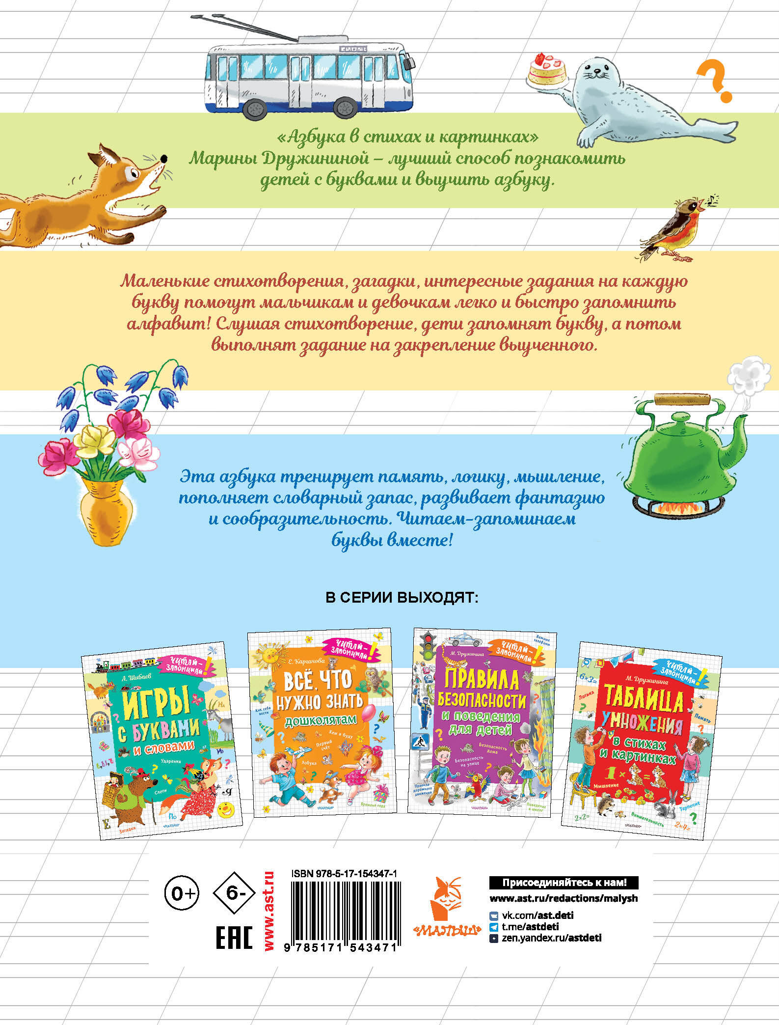 «Азбука в стихах и картинках» Марины Дружининой - лучший способ познакомить детей с буквами и выучить азбуку. Маленькие стихотворения, загадки, интересные задания на каждую букву помогут мальчикам и девочкам легко и быстро запомнить алфавит! Слушая стихотворение, дети запомнят букву, а потом выполнят задание на закрепление выученного. Эта азбука тренирует память, логику, мышление, пополняет словарный запас, развивает фантазию и сообразительность. Читаем-запоминаем буквы вместе!