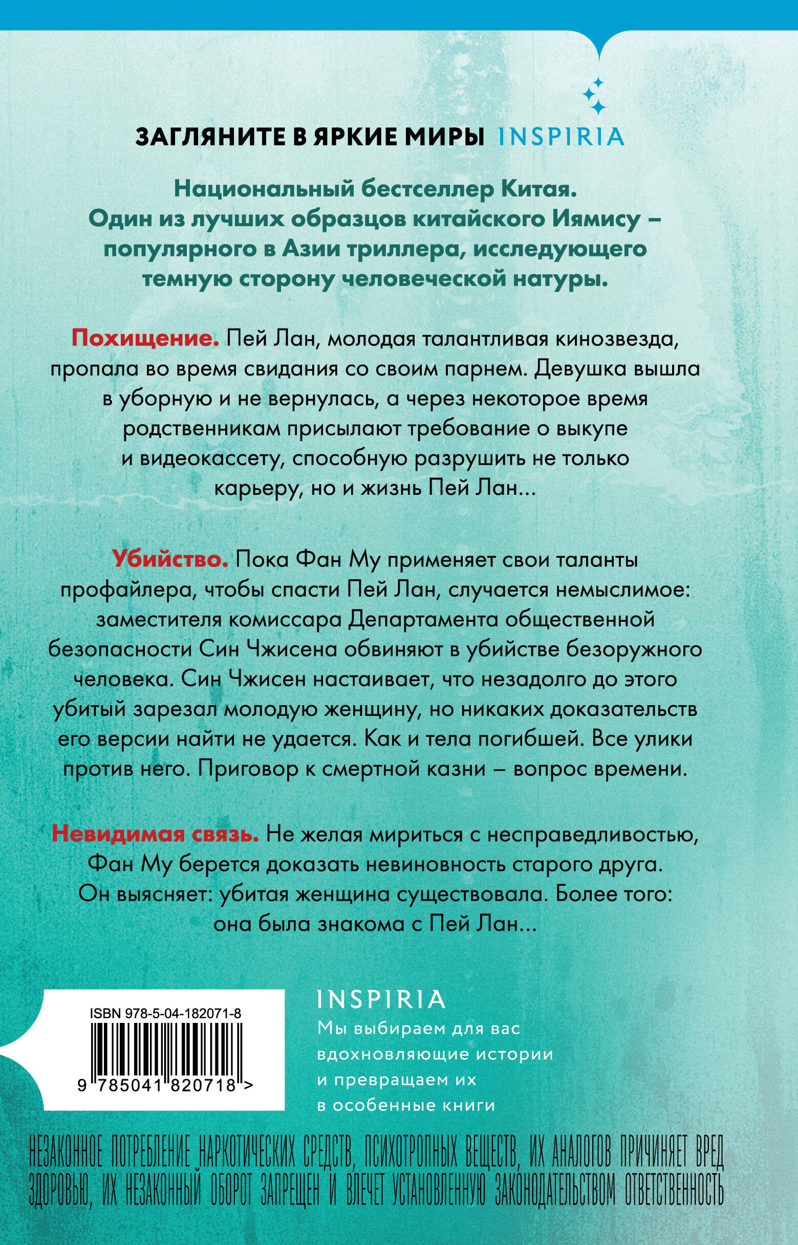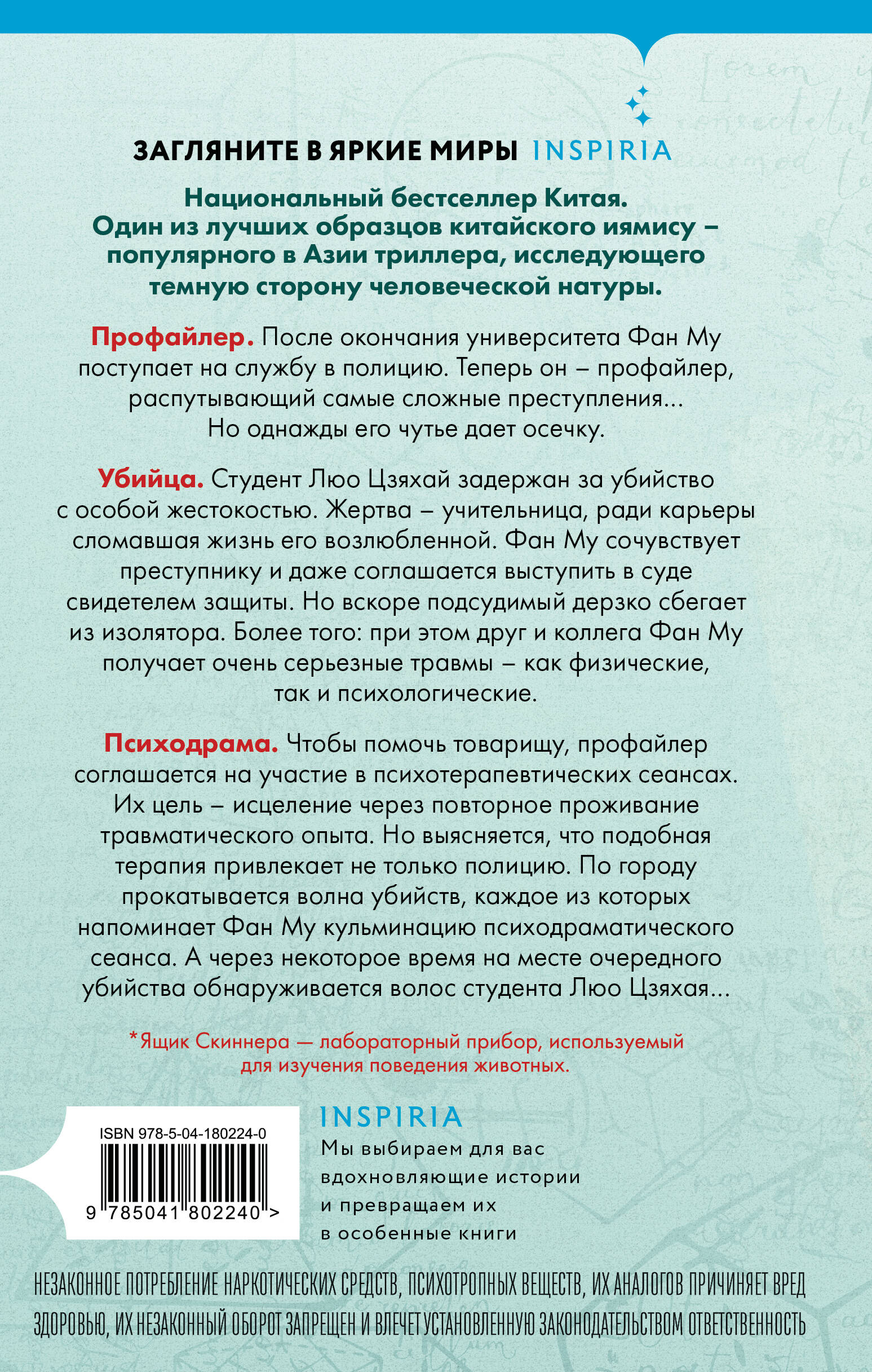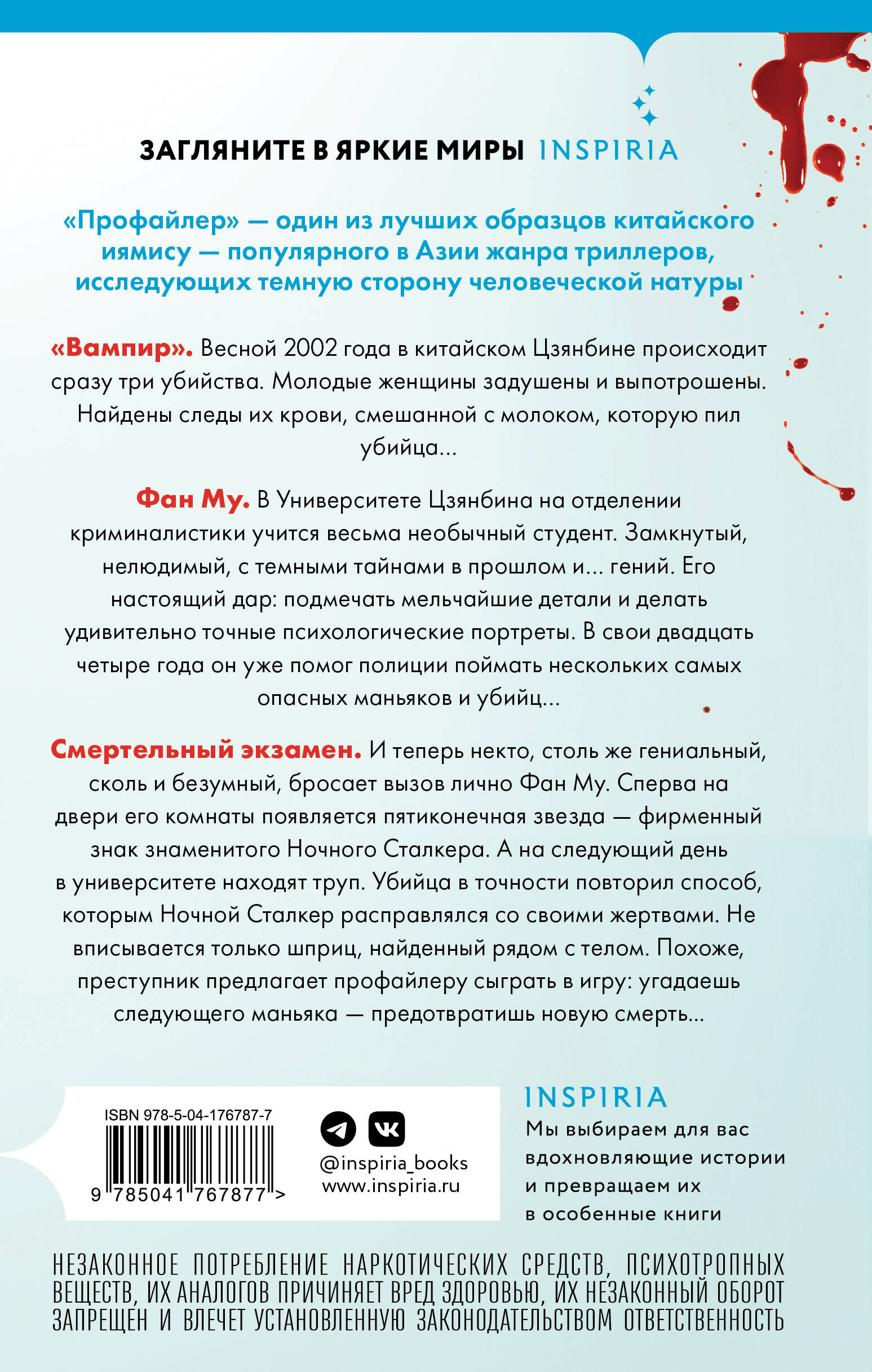 НЕЗАКОННОЕ ПОТРЕБЛЕНИЕ НАРКОТИЧЕСКИХ СРЕДСТВ, ПСИХОТРОПНЫХ ВЕЩЕСТВ, ИХ АНАЛОГОВ ПРИЧИНЯЕТ ВРЕД ЗДОРОВЬЮ, ИХ НЕЗАКОННЫЙ ОБОРОТ ЗАПРЕЩЕН И ВЛЕЧЕТ УСТАНОВЛЕННУЮ ЗАКОНОДАТЕЛЬСТВОМ ОТВЕТСТВЕННОСТЬ. Профайлер. «Вампир». Весной 2002 года в китайском Цзяньбине происходит сразу три убийства. Молодые женщины задушены и выпотрошены. Найдены следы их крови, смешанной с молоком, которую пил убийца… Фан Му. В Университете Цзянбина, на отделении криминалистики учится весьма необычный студент. Замкнутый, нелюдимый, с темными тайнами в прошлом и… гений. Его настоящий дар: подмечать мельчайшие детали и делать удивительно точные психологические портреты. В свои двадцать четыре года он уже помог полиции поймать нескольких самых опасных маньяков и убийц… Смертельный экзамен. И теперь некто столь же гениальный, сколь и безумный, бросает вызов лично Фан Му. Сперва на двери его комнаты появляется пятиконечная звезда - фирменный знак знаменитого Ночного Сталкера. А на следующий день в университете находят труп. Убийца в точности повторил способ, которым Ночной Сталкер расправлялся со своими жертвами. Не вписывается только шприц, найденный рядом с телом. Похоже, преступник предлагает профайлеру сыграть в игру: угадаешь следующего маньяка - предотвратишь новую смерть... «Ящик Скиннера» Профайлер. После окончания университета Фан Му поступает на службу в полицию. Теперь он - профайлер, распутывающий самые сложные преступления… Но однажды его чутье дает осечку. Убийца. Студент Люо Цзяхай задержан за убийство с особой жестокостью. Жертва - учительница, ради карьеры сломавшая жизнь его возлюбленной. Фан Му сочувствует преступнику и даже соглашается выступить в суде свидетелем защиты. Но вскоре подсудимый дерзко сбегает из изолятора. Более того: при этом друг и коллега Фан Му получает очень серьезные травмы - как физические, так и психологические. Психодрама. Чтобы помочь товарищу, профайлер соглашается на участие в психотерапевтических сеансах. Их цель: исцеление через повторное проживание травматического опыта. Но выясняется, что подобная терапия привлекает не только полицию. По городу прокатывается волна убийств, каждое из которых напоминает Фан Му кульминацию психодраматического сеанса. А через некоторое время на месте очередного убийства обнаруживается волос студента Люо Цзяхая… «Клинок молчания» Похищение. Пей Лан, молодая, талантливая кинозвезда пропала во время свидания со своим парнем. Девушка вышла в уборную и не вернулась, а через некоторое время родственникам присылают требование о выкупе и видеокассету, способную разрушить Пей Лан не только карьеру, но и жизнь… Убийство. Пока Фан Му прикладывает свои таланты профайлера, чтобы спасти Пей Лан, случается немыслимое: заместителя комиссара Департамента общественной безопасности Син Чжисена обвиняют в убийстве безоружного человека. Син Чжисен настаивает, что незадолго до этого убитый зарезал молодую женщину, но никаких доказательств его версии найти не удается. Как и тела погибшей. Все улики против него. Приговор к смертной казни - вопрос времени. Невидимая связь. Не желая мириться с несправедливостью, Фан Му берется доказать невиновность старого друга. Он выясняет: убитая женщина существовала. Более того: она была знакома с Пей Лан…| Издательство | ООО "Издательство "Эксмо" |