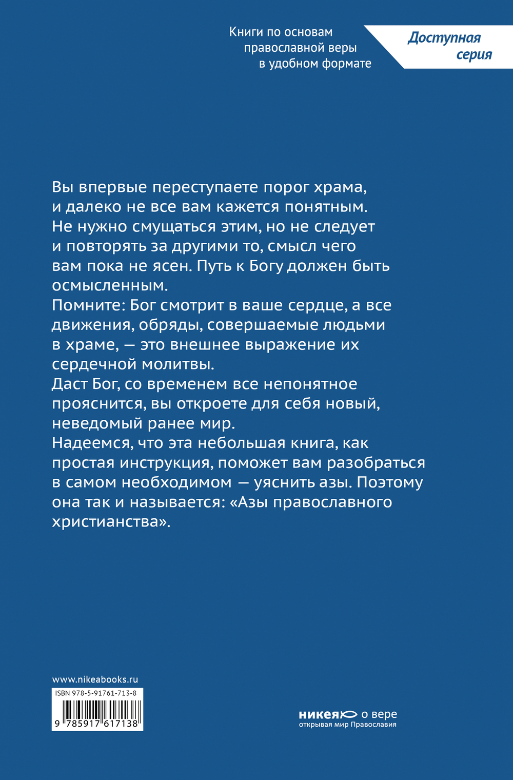 Человеку, впервые переступившему порог храма, многое кажется непонятным. При этом без осмысления всего происходящего в Церкви невозможна подлинно христианская жизнь. В книге "Азы православного христианства" собраны необходимые сведения о храме и богослужении, о таинствах и постах, о роли священника в жизни верующих. Одно из украшений книги - это подборка выдержек из трудов отцов Церкви, философов, священников к каждой главе. Каждая глава начинается с короткой цитаты, выражающей содержание последующей главы. Благодаря этим цитатам, читатели познакомятся с воззрениями Силуана Афонского и Иоанна Кронштадтского, датского философа Сёрена Кьеркегора и основоположника классической философии Иммануила Канта, русского ссыльного религиозного писателя Сергея Фуделя и митрополита, объединившего русских, англичан, немцев - Антония Сурожского.