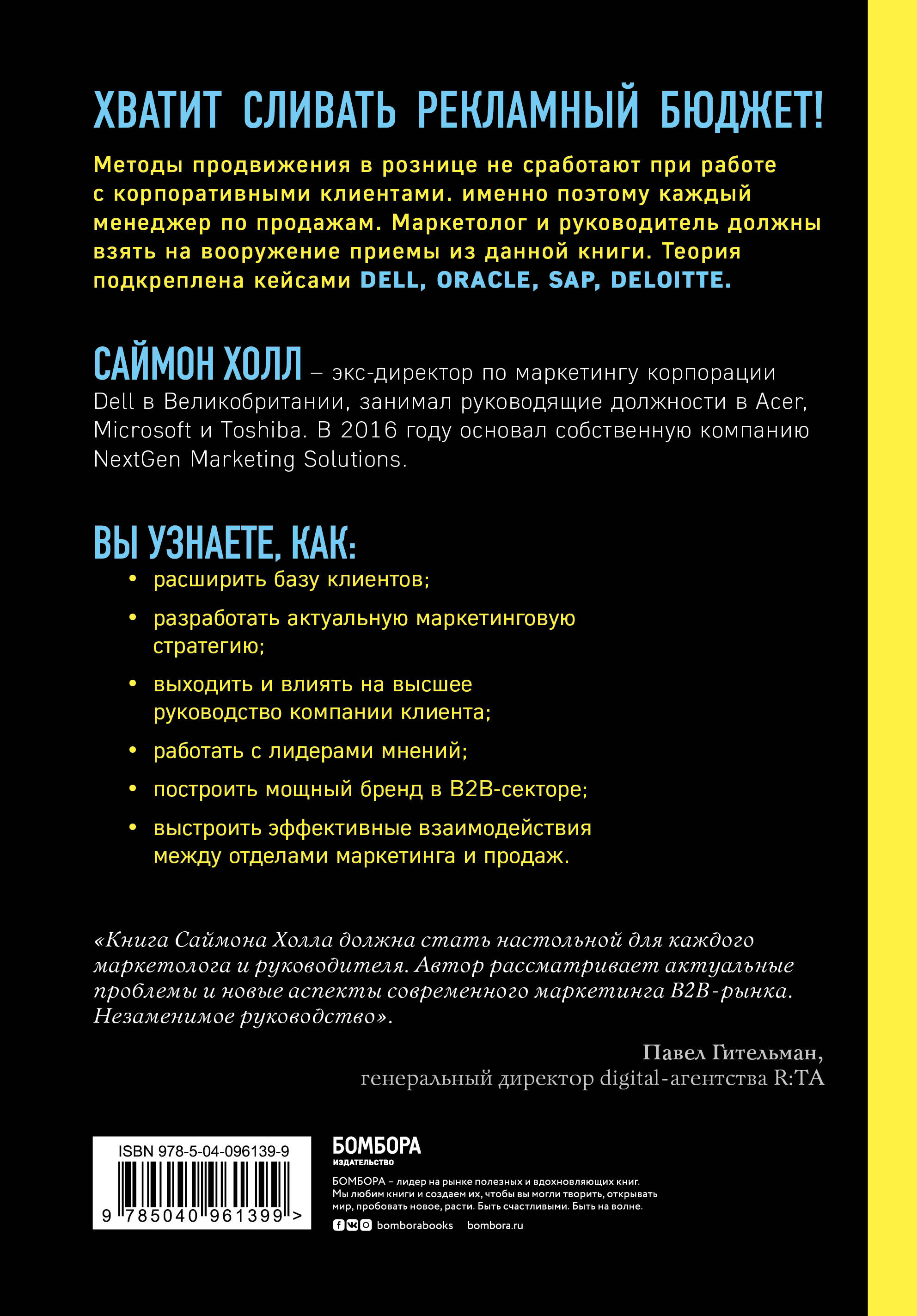 Хватит сливать рекламный бюджет! Методы продвижения в рознице не сработают при работе с корпоративными клиентами. Именно поэтому каждый менеджер по продажам, маркетолог и руководитель должны взять на вооружение приемы из данной книги. Теория подкреплена кейсами Dell, Oracle, SAP, Deloitte. Саймон Холл - экс-директор по маркетингу корпорации Dell в Великобритании, занимал руководящие должности в Acer, Microsoft и Toshiba. В 2016 году основал собственную компанию NextGen Marketing Solutions. Вы узнаете, как: - расширить базу клиентов; - разработать актуальную маркетинговую стратегию; - выходить и влиять на высшее руководство компании клиента; - работать с лидерами мнений; - построить мощный бренд в B2B-секторе; - выстроить эффективные взаимодействия между отделами маркетинга и продаж. ОТЗЫВ ЭКСПЕРТА «Книга Саймона Холла должна стать настольной для каждого маркетолога и руководителя. Автор рассматривает актуальные проблемы и новые аспекты современного маркетинга B2B рынка. Незаменимое руководство». Павел Гительман - генеральный директор digital-агентства R:TA| Издательство | ООО "Издательство "Эксмо" |