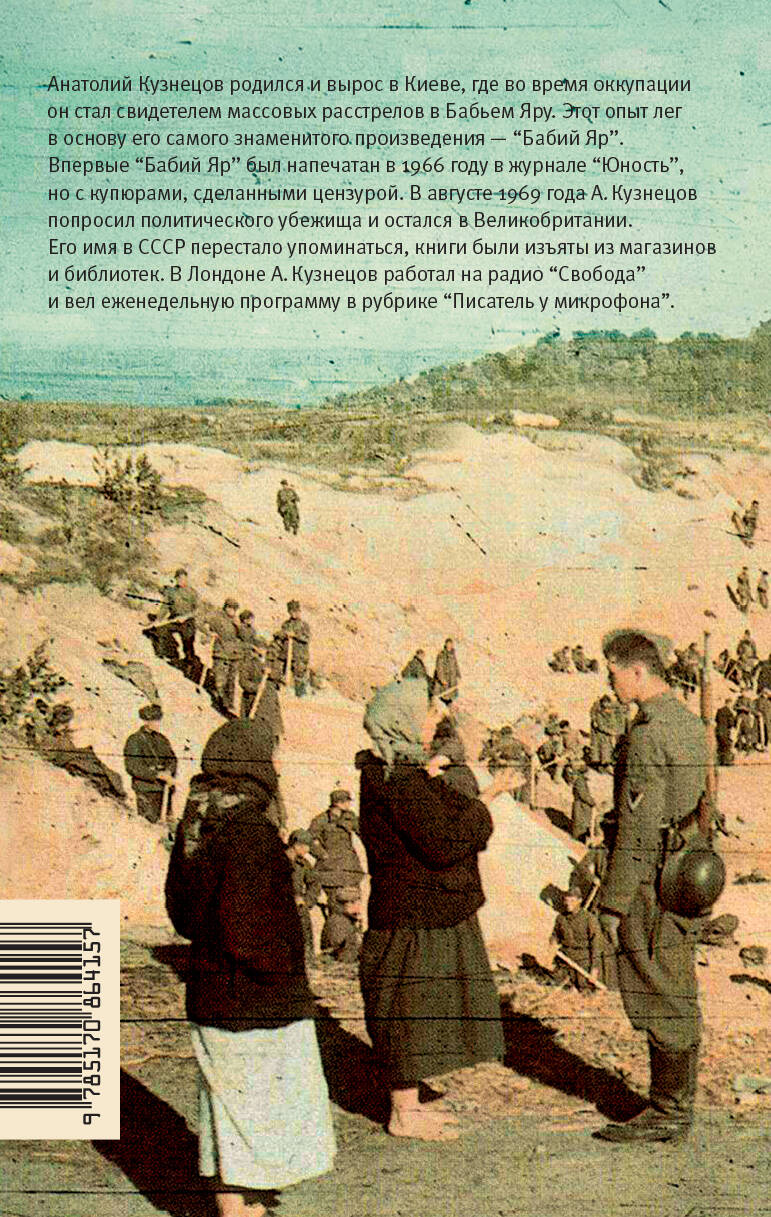 Эта книга - полная авторская версия знаменитого документального романа "Ба­бий Яр" об уничтожении еврейского населения Киева осенью 1941 года. Анатолий Кузнецов, тогда подросток, сам был свидетелем расстрелов киевских евреев, мно­го общался с людьми, пережившими катастрофу, собирал воспоминания других современников и очевидцев. Впервые его роман был опубликован в журнале "Юность" в 1966 году, и даже тогда, несмотря на многочисленные и грубые цен­зурные сокращения, произвел эффект разорвавшейся бомбы - так до Кузнецова про Холокост не осмеливался писать никто. Однако путь подлинной истории Ба­бьего Яра к читателю оказался долгим и трудным. В 1969 году Анатолий Кузнецов тайно вывез полную версию романа в Англию, где попросил политического убе­жища. Через год "Бабий Яр" был опубликован на Западе в авторской редакции, од­нако российский читатель смог познакомиться с текстом без купюр лишь после пе­рестройки.