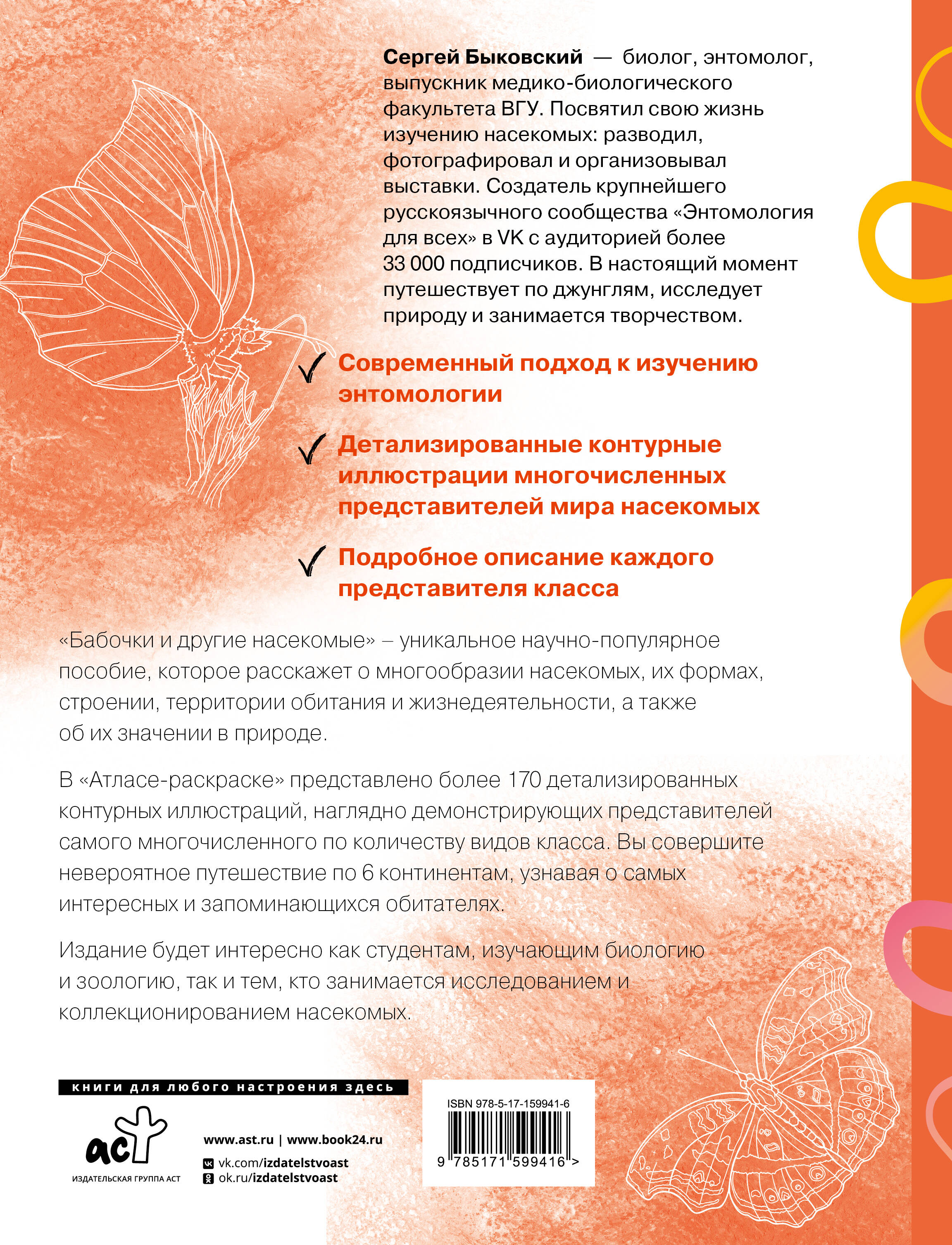 Сергей Быковский - биолог, энтомолог, выпускник медико-биологического факультета ВГУ. Посвятил свою жизнь изучению насекомых: разводил, фотографировал и организовывал выставки. Создатель крупнейшего русскоязычного сообщества "Энтомология для всех" в VK с аудиторией более 33 000 подписчиков. В настоящий момент путешествует по джунглям, исследует природу и занимается творчеством. - Современный подход к изучению энтомологии; - Детализированные контурные иллюстрации многочисленных представителей мира насекомых; - Подробное описание каждого представителя класса. "Бабочки и другие насекомые" - уникальное научно-популярное пособие, которое расскажет о многообразии насекомых, их формах, строении, территории обитания и жизнедеятельности, а также об их значении в природе. В "Атласе-раскраске" представлено более 170 детализированных контурных иллюстраций, наглядно демонстрирующих представителей самого многочисленного по количеству видов класса. Вы совершите невероятное путешествие по 6 континентам, узнавая о самых интересных и запоминающихся обитателях. Издание будет интересно как студентам, изучающим биологию и зоологию, так и тем, кто занимается исследованием и коллекционированием насекомых.| Издательство | Издательство "АСТ" |