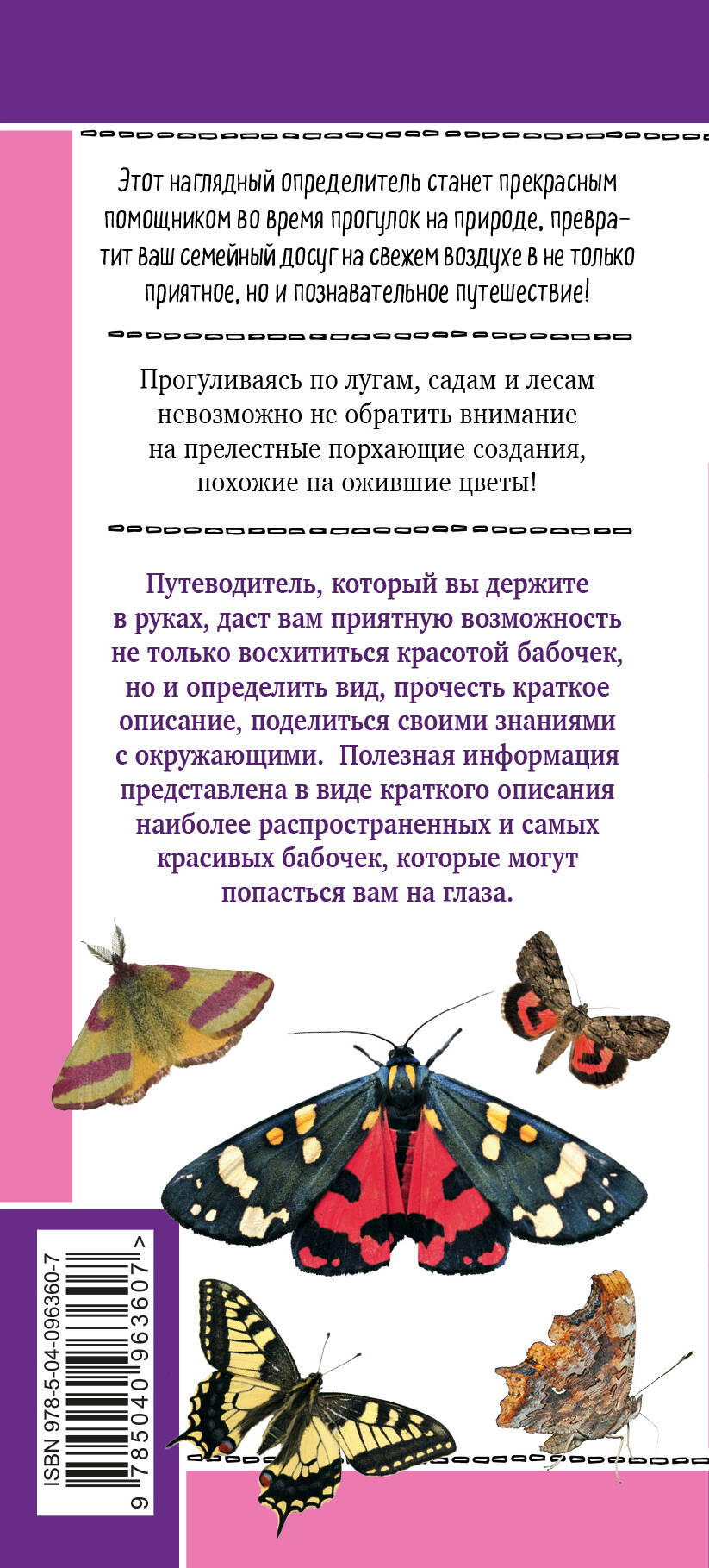 Карманный определитель- незаменимый помощник каждого любителя родной природы. Его удобно брать с собой в лес и на прогулку! Удобный наглядный гид познакомит вас с 60 видами самых красивых бабочек, обитающих в средней полосе России. Путеводитель даст вам приятную возможность восхититься красотой бабочек, определить вид, место обитания, время лёта. Прочтите краткое описание и поделитесь своими знаниями с окружающими. Оригинальная конструкция обложки: клапаны-раскладушки с двух сторон обложки, на которых представлены цветные фотографии всех упоминающихся в книге видов.| Издательство | Эксмо |