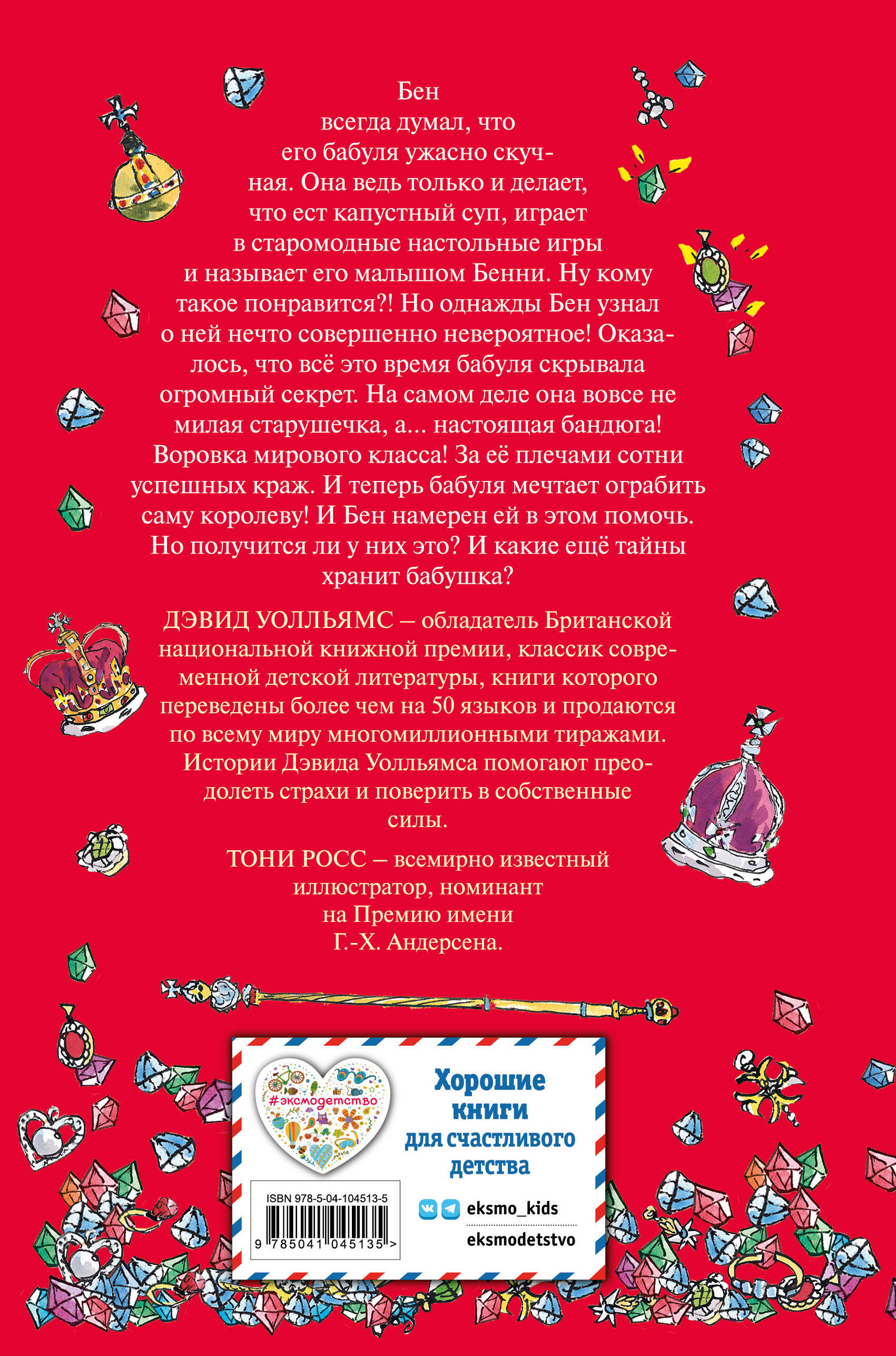 Проводить пятничный вечер у бабули - самое скучное занятие на свете! Так всегда думал Бен. Ему приходилось играть в старомодные настольные игры, есть капустный суп и слушать скучные бабушкины истории. Но однажды всё изменилось. А всё потому, что Бен узнал невероятный секрет! Оказывается, его бабуля вовсе не скучная старушка, а настоящая звезда криминального мира! За её плечами сотни ограблений! Она смелая, хитрая и клёвая! А ещё она мечтает ограбить саму королеву! Бен решает, что обязательно должен ей помочь. Получится ли у них осуществить этот дерзкий план? И какие ещё тайны скрывает бабуля? Дэвид Уолльямс - классик современной детской литературы, книги которого продаются по всему миру многомиллионными тиражами. Истории Дэвида Уолльямса помогают преодолеть страхи и поверить в собственные силы. В книге много иллюстраций, которые сделают чтение ещё интереснее. Их создал Тони Росс - номинант на Премию им. Г.-Х. Андерсена. Бестселлер Amazon и New York Times.| Издательство | ООО "Издательство "Эксмо" |
