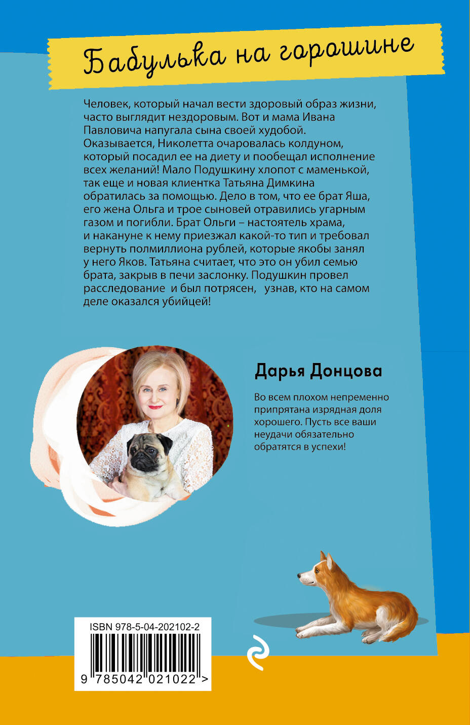 Дарья Донцова - самый популярный и востребованный автор в нашей стране, любимица миллионов читателей. В России продано более 200 миллионов экземпляров ее книг. Ее творчество наполняет сердца и души светом, оптимизмом, радостью, уверенностью в завтрашнем дне! Человек, который начал вести здоровый образ жизни, часто выглядит нездоровым. Вот и мама Ивана Павловича напугала сына своей худобой. Оказывается, Николетта очаровалась колдуном, который посадил ее на диету и пообещал исполнение всех желаний! Мало Подушкину хлопот с маменькой, так еще и новая клиентка Татьяна Димкина обратилась за помощью. Дело в том, что ее брат Яша, его жена Ольга и трое сыновей отравились угарным газом и погибли. Брат Ольги - настоятель храма, и накануне к нему приезжал какой-то тип и требовал вернуть полмиллиона рублей, которые якобы занял у него Яков. Татьяна считает, что это он убил семью брата, закрыв в печи заслонку. Подушкин провел расследование и был потрясен узнав, кто на самом деле оказался убийцей! «Донцова невероятная работяга! Я не знаю ни одного другого писателя, который столько работал бы. Я отношусь к ней с уважением, как к образцу писательского трудолюбия. Женщины нуждаются в психологической поддержке и получают ее от Донцовой. Я и сама в свое время прочла несколько романов Донцовой. Ее читают очень разные люди. И очень занятые бизнес-леди, чтобы на время выключить голову, и домохозяйки, у которых есть перерыв 15-20 минут между отвести-забрать детей». - Галина Юзефович, литературный критик
