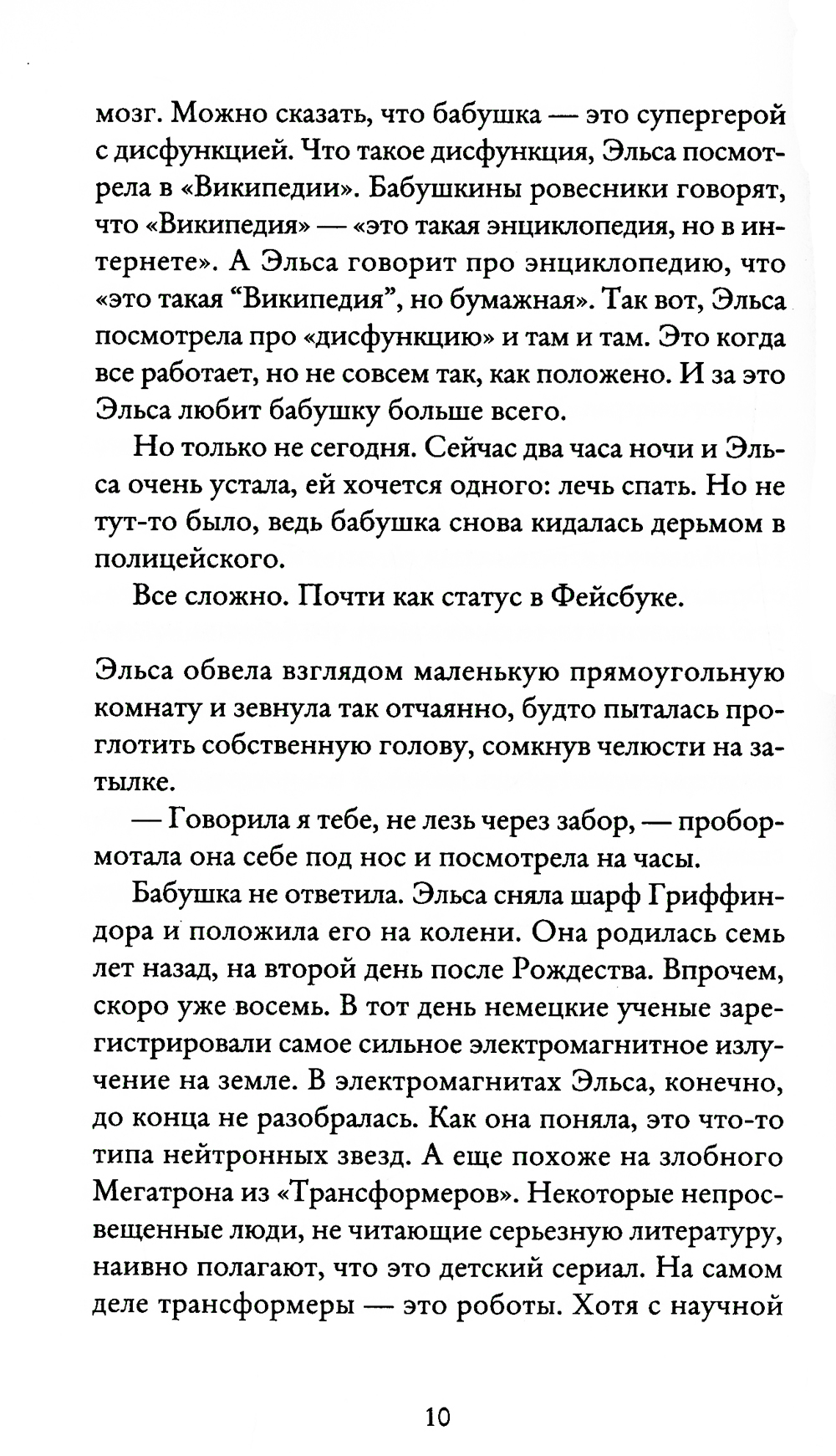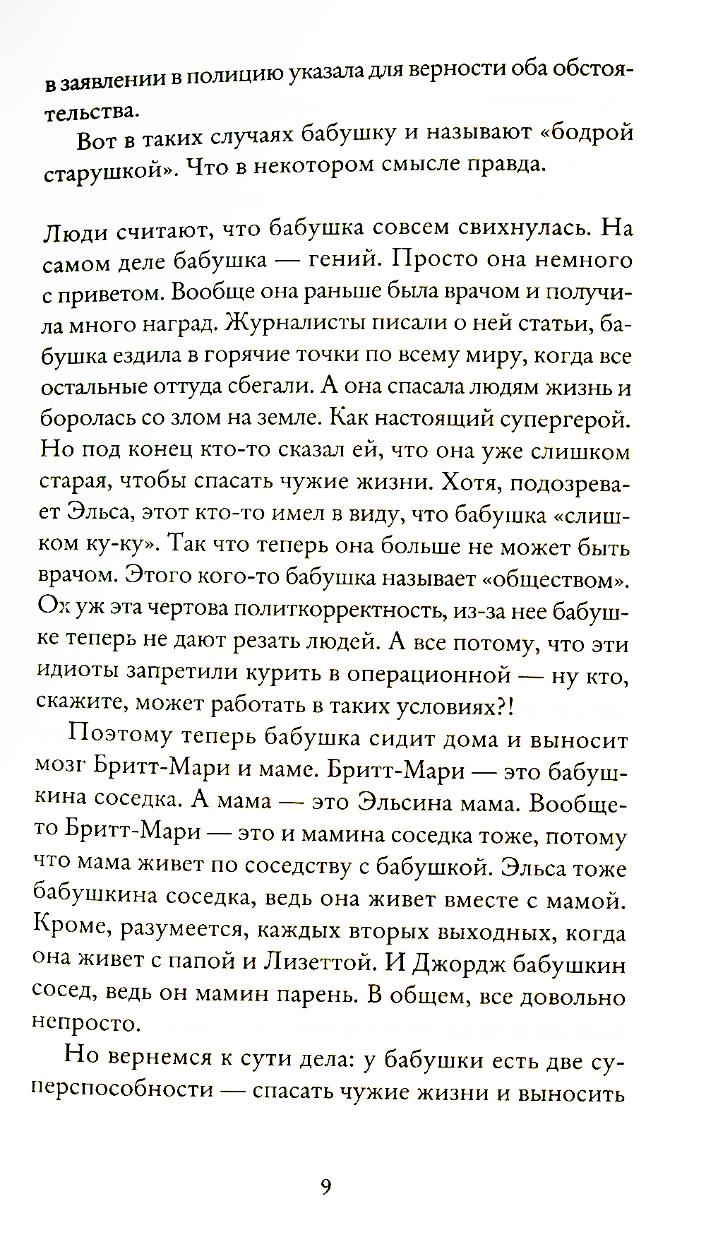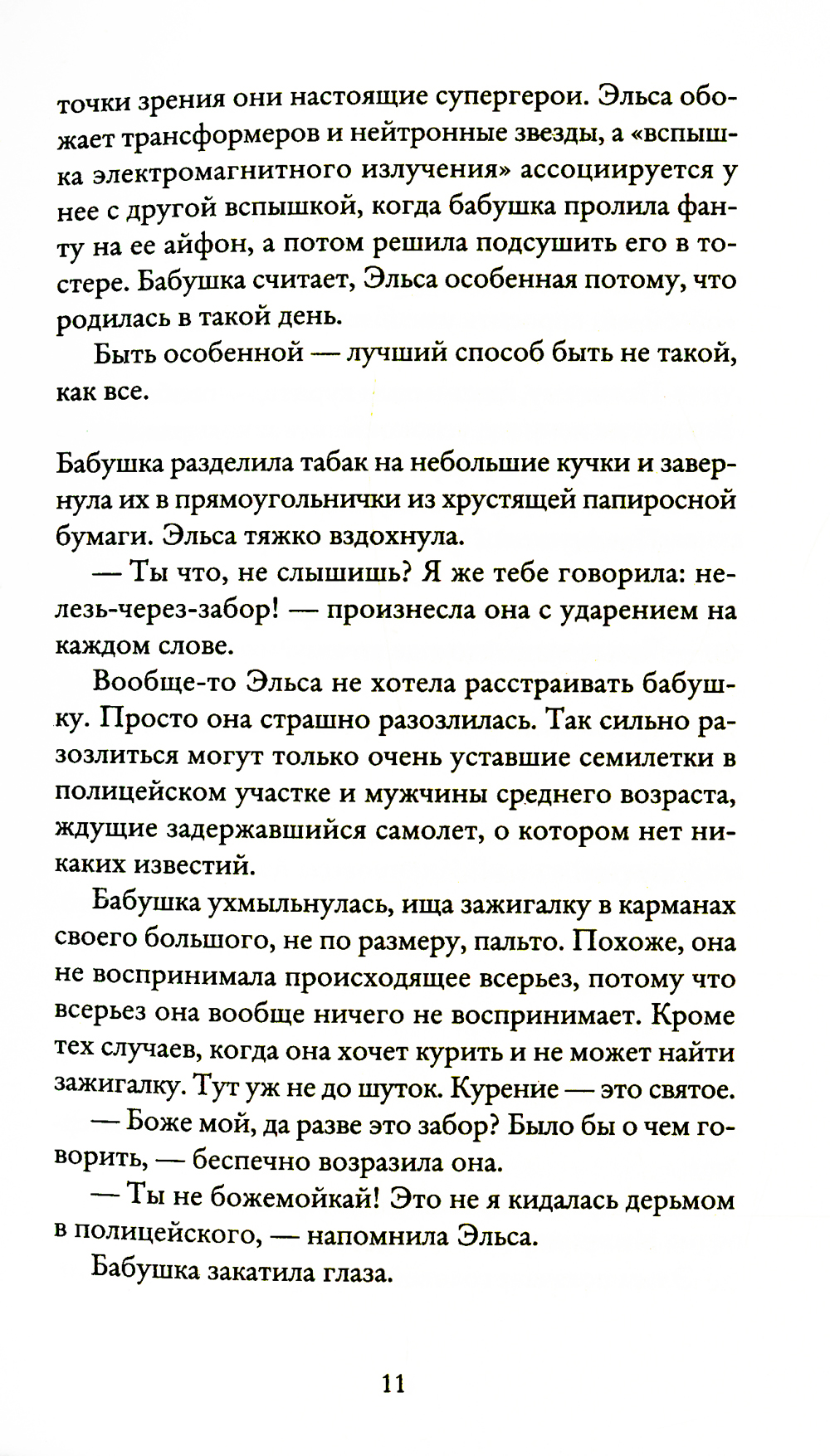 Девочке Эльсе почти восемь, а ее бабушке скоро семьдесят восемь. Одни называют бабушку эксцентричной, другие - «бодрой старушкой», третьи считают, что она просто съехала с катушек. Но для Эльсы бабушка - супергерой и самая лучшая подруга. Потому что всегда защищает внучку, независимо от обстоятельств. И потому что понимает ее как никто другой. Когда бабушка умирает, после нее остаются письма, которые Эльса должна доставить адресатам. Выполняя бабушкино поручение, она узнает много нового о необыкновенной жизни своего супергероя, сразится с реальным, а не сказочным злом, и обретет настоящих друзей.| Издательство | Синдбад |
