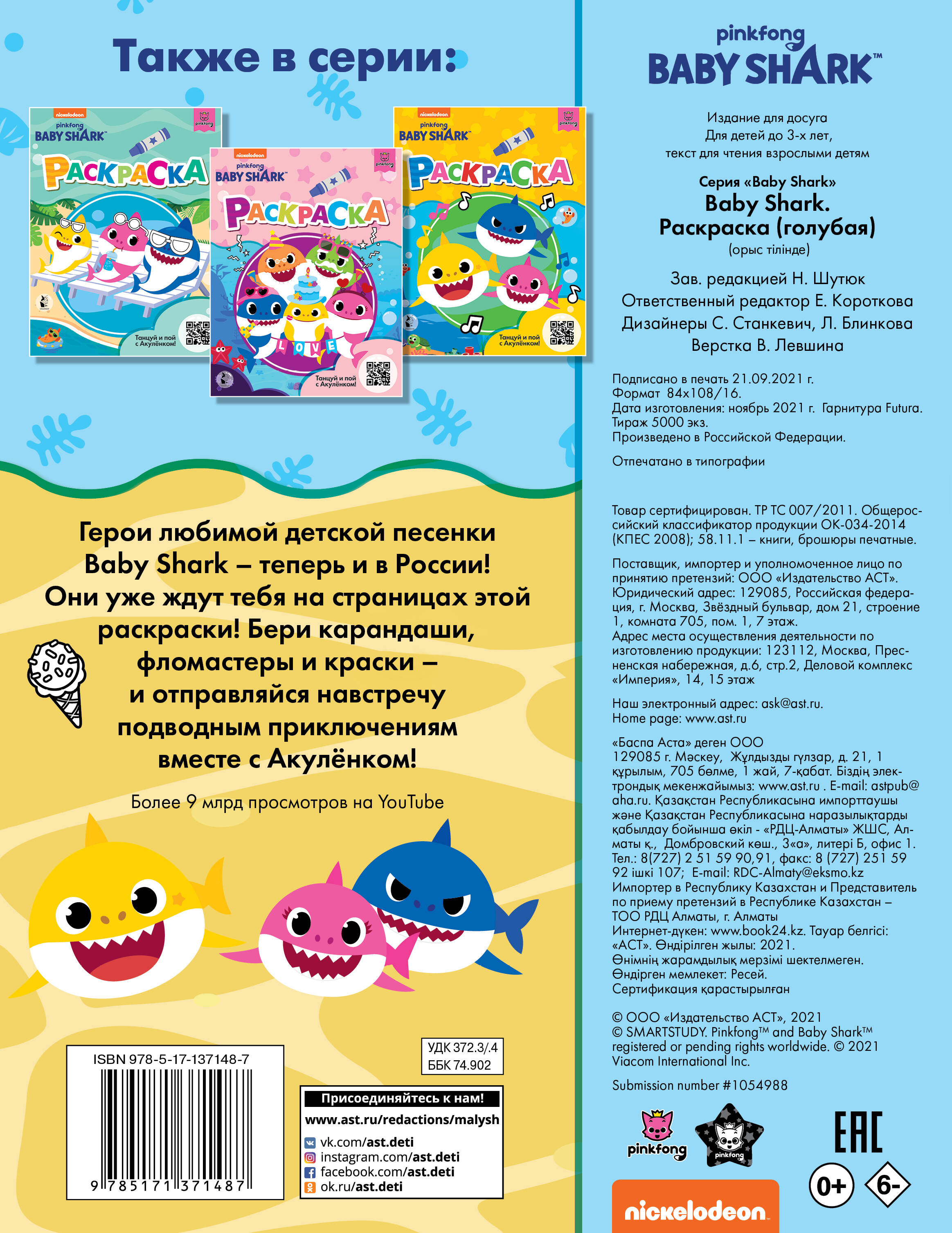 Герои любимой детской песенки Baby Shark - теперь и в России! Они уже ждут тебя на страницах этой раскраски! Бери карандаши, фломастеры и краски - и отправляйся навстречу подводным приключениям вместе Акулёнком!| Издательство | Издательство "АСТ" |