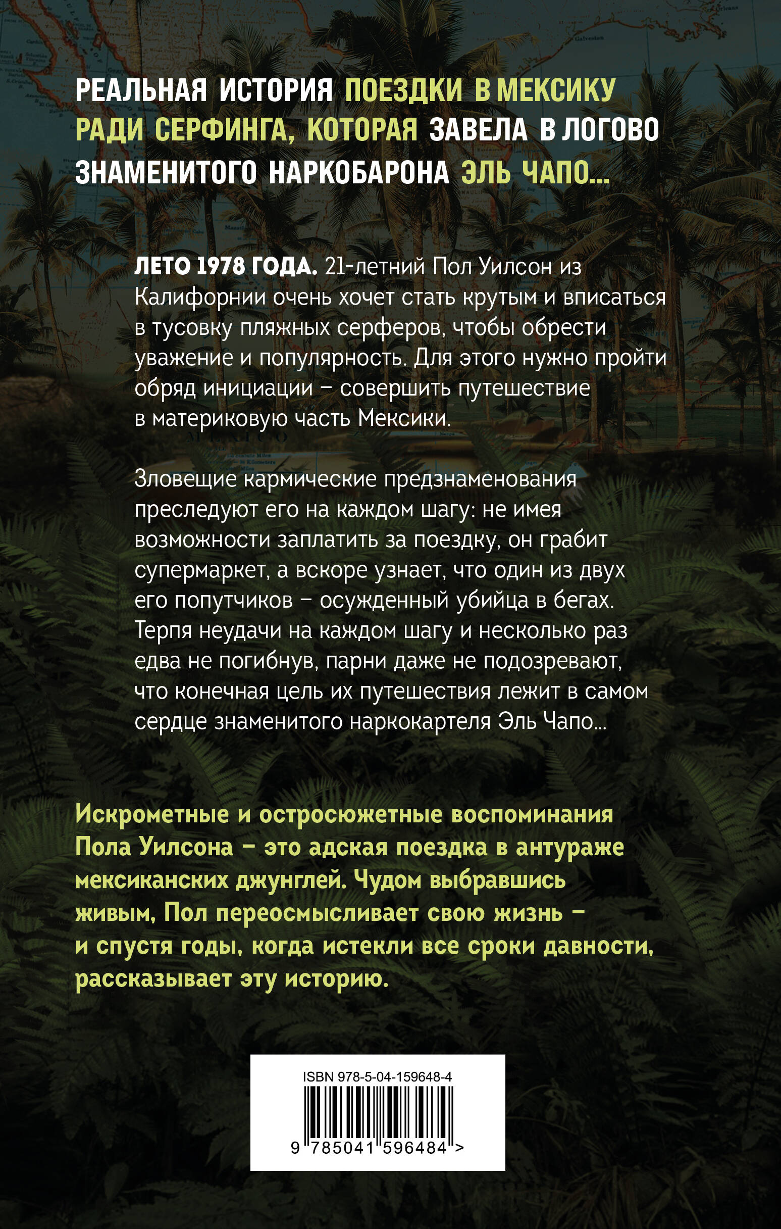 БЕСТСЕЛЛЕР AMAZON О ПУТЕШЕСТВИЯХ № 1! Увлекательные мемуары о катастрофической поездке в Мексику ради серфинга, которая случайно завела в логово знаменитого наркобарона Эль Чапо… Лето 1978 года. 21-летний Пол Уилсон из Калифорнии очень хочет стать крутым и вписаться в тусовку пляжных серферов, чтобы обрести уважение среди парней и успех у девушек. Для этого нужно пройти обряд инициации - совершить путешествие в материковую часть Мексики ради серфинга. Зловещие кармические предзнаменования преследуют его на каждом шагу: не имея возможности заплатить за поездку, он грабит супермаркет, а вскоре узнает, что один из его попутчиков - осужденный убийца в бегах, а другой - беспринципный подонок. Более того, парни даже не подозревают, что конечная цель их путешествия лежит в самом сердце знаменитого наркокартеля Эль Чапо… Искрометные и остросюжетные, воспоминания Пола Уилсона - это адская поездка, самые настоящие «Страх и ненависть в Латинской Америке» в антураже мексиканских джунглей. Несколько раз едва не погибнув, терпя неудачу на всех этапах своей поездки, Пол переосмысливает свою жизнь - и спустя годы, когда истек срок давности, рассказывает эту историю. ------------------------------ «Живое и восторженное повествование. Эта увлекательная книга описывает ушедшую эпоху». - Kirkus Review «Пол Уилсон написал увлекательные мемуары. Его непростые приключения, попутчики, случайные люди, которых он встречает на пути, - все они невероятно хорошо описаны… в том числе и парень по имени Хоакин Эль Чапо Гусман». - Discovery «Настолько правдиво, что хочется, чтобы это было вымыслом! Эта книга - громкий смех сквозь слезы над трудностями взрослой жизни». - The Prairies Book Review| Издательство | Эксмо |