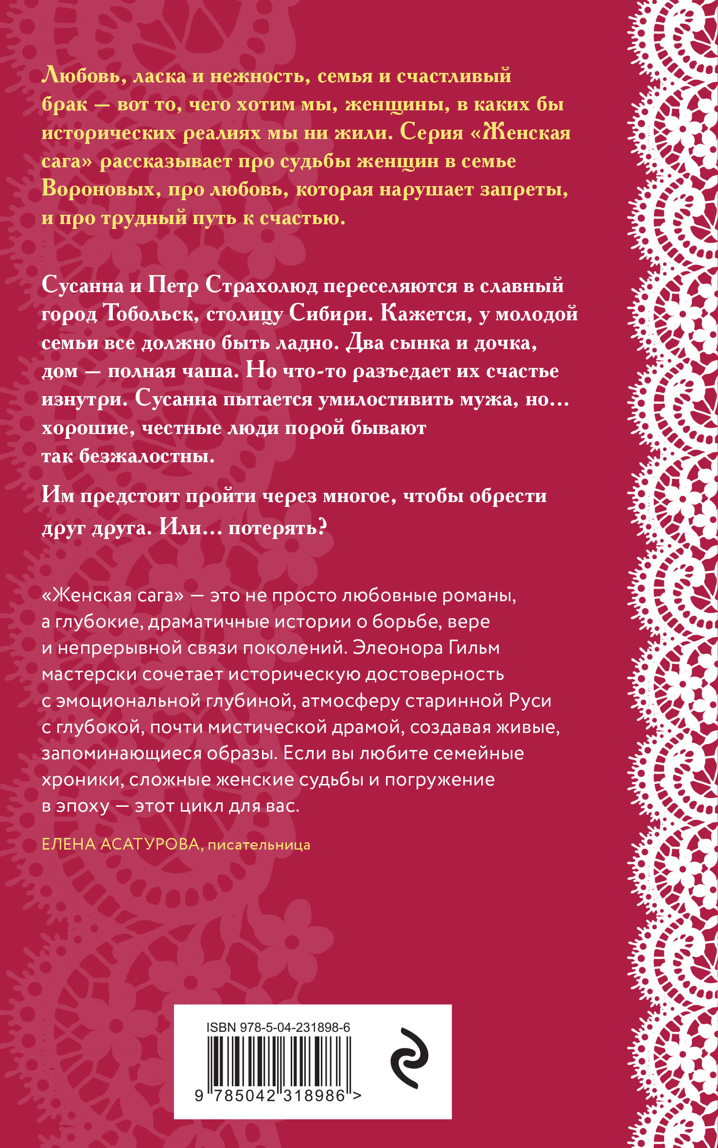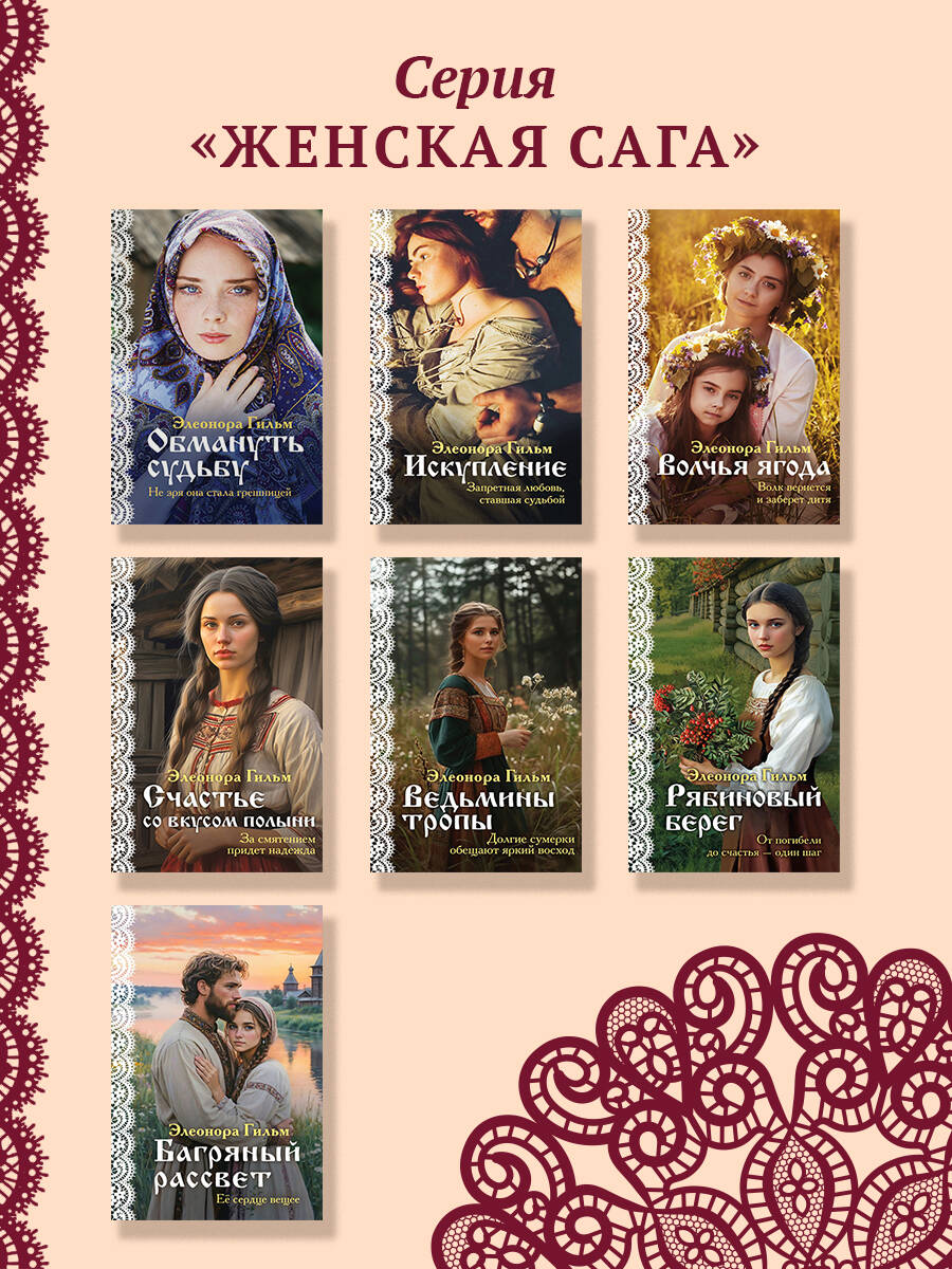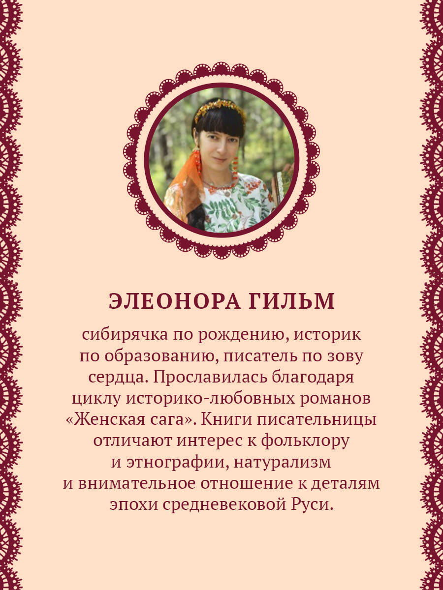 Сусанна и Пётр Страхолюд переселяются в славный город Тобольск, столицу Сибири. Кажется, у молодой семьи все должно быть ладно. Два сынка и дочка, дом - полная чаша. Но что-то разъедает их счастье изнутри. Сусанна пытается умилостивить мужа, но... Хорошие, честные люди порой бывают так безжалостны. Им предстоит пройти через многое, чтобы обрести друг друга. Или… потерять? Лишь бы он остался жив... С циклом «Женская сага» история оживает и становится реальностью! Вы ощутите, каково это: оказаться в России XVI-XVII века, косить траву, прясть при свете лучины, думать о грехе и страшиться расплаты. Задумаетесь, как непросто жить без электричества и медицины. Вдохнете запахи колдовских трав и закутаетесь в невероятную сагу Элеоноры Гильм, как в душегрею. Судьбы женщин нескольких поколений - в дивных книгах о любви и предательстве, искушении и непростой дороге к счастью. Урал и Сибирь, Москва и Крымское ханство - путешествие будет незабываемым. Читайте в цикле «Женская сага»: 1. «Обмануть судьбу» 2. «Искупление» 3. «Волчья ягода» 4. «Счастье со вкусом полыни» 5. «Ведьмины тропы» 6. «Рябиновый берег» 7. «Багряный рассвет» Продолжение следует…| Издательство | ООО "Издательство "Эксмо" |