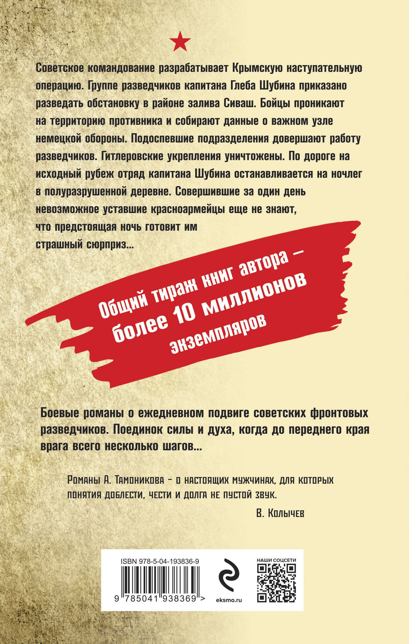 Боевые романы о ежедневном подвиге советских фронтовых разведчиков. Поединок силы и духа, когда до переднего края врага всего несколько шагов. Подробности жестоких боев, о которых не рассказывают даже ветераны - участники тех событий. Советское командование разрабатывает Крымскую наступательную операцию. Группе разведчиков капитана Глеба Шубина приказано разведать обстановку в районе залива Сиваш. Бойцы проникают на территорию противника и собирают данные о важном узле немецкой обороны. Подоспевшие подразделения довершают работу разведчиков. Гитлеровские укрепления уничтожены. По дороге на исходный рубеж отряд капитана Шубина останавливается на ночлег в полуразрушенной деревне. Совершившие за один день невозможное уставшие красноармейцы еще не знают, что предстоящая ночь готовит им страшный сюрприз… Общий тираж книг автора - более 10 миллионов экземпляров.| Издательство | ООО "Издательство "Эксмо" |